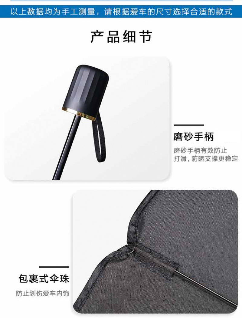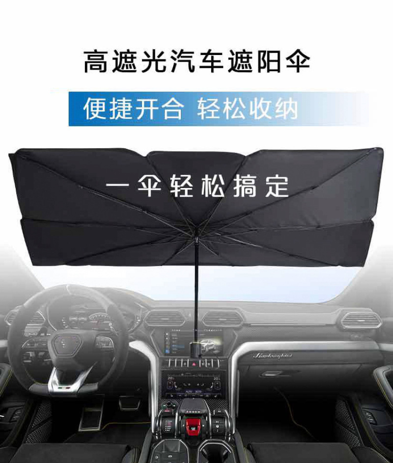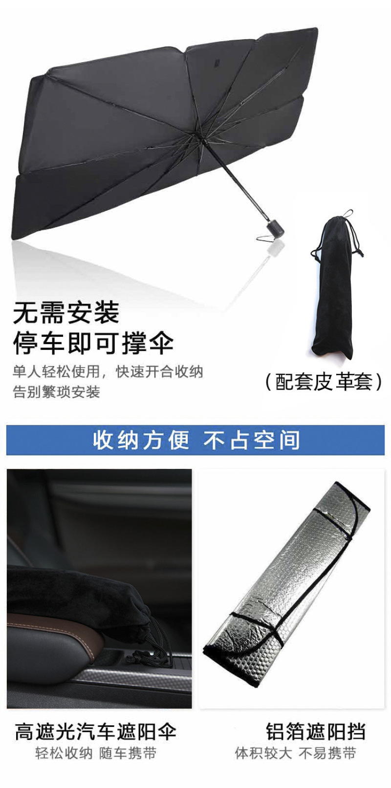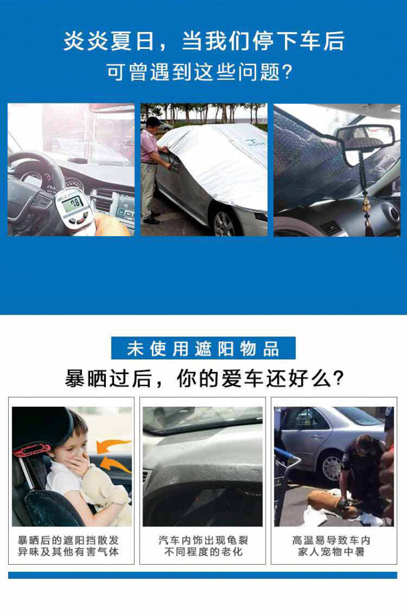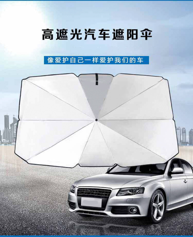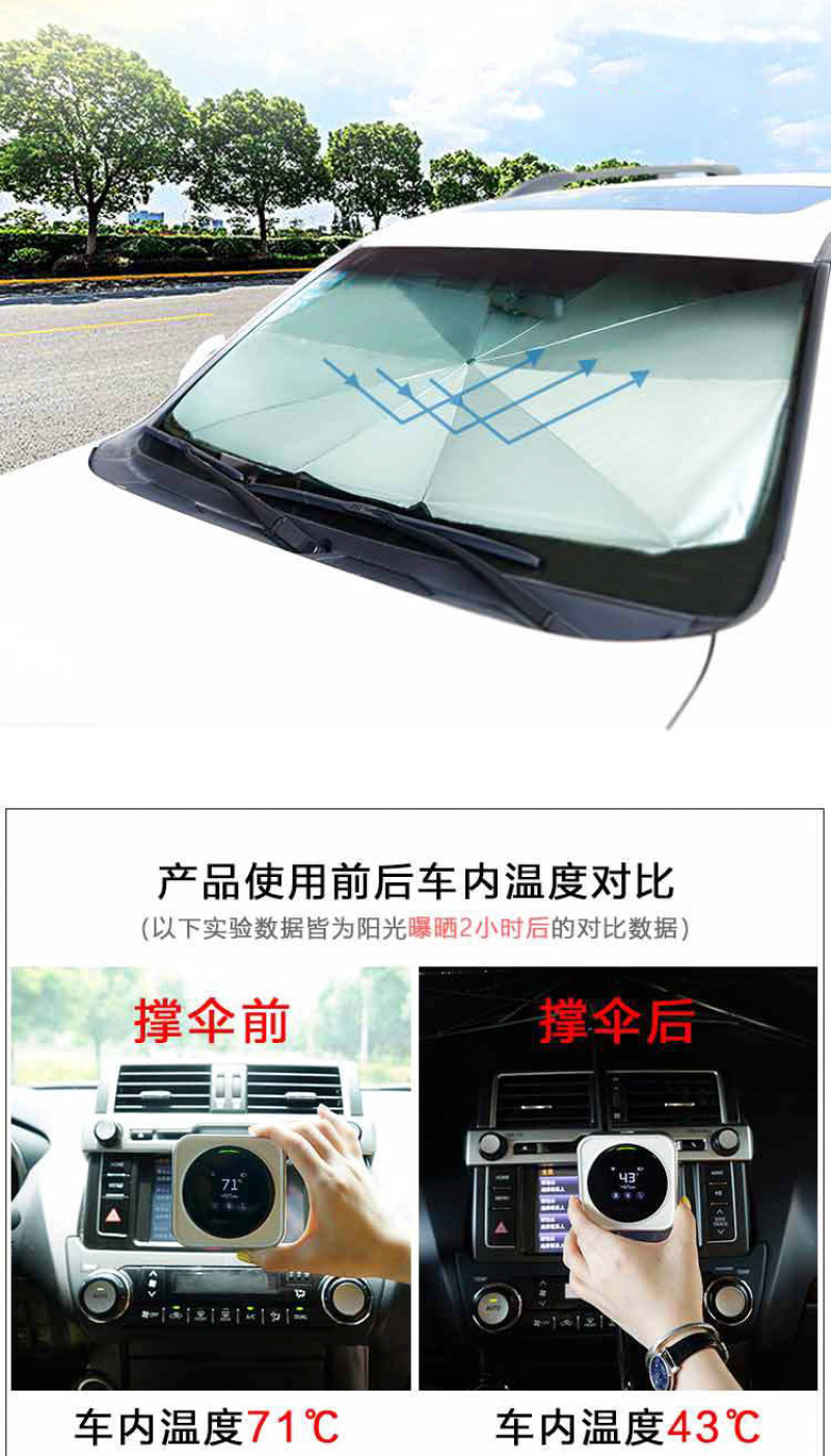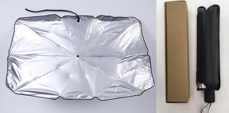 【产品名称】:汽车前档遮阳伞 【产品重量】:约0.55kg 【产品尺寸】:大号79*145cm 小号65*125cm 【产品材质】:碰击布+钛银胶 【产品包装】:牛皮纸盒 【包装尺寸】:38*8*7cm 【产品颜色】:银色