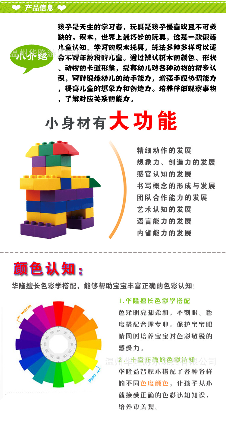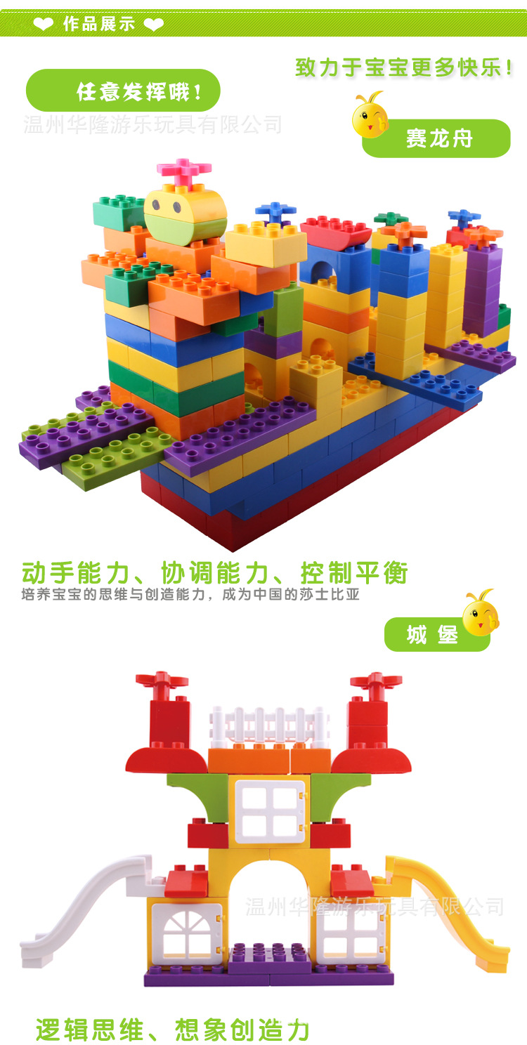 货号:HL6331 品名:华隆城堡乐园积木 材料:塑料 包装:塑料环保盒 特大盒6盒/箱 大盒36盒/箱 3-12岁,是孩子智力发展的重要时期!锻炼其想象力,创造力对其今后的发展而言是十分必要的。DIY积木无疑是锻炼孩子想象力和创造力的不二选择! 公司介绍 华隆玩具公司是专业研发、生产、销售儿童游乐玩具的企业。以“诚信、务实、创新、高效”为企业的经营理念,设有新产品研发中心,营销服务中心,并不断引进创新的技术与生产设备工艺,致力于打造儿童游乐玩具产业的文化创意品牌。 公司通过ISO9001:2008质量管理体系认证与职业健康安全管理体系认证,产品通过美国玩具安全ASTME963-08认证,欧盟玩具安全标准CE认证,国家强制性产品3C认证等,并荣获“永嘉县名牌商标”认证企业,浙江省工商企业A级"守合同重信用”单位称号,产品销往于全国各大教育早教机构及幼儿园、学校、儿童游乐场、住宅社区,出口于欧美、东南亚、北美等国家和地区。 公司始终坚持以质量为品牌的基础,以市场为品牌的动力,以设计为品牌的灵魂,在创新中求发展,在挑战中突破努力塑造“华隆”新形象,不断完善管理机制,精心营造企业文化精神,励精图治,团结奋斗,为宏伟目标奋勇迈进。 华隆!伴天下儿童共成长! 所有产品厂家直销!产品通过3C、SGS、EN-71、ASTM认证。可进入商场、店铺、游乐场、各种儿童娱乐场所。 ********************************************************************************************************************************************************************************************************************************* **********************************************************************************************************************************************************************************************************************************