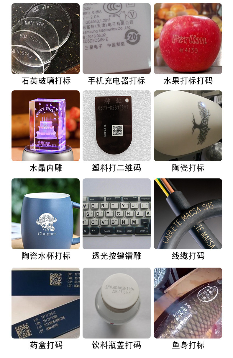 适用材料:可以雕刻各类金属,合金,不锈钢及 各类非金属,木头皮革亚克力布料纸张礼盒等,更可雕刻透明亚克力和玻璃制品。