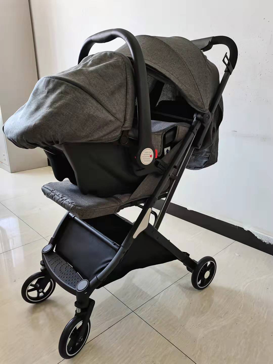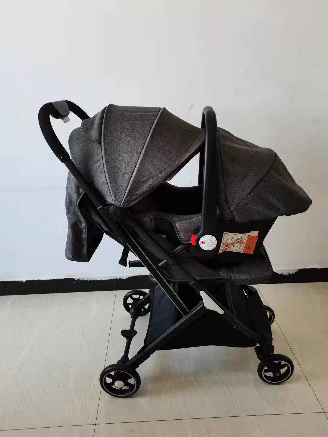 婴儿车:单手一键折叠; 三折,体积小,重量轻,收纳方便,装柜量多. 可上飞机, 居家,外出,旅行一辆车足矣. 五点式安全带; 可躺,可做; 超级减震,舒适又安全。 环保布料,塑胶件,喷漆等,宝宝健康、安全,妈妈安心无忧。 汽车座椅:既可做摇篮,轻松哄睡,快乐玩耍; 又可做汽车安全座椅:方便,安全,舒适。宝宝熟睡时,也能轻松把宝宝提回家,不用打扰宝宝正常睡眠。