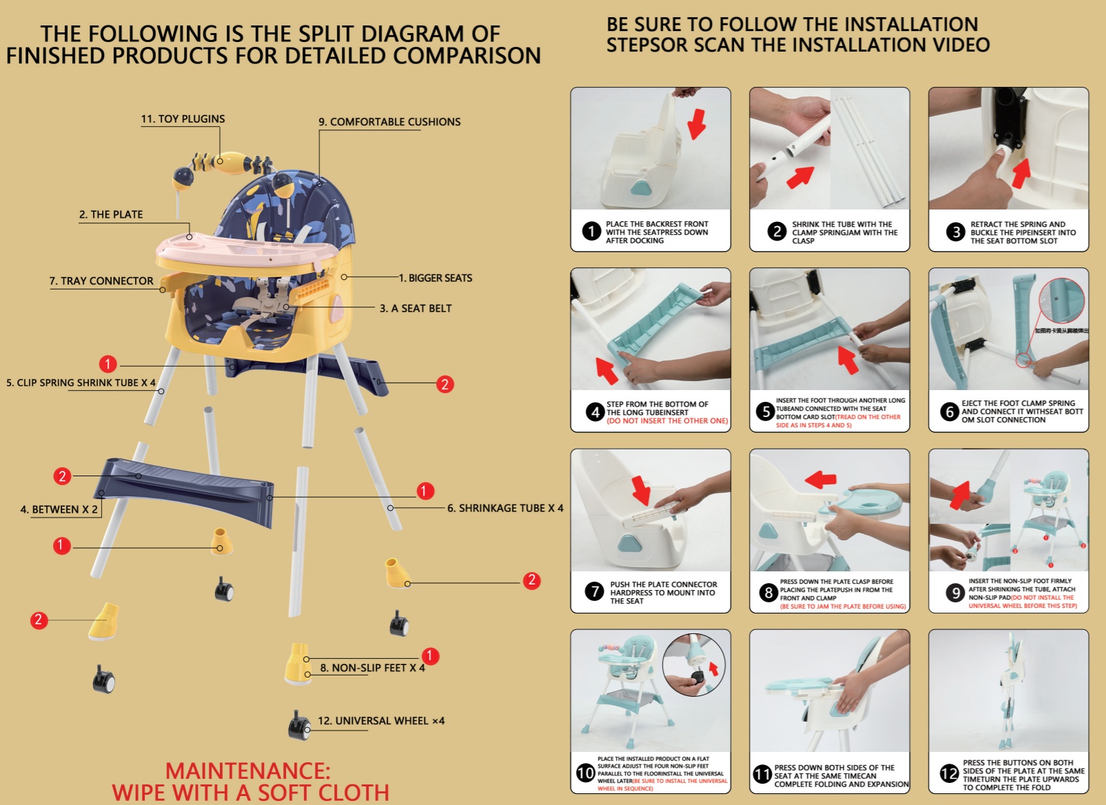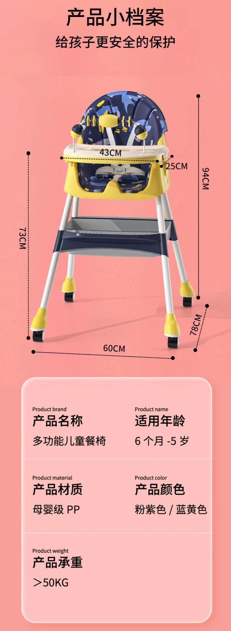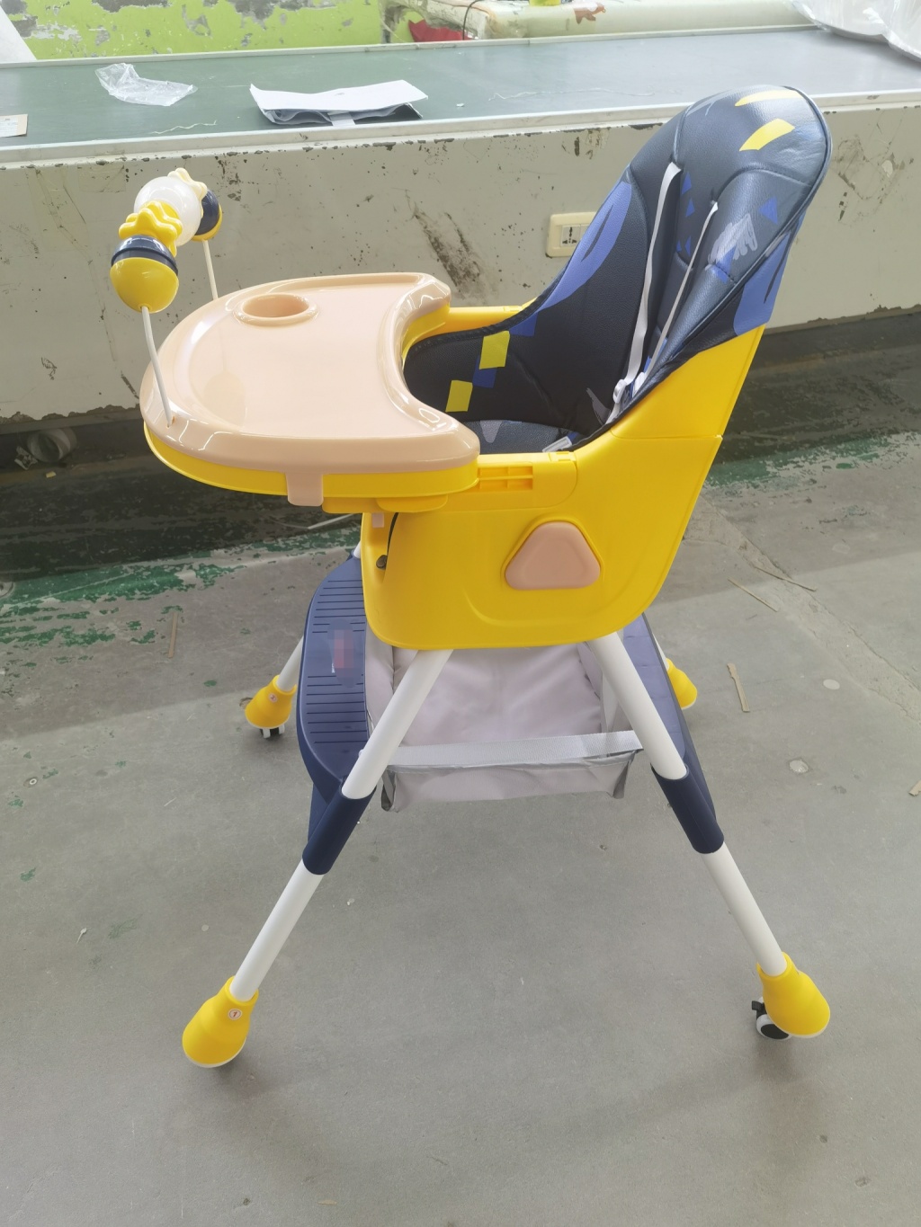 多功能婴儿餐椅 材质: 1.高碳钢餐椅架,大三角结构,更稳固,更安全。 2.婴儿级塑料餐椅壳,外加优质海绵皮革座椅套,脏了,非常容易清洗,擦拭。多年使用后,始终如新。 3.五点式安全带,宝宝安全,妈妈更放心。 4. 带玩具架,给宝宝带来更多乐趣。 5. 带万向静音轮,可以推宝宝去不同的房间,方便妈妈一边劳动一边照看宝宝。 功能: 1.高度可调节,可当婴儿椅,可当婴儿矮餐桌,也可调高,与成人餐桌拼接吃饭, 方便照看宝宝。 2.餐盘可根据孩子胖瘦,年龄大小调节合适的档位。 3.双层餐盘,一层吃饭,一层玩耍。 4.多种颜色的皮质座套,不仅美观,而且,容易清洗,擦拭,长时间使用后,始终如新。 5.加宽加大脚踏,宝宝小脚不悬空,更舒适,更安全。 6.有EN证书 7.可提供样品, 需要付费. 定制样品3-10天. 装柜量: 40HQ: 1425台 包装:1台/箱 交期:12-20天(根据订单数量具体确定交货时间) 可零售,可批发,可批量贴牌定做,欢迎感兴趣的朋友们咨询购买, 量大价格从优 注意: 1. 新疆,西藏,青海,内蒙古及其他极偏远地区,不含在免运费里,如想购买,请先联系客服咨询运费,后下单。 2. 香港,台湾,海南等地区不含在免运费里,如想购买,请先联系客服咨询运费,后下单。