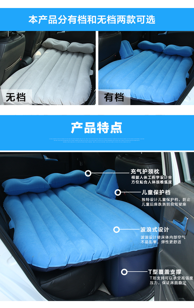 名称:车载充气床 气垫床 材料:植绒 适用车型:五座汽车通用(后桥特别高及微小型不能用) 用途: 车载 户外 游玩