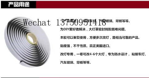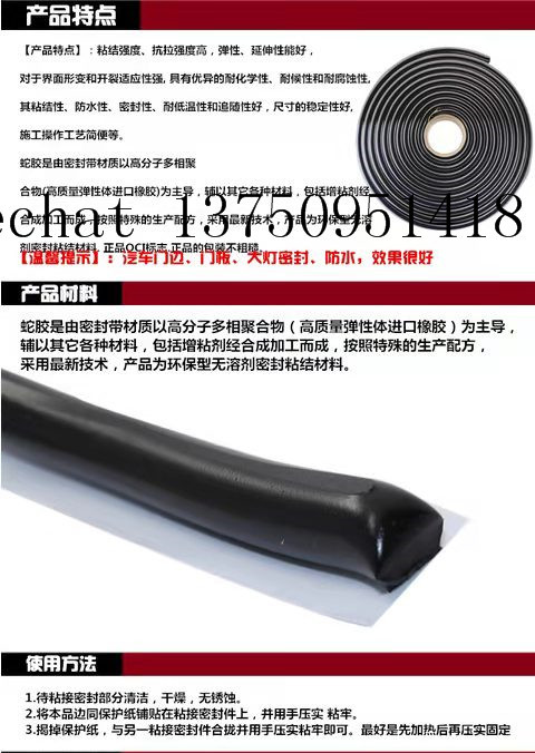 「产品名称」 蛇胶 密封胶 防水胶 【温馨提示】 汽车门边 门板 大灯密封胶 防水胶 效果很好 【产品用途】 改灯专用,一卷可改3-4个大灯,专为防水设计。 粘接车灯、汽车玻璃、背板、车门、门板等等。