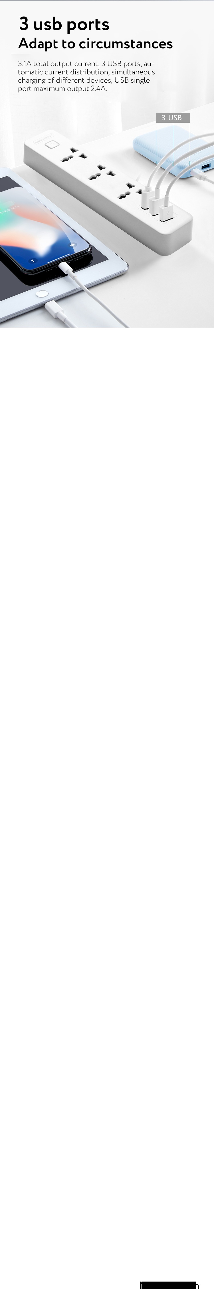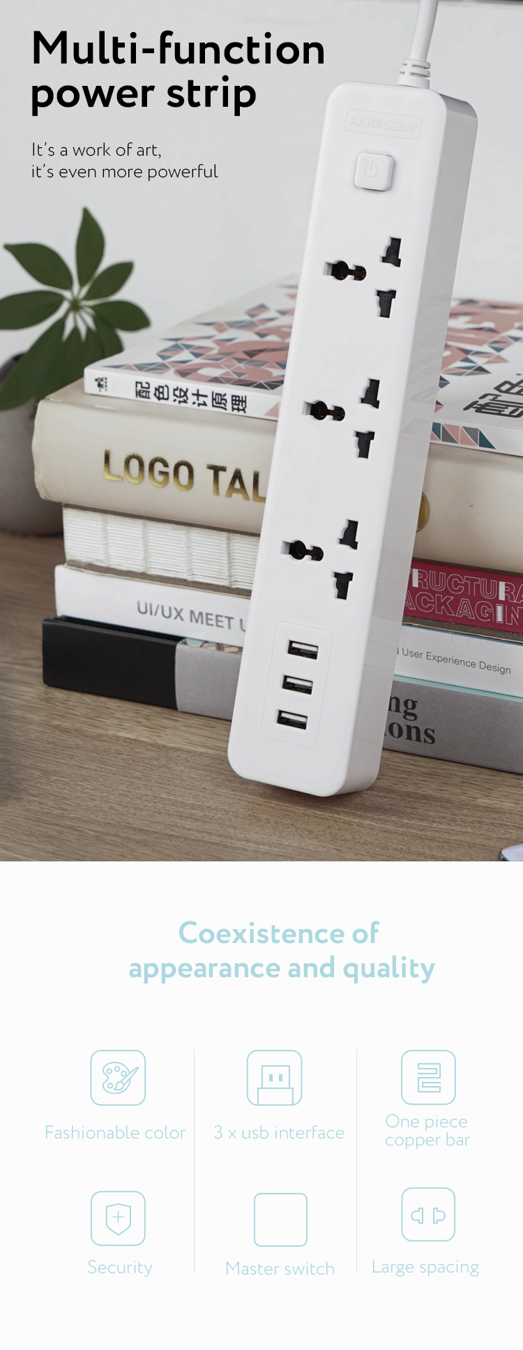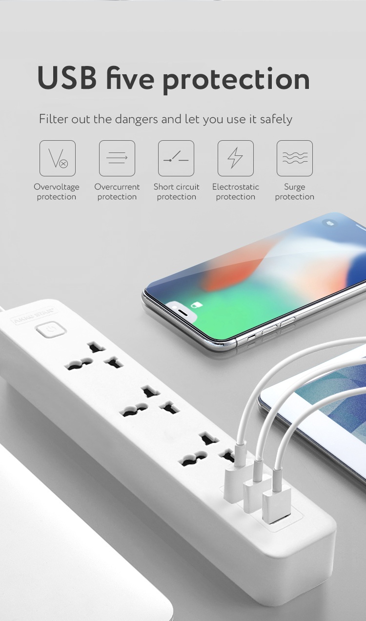 Akkostar abre tres enchufes multifuncionales de 3 metros 3usb con luz, todos los enchufes de cobre 2500w