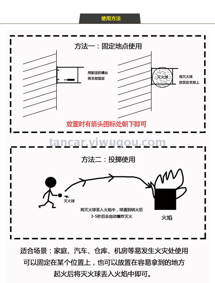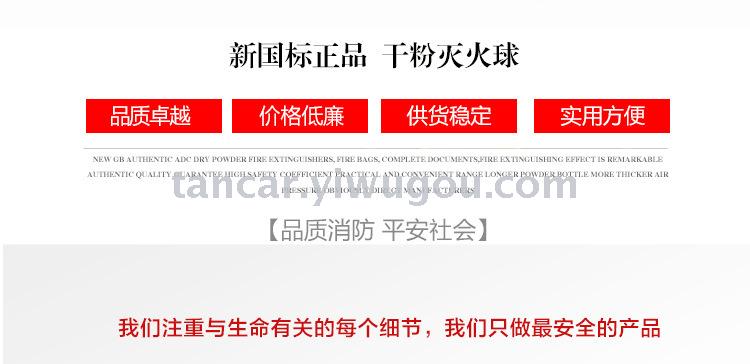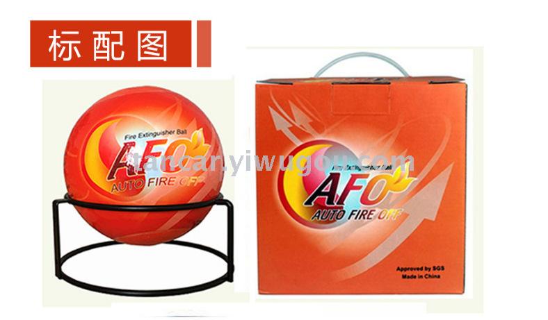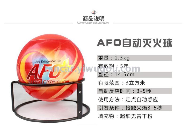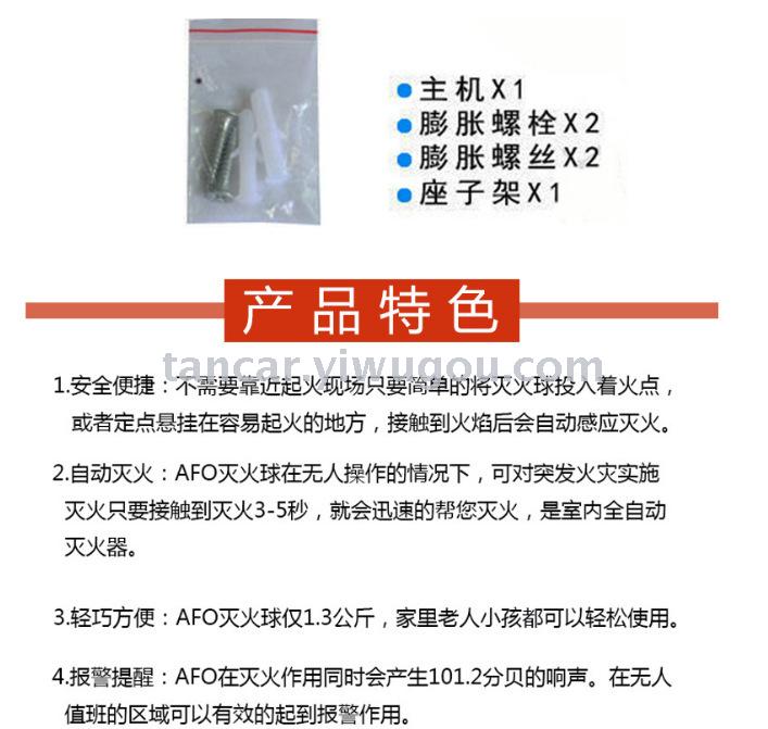 AFO全自动灭火球产品特色 1.轻巧美观使用简易:重量超轻,仅1.3公斤,连家中的老人及小孩都能轻易使用,是室内全自动装饰型灭火器。 2.紧急手动灭火不需靠近起火现场:只要将AFO全自动灭火球投入或滚入起火现场,只要接触到火焰3-5秒自动帮您灭火。再也不需要靠近起火现场,安全可靠快速。 3.无人值守全自动灭火无须操作:将AFO悬挂或定点装置在容易起火的地方,如厨房炉火旁、抽油烟机上方、瓦斯桶上方、电视机旁、电脑上方、工厂中易电线走火的地方或设备或易燃的化学物品旁、公共营业场所、饭店、餐厅、旅馆、医院、加油站、甚至是车子里。。。只要接触到火焰3-5秒就自动帮您灭火,达到无人值守即可自动灭火的目的。 4.充当警报器:AFO全自动灭火球引爆时,会发出产生101.2分贝巨大声响可充当警报器,可警告周围和附近的人,自动告知火灾,自动实施灭火。 5.环保无毒不具杀伤力:AFO是用对人类及环境完全无害的材料所制成(纳米级ABC干粉),同时使用引信引燃爆破技术,作用时的力量皆经过极精密的计算,使在引爆时,完全不具杀伤力,即使是在短距离内均不构成任何伤害和污染。因AFO是球状,在受到球体中心膨破力时,球体受力较为平均,故能将球体内的灭火干粉均匀爆撒开,使其达到灭火效果。干粉失效后还可以当做化肥进行回收再利用。 6.操作简易安装方便:可完全DIY,产品包装附加一个铁架及钢钉,将铁架放在平面上或钉在墙壁上悬挂后,将AFO全自动灭火球置于铁架上,即可完成自动灭火设备。 7.全年无休无需维护:AFO全自动灭火球是您全年无休的全自动灭火装置-是室内全自动装饰型灭火器,5年保固不用更换,免保养及维修。