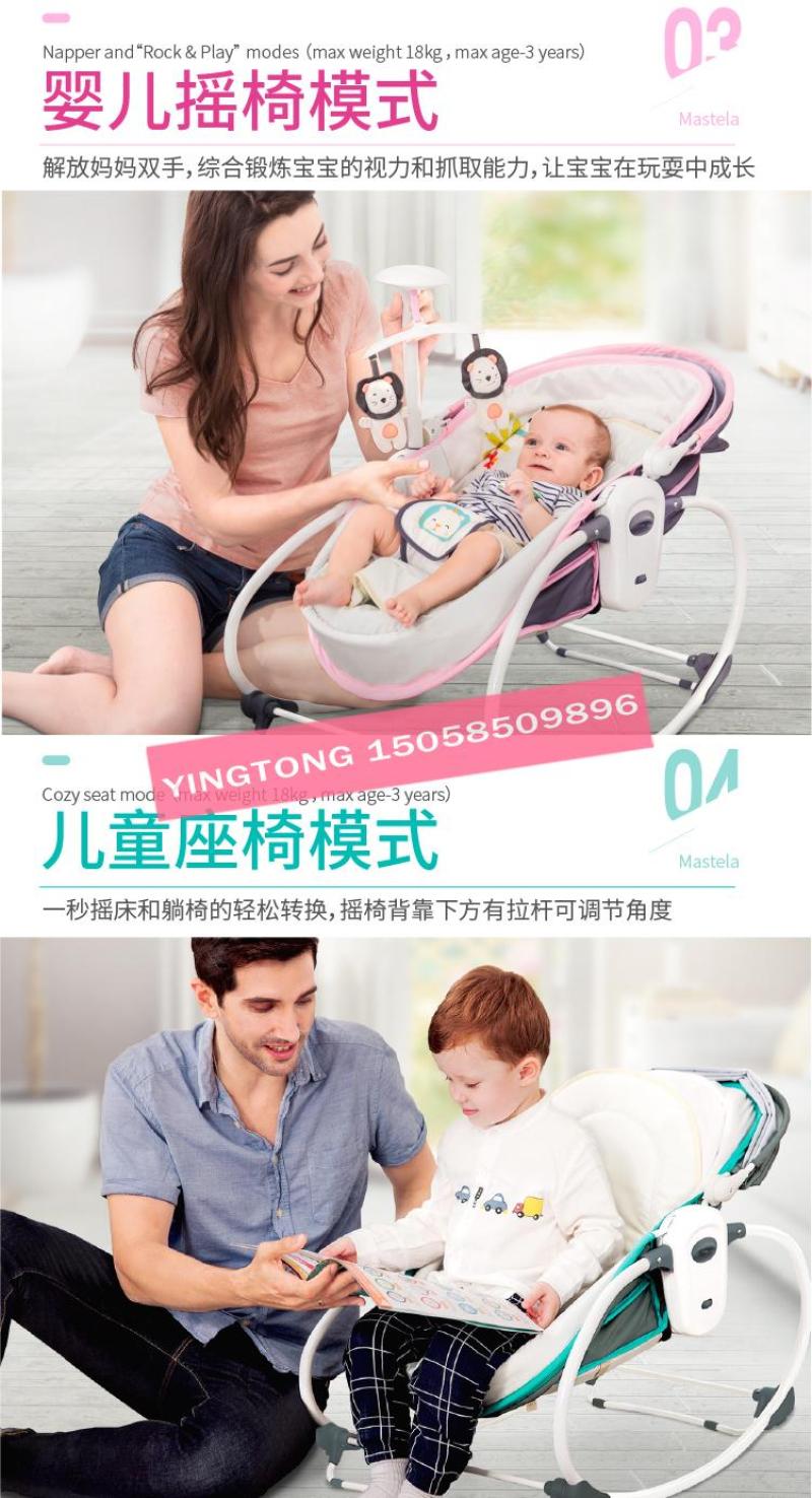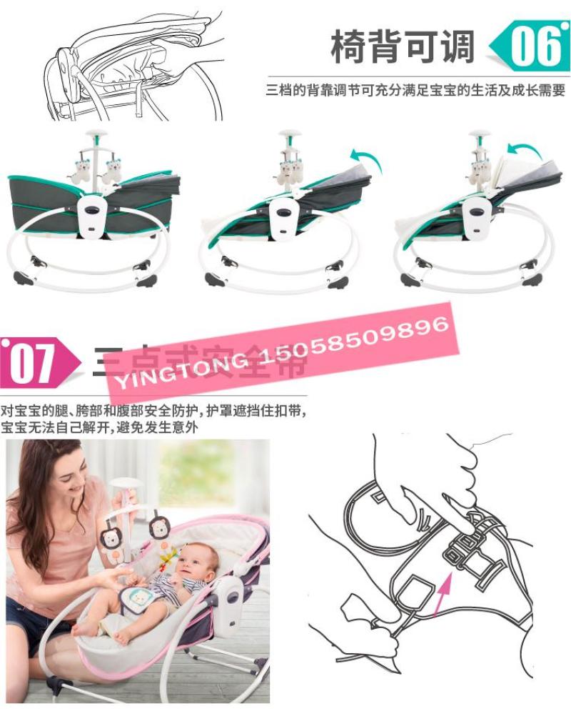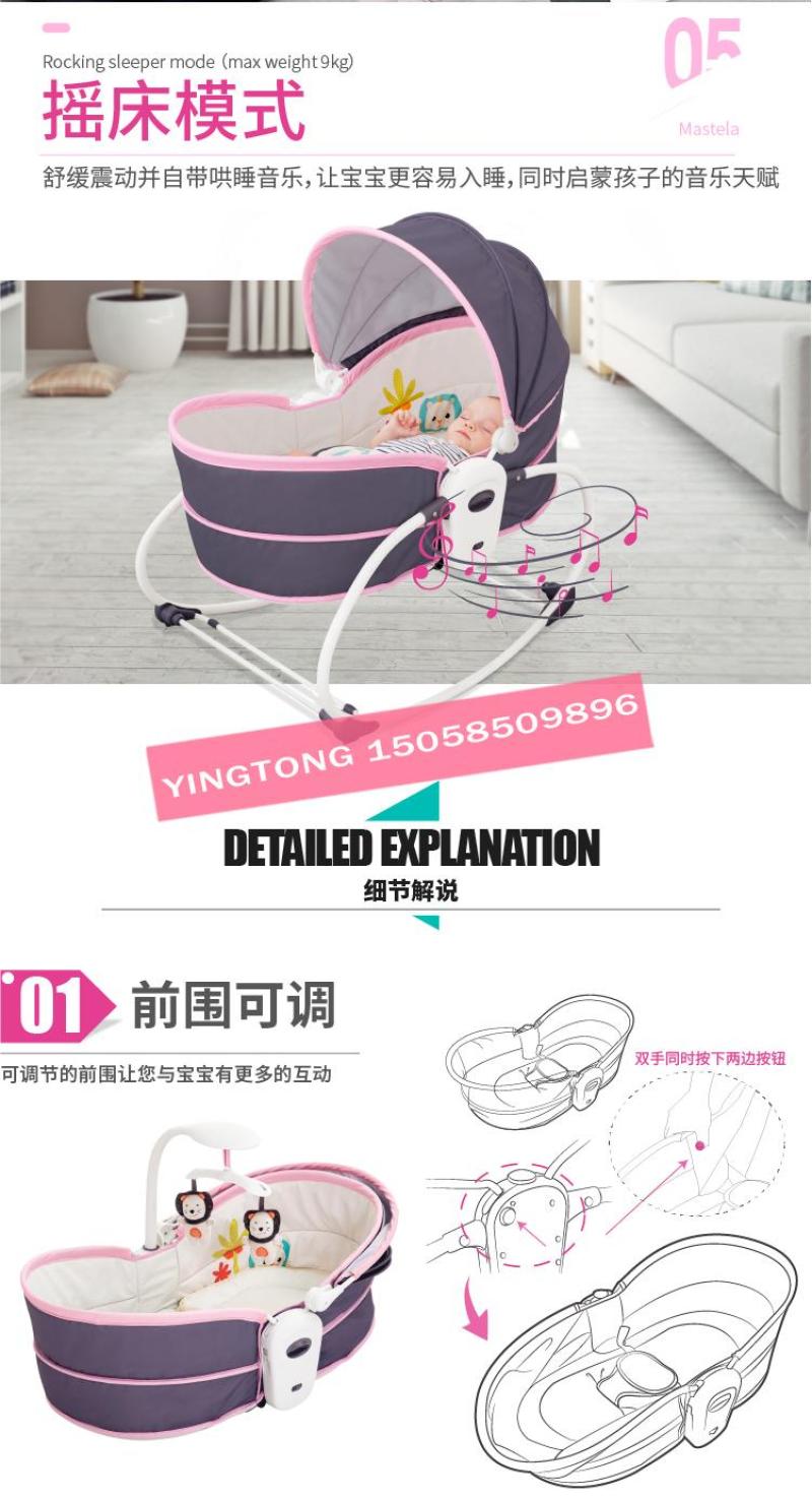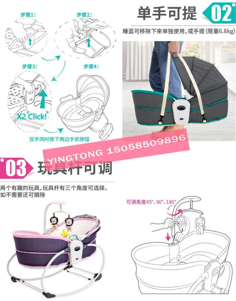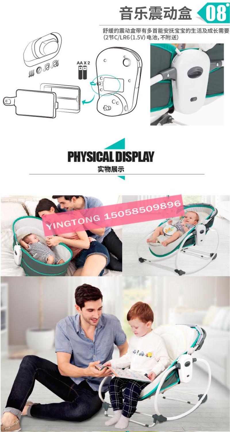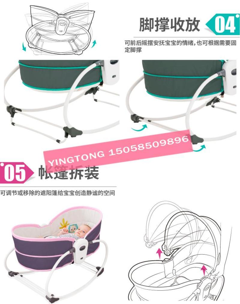 1.新型五合一摇椅可作为小床、床、篮、躺椅、摇椅使用。这真的是多才多艺和超级好。 2.这款小巧的婴儿摇杆是一个易于操作的杠杆,可将摇杆转换为舒适的倾斜位置或具有三个倾斜位置的直立座椅。 3.安全系统:三点式安全带、宝宝腿部、脚踝和腹部的安全保护、护盾扣,宝宝不能自行解锁,以免发生意外。 4.音乐振动箱:多头舒缓振动箱,满足宝宝的生活和成长需要(不含2节/3*AA(1.5V)电池)。 5.光滑安全的设计,为宝宝提供舒适自然的睡眠空间,帮助宝宝睡前舒适。有了这个摇椅,妈妈可以更轻松地照顾宝宝,陪伴宝宝健康成长。