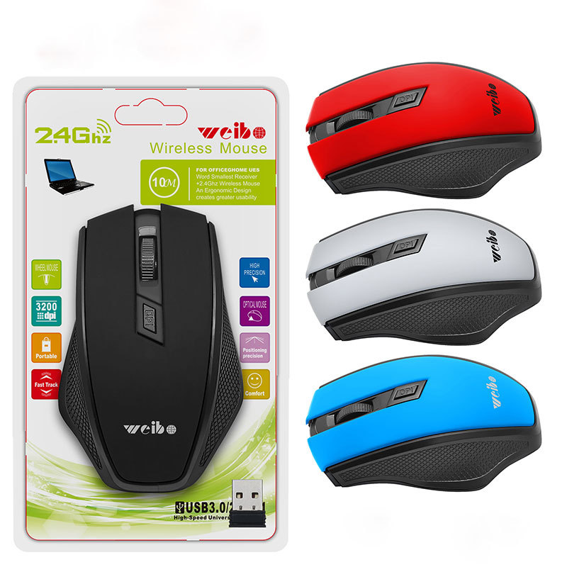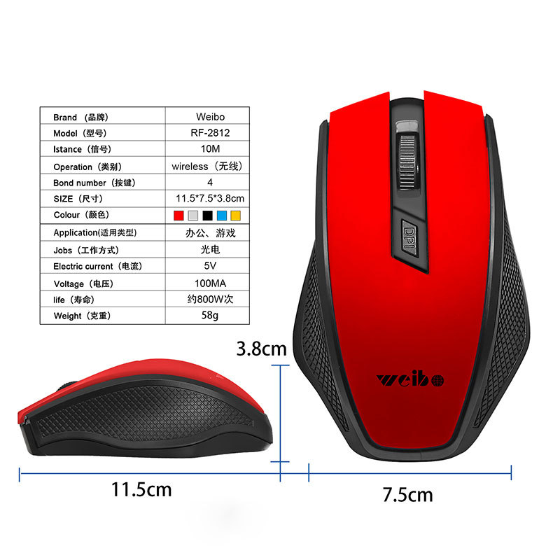 品牌:WEIBO 伟博 产品名称:10米无线鼠标 型号:RF-2812 产品说明: *包装:彩盒包装 *按键数:4个功能键