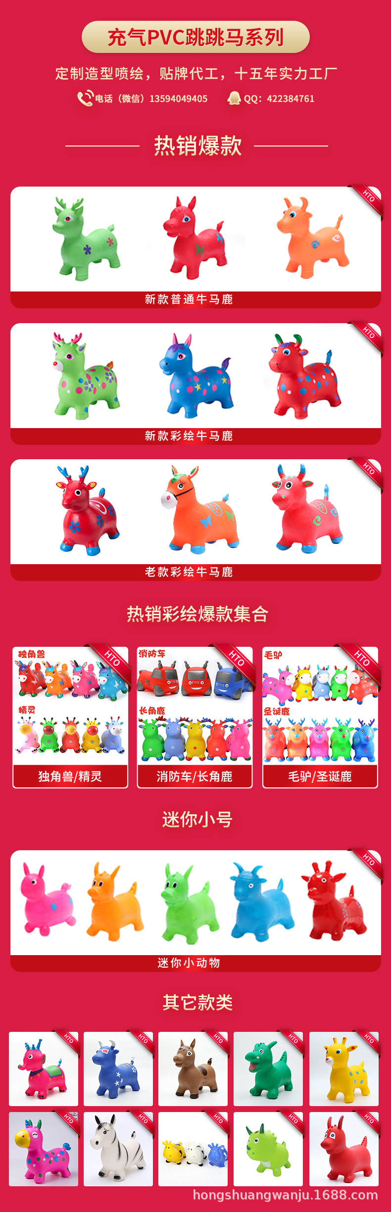 产品名称 新款造型彩绘卡通跳跳马 产品材质 PVC塑胶材料 产品参数 重量1.3KG 长宽高58*28*50cm 每箱个数 30个 产品颜色 红色黄色粉色蓝色绿色橘色 产品承重 100千克