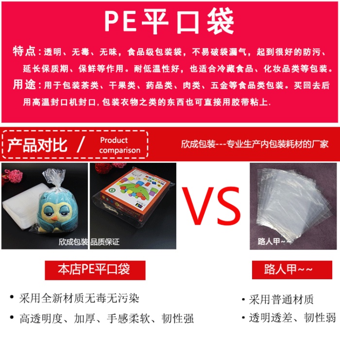 ★平口袋开口,可以用封口机封口,非常方便,材质为PE,手感软,