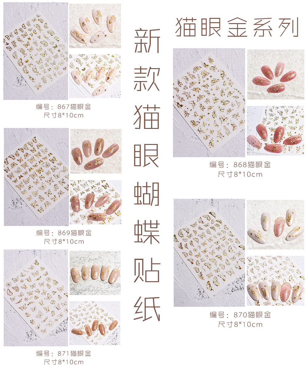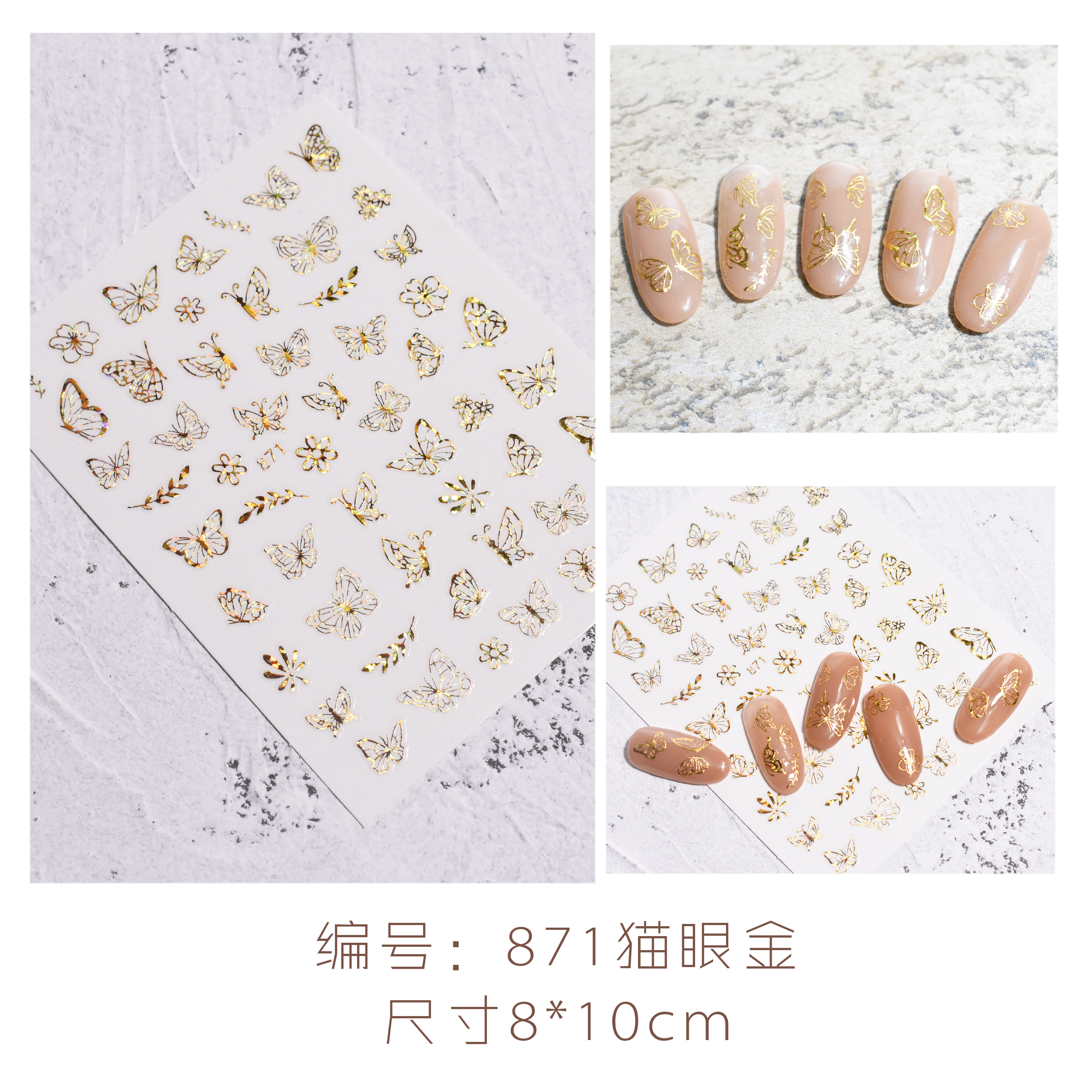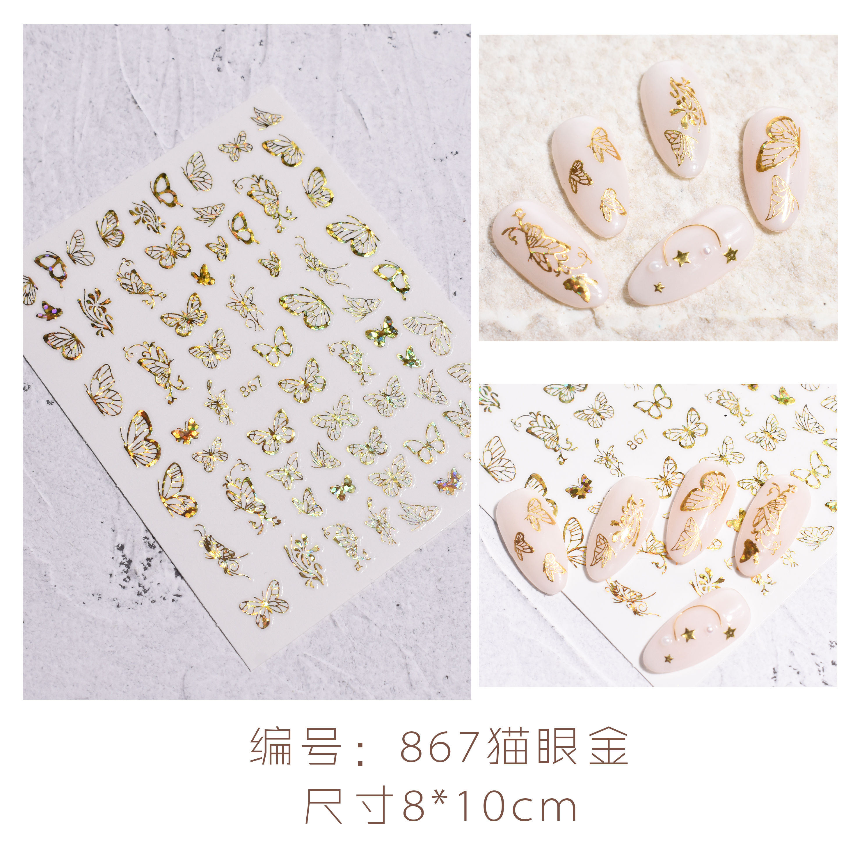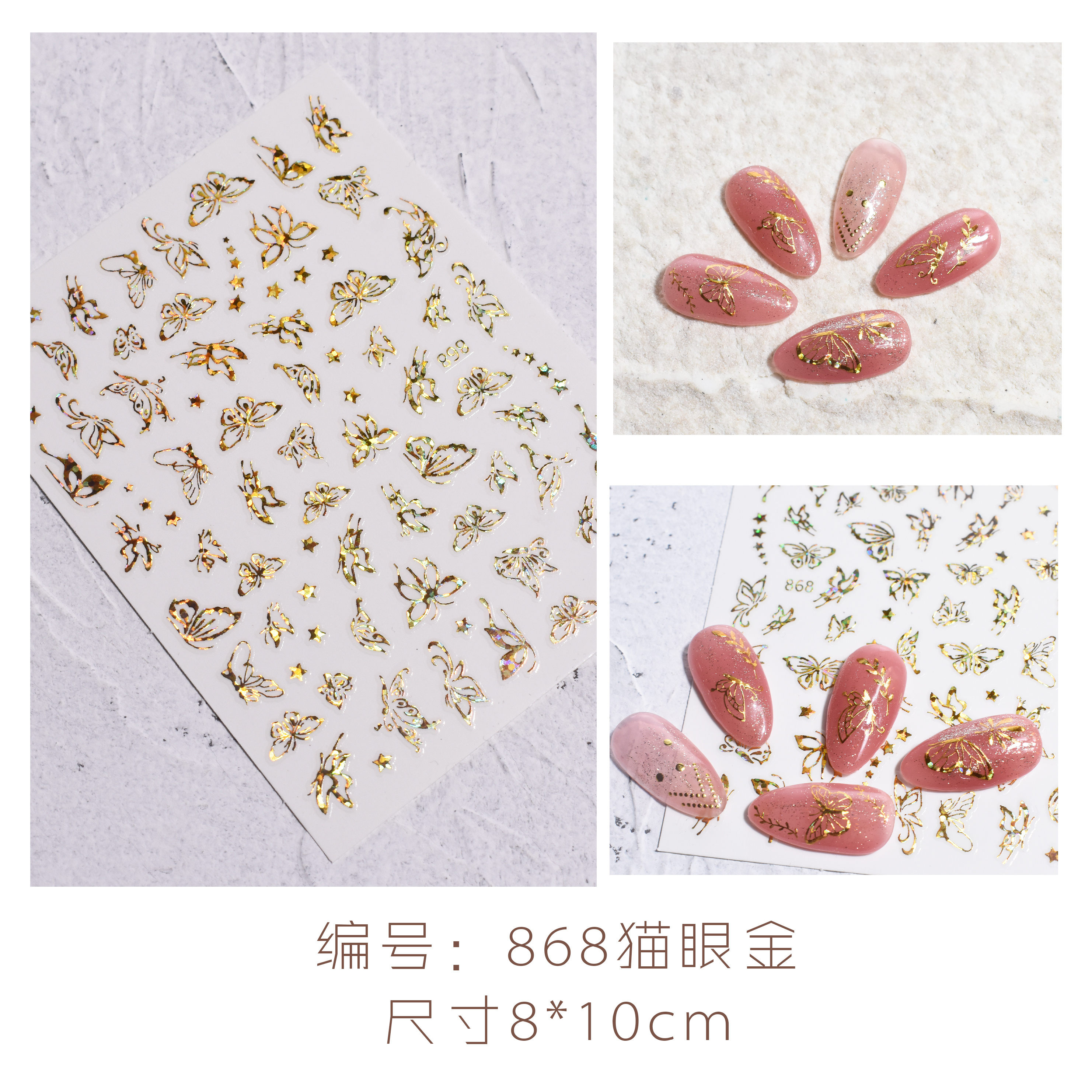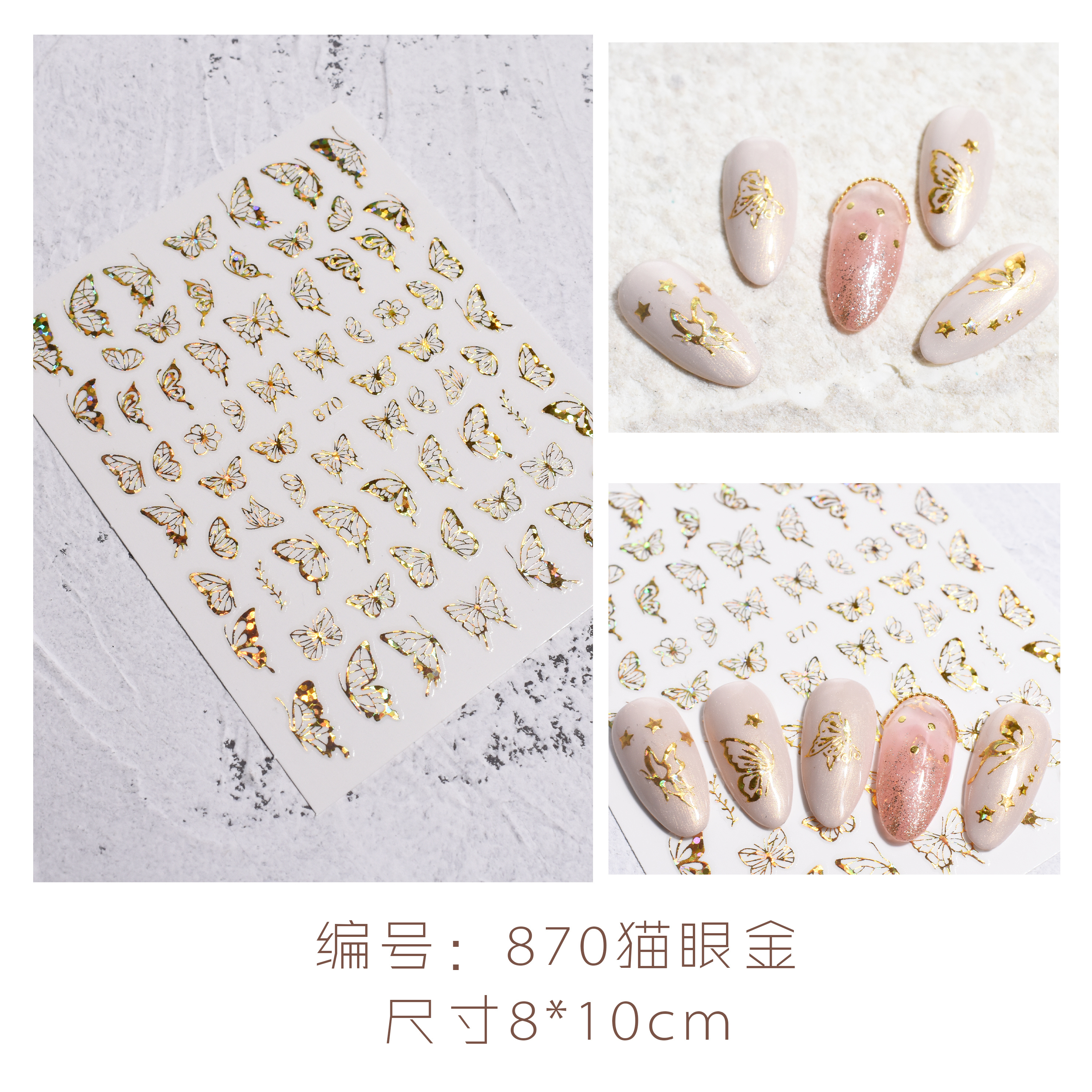Manicura láser bronceado ojo de gato pegatinas mariposa 3D pegatinas de uñas de oro y plata huecas INS viento pegatinas decorativas tirantes traseros