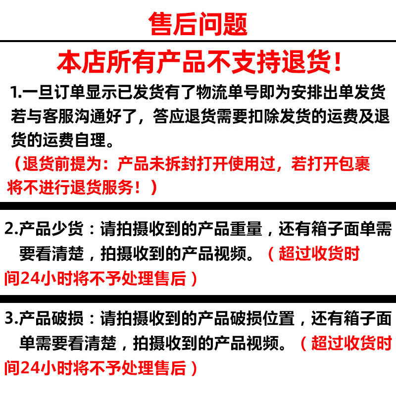 售后承诺: 1>、质量保障,诚信为本 2>、质量问题无条件退货 货物验收: 1>、客户接到货物后务必当场验收后,再签字确认 2>、客户签字确认后,发现有少货或者损坏现象的,非因我方原因造成的,我方将不再为客户处理类似问题(客户一旦签字,快递公司便不会承认任何问题) 3>、验收货物过程中,有任何异常情况,请及时联系我们方客服解决 关于图片 本店所有图片均为实物拍摄。因光线和显示器不同,商品图片会出现一定的色差,请不能接受色差问题的亲慎重选择,以免发生交易纠纷。此类问题不能作为中差评论以及投诉的依据。 我们的理念:“诚信为本、实力为先,全心全意为客户”,我们公司坚持客户至上、服务至上及又以稳固、发展、忠诚、高效、团结与创新的精神,我们的诚信、实力和产品质量获得业界的认可。欢迎各界朋友莅临参观、指导和业务洽谈 |