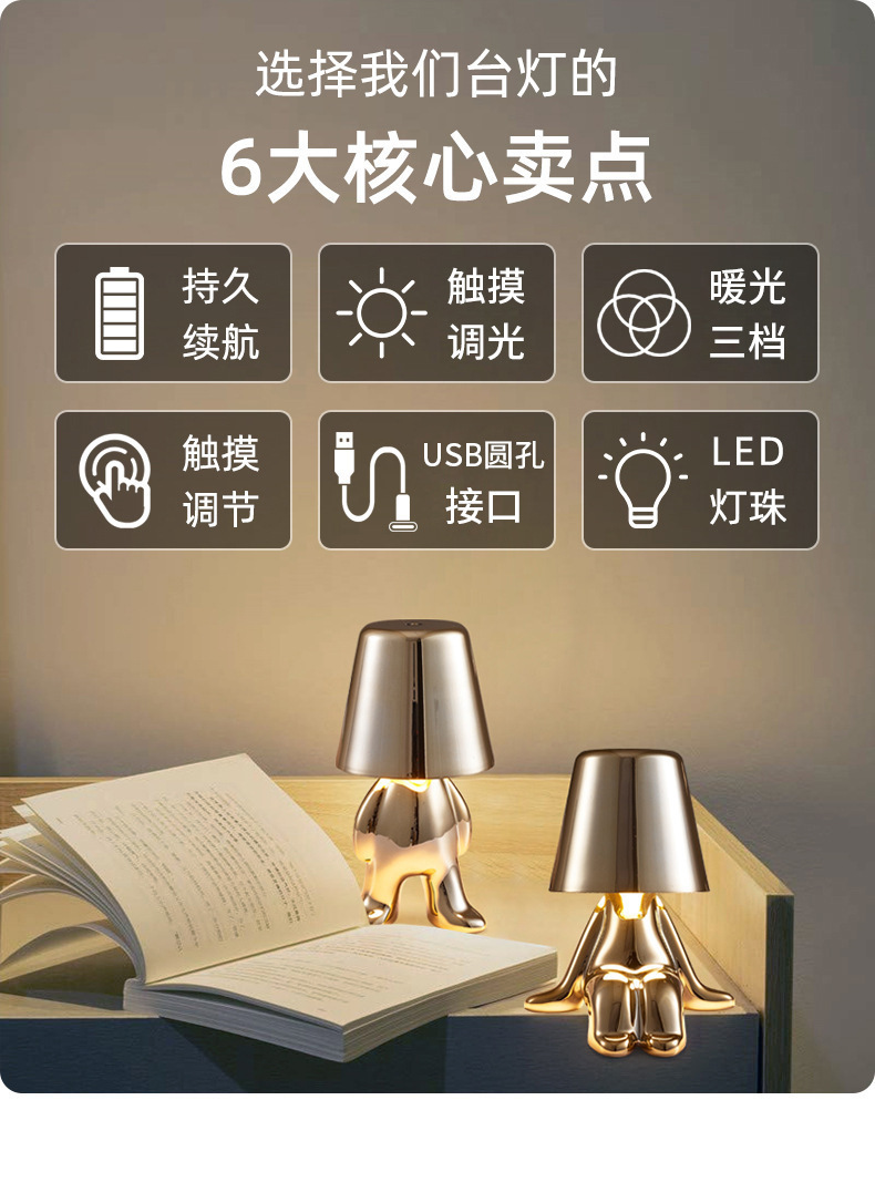 Pensador de ventas calientes transfronterizas pequeña lámpara de mesa dorada carga táctil pequeña lámpara de noche Italia INS decoración lámpara de Mesa