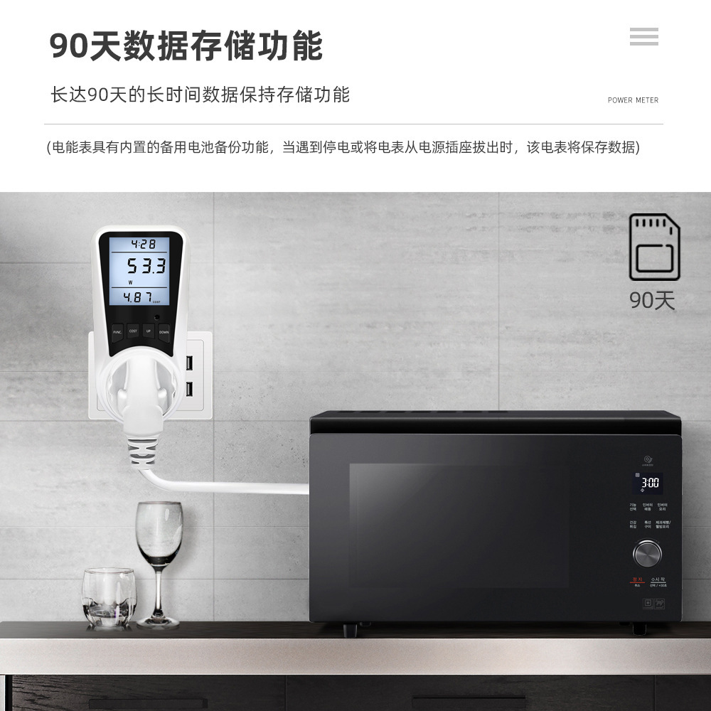 3.长时间数据存储功能:随内置充电电池备份,电能表功率分析仪在遇到断电或从插座上拔出电表时,最多可保存90天的数据;所有数据包括成本设置一旦按下复位按钮将为零。