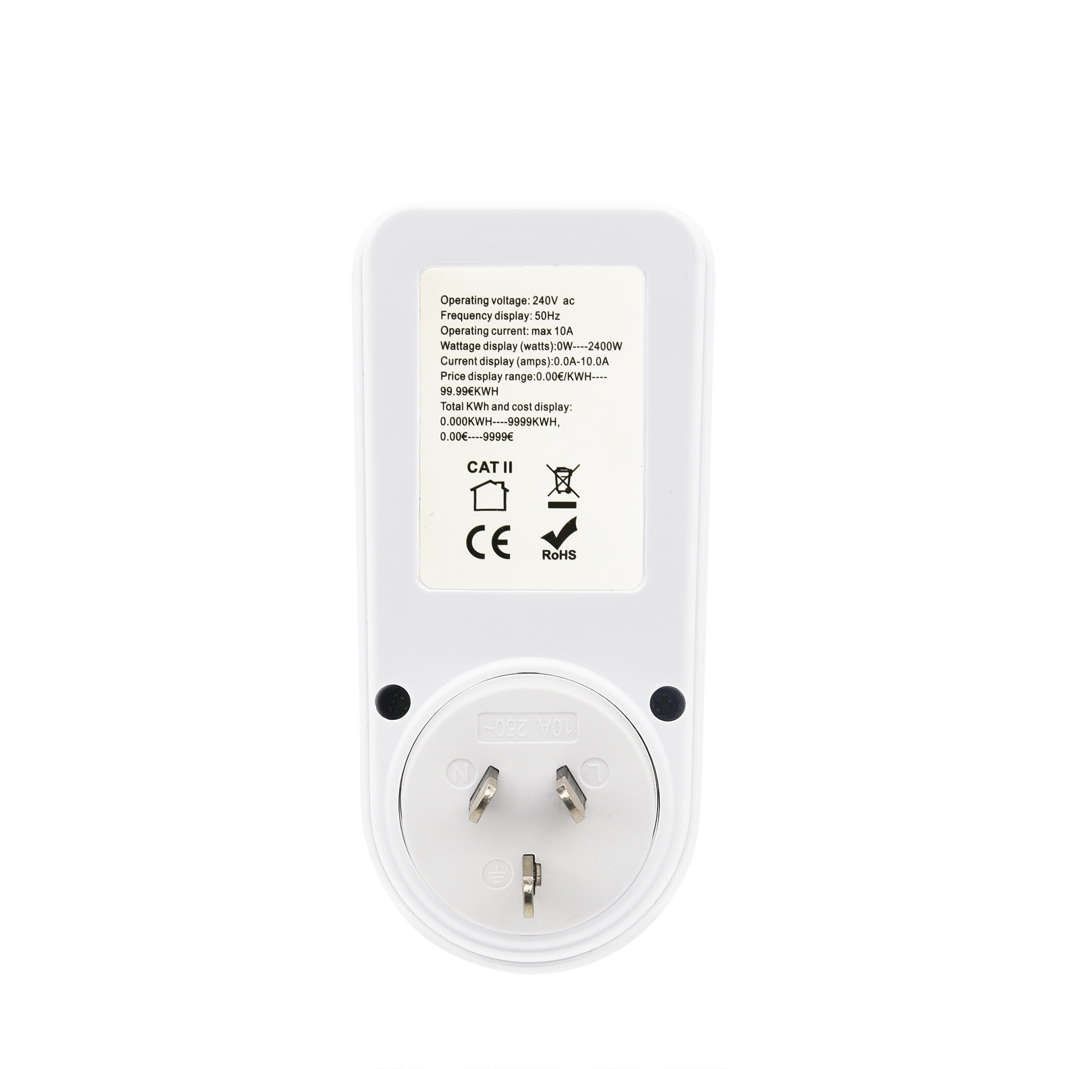 5.双电压宽测量范围:该功率计可测量110-130 Vac&200-240 Vac电压;0-16A AMP;0-3680 W瓦特,并指示负载达到3680 W时过载;1.0级精度标准,分辨率为0.1W、0.1V、0.001A和0.001kWh;注:标签上的瓦背面只显示低电压范围,以满足认证要求。