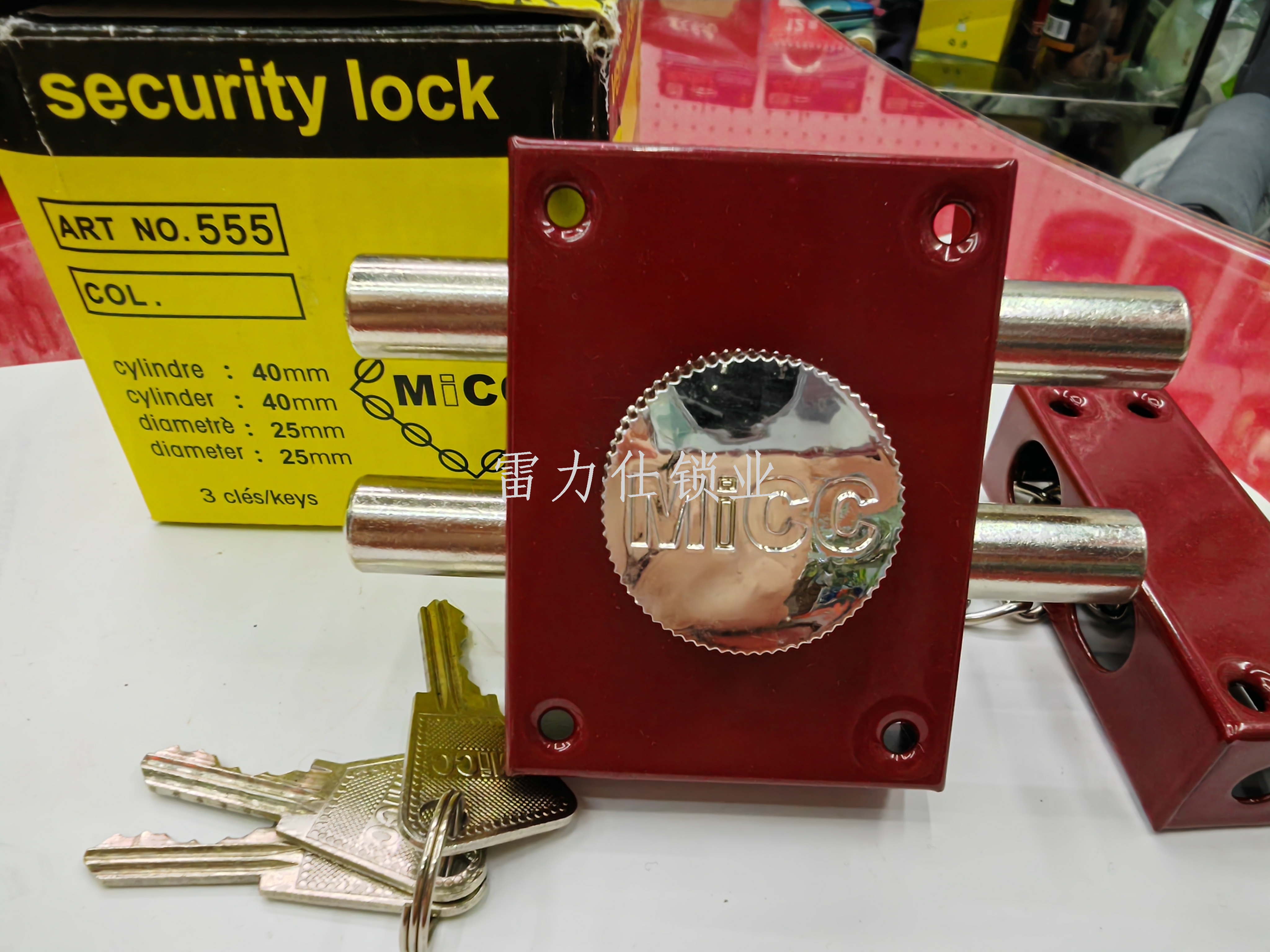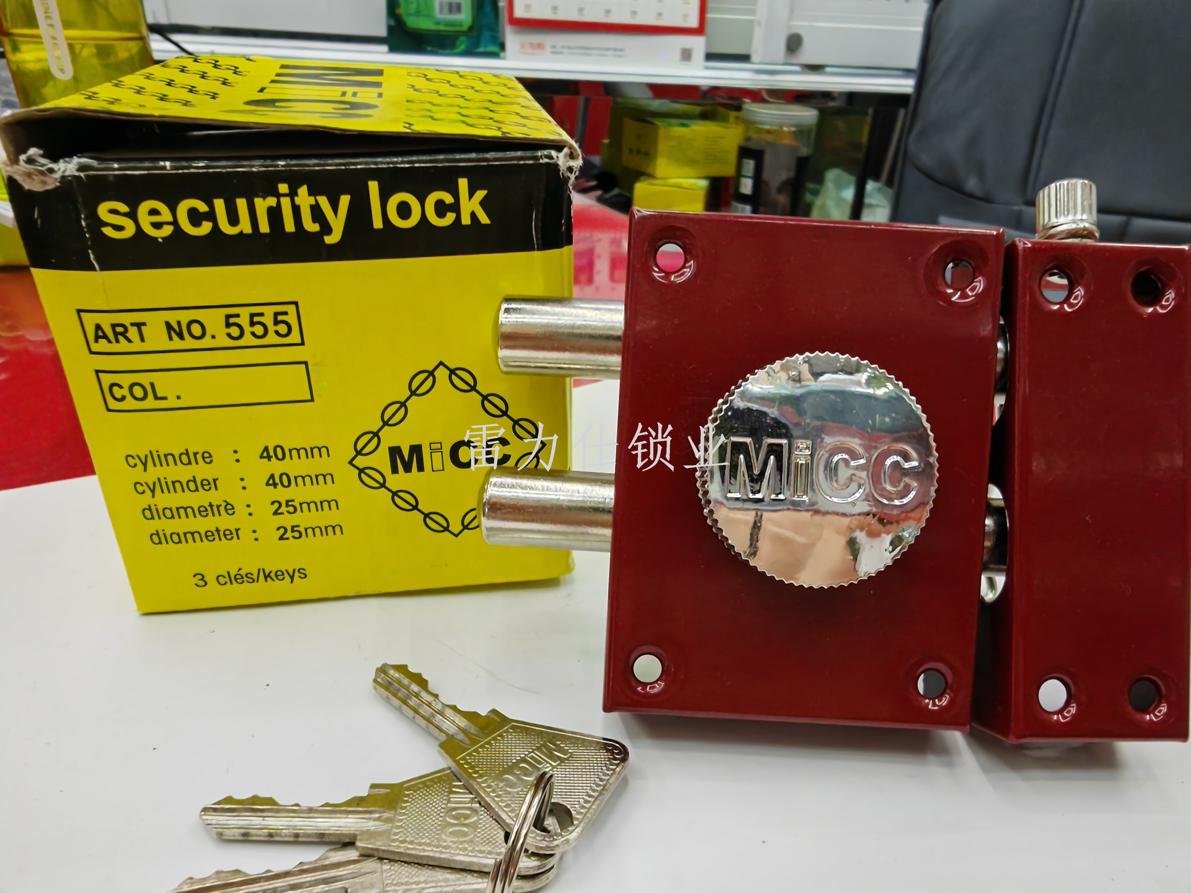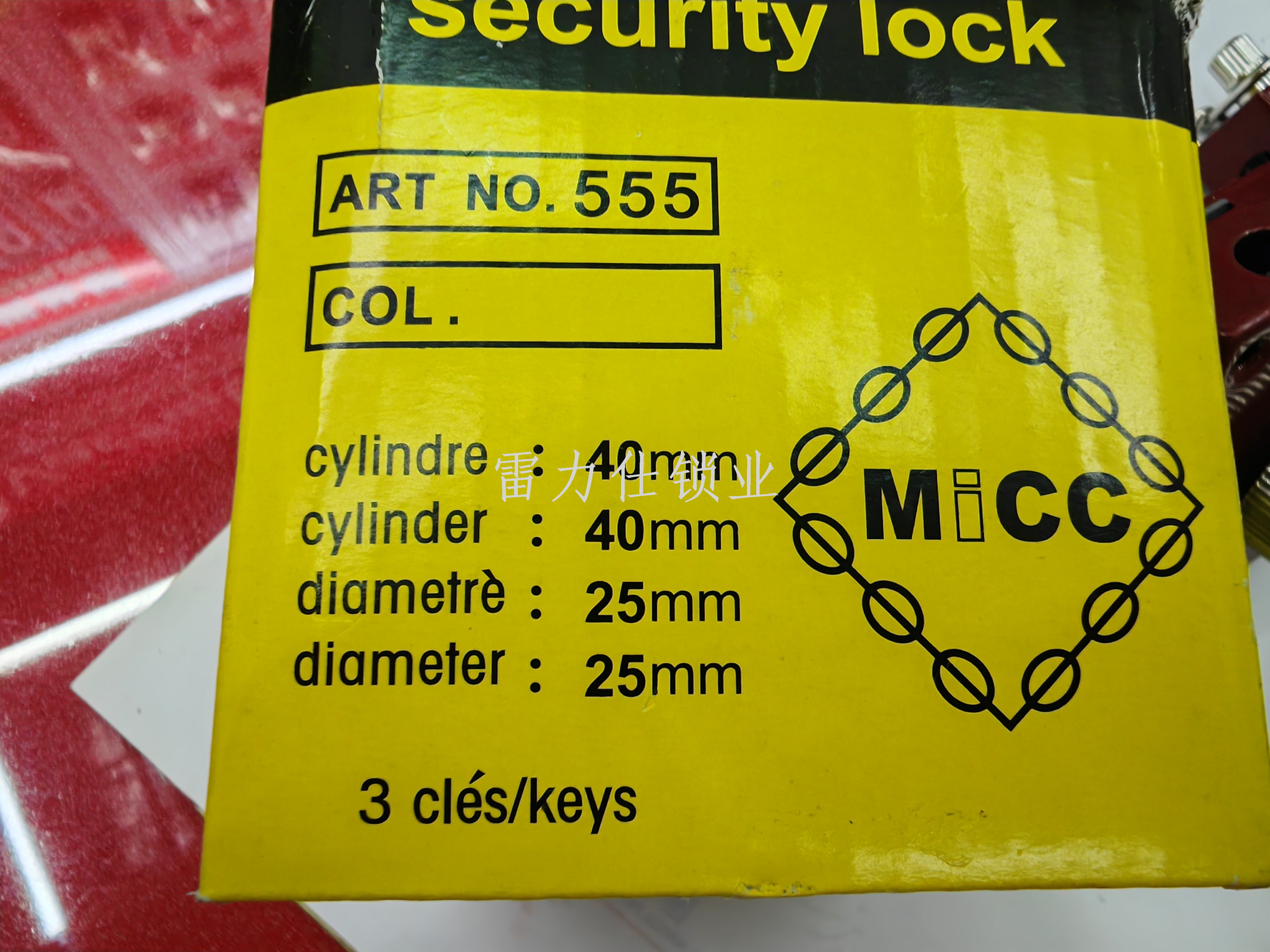 门锁 MICC 555 外铁头不锈钢包面,半铜芯,圆舌 ,3把铁钥匙,锁壳1.0mm 装箱数 24把,体积 37*24*31 重量15/14