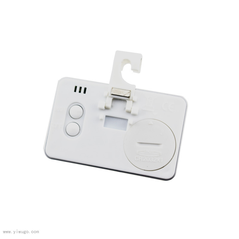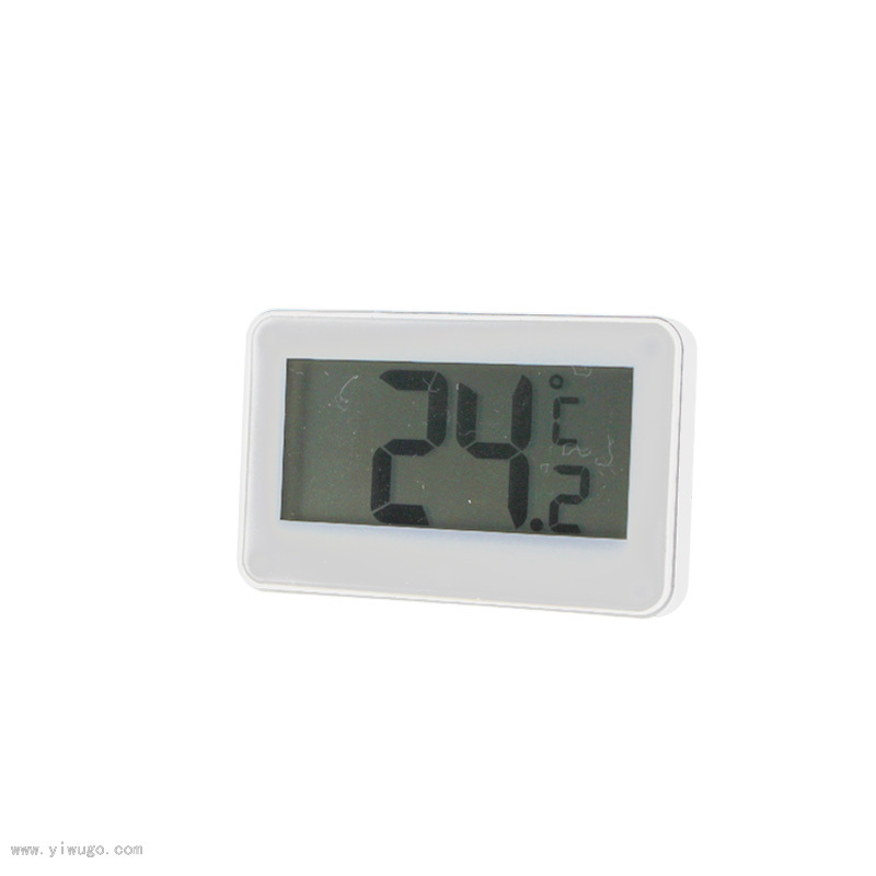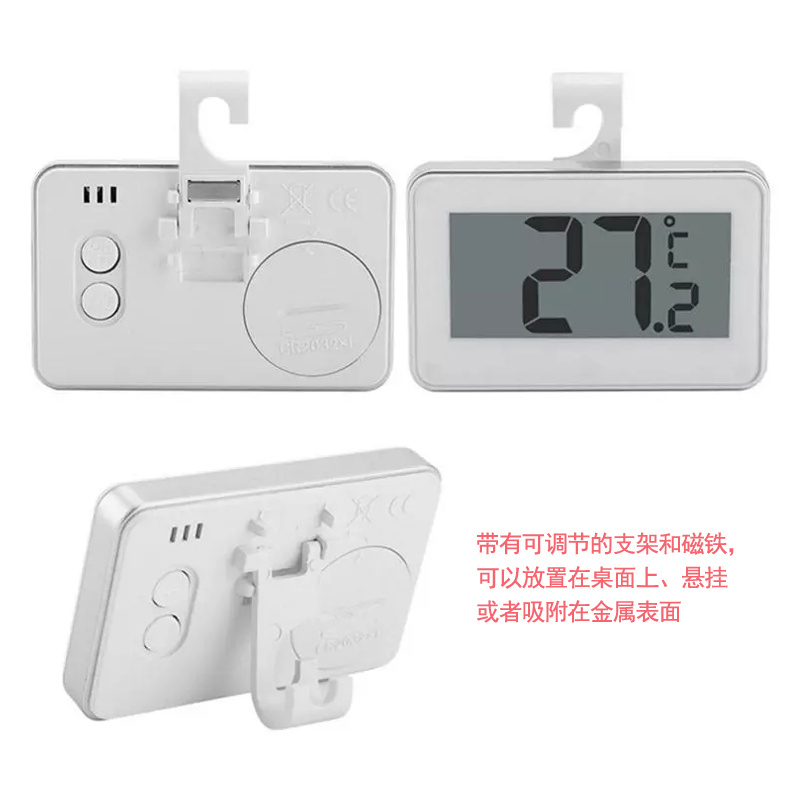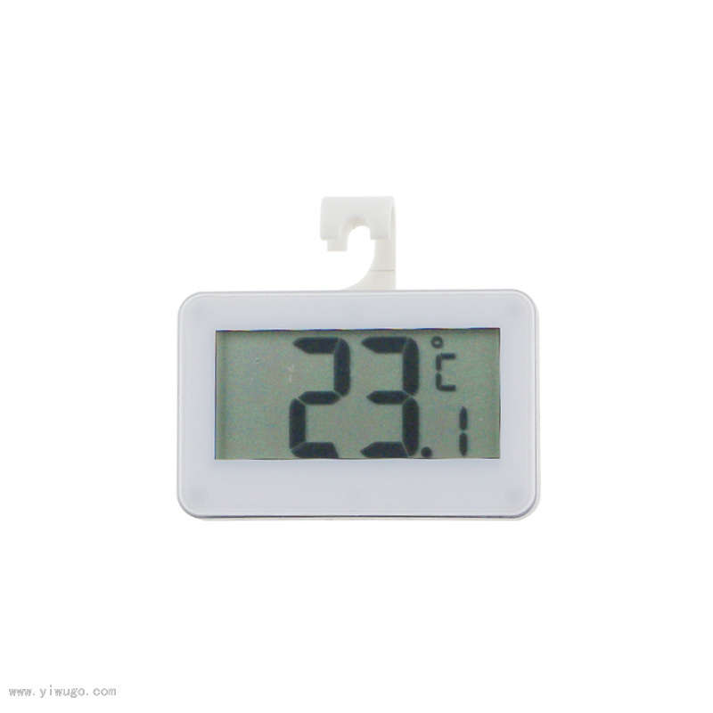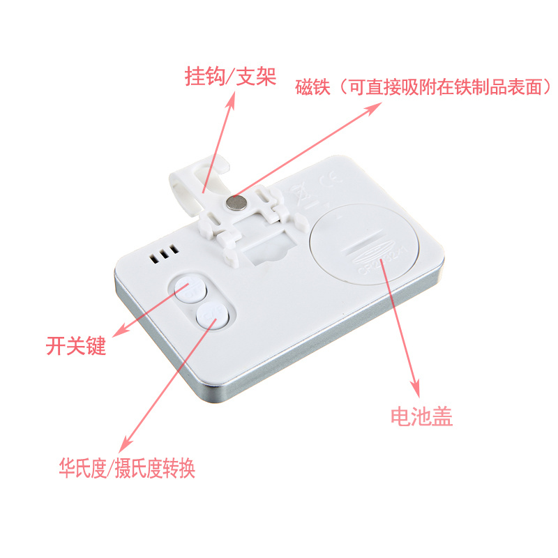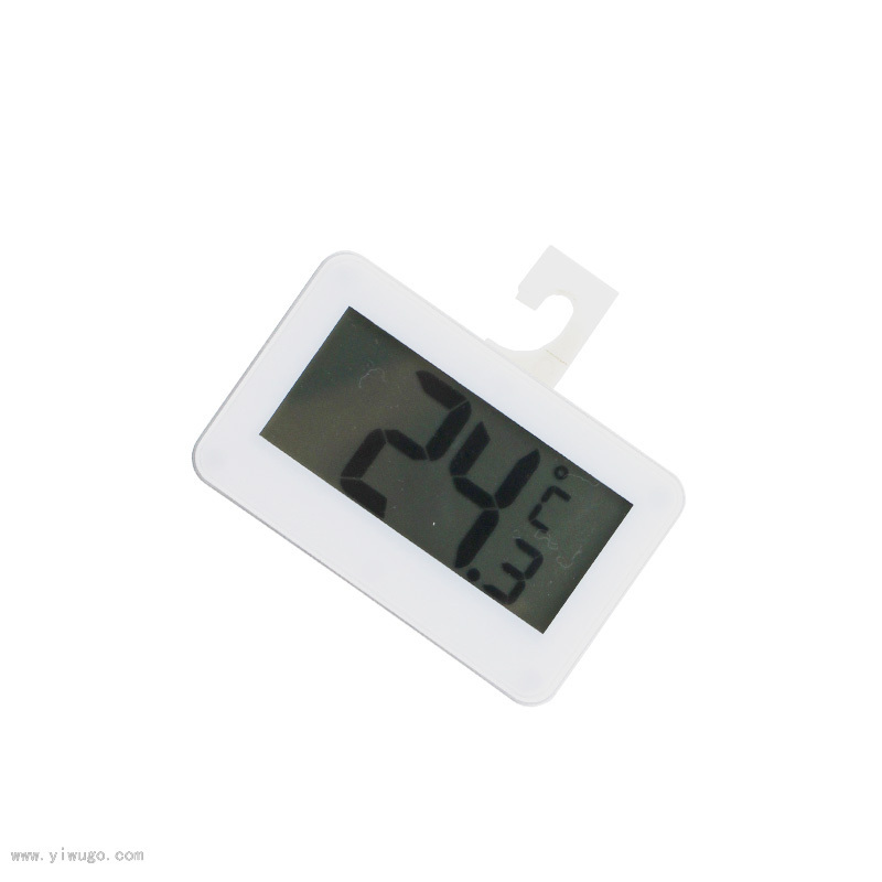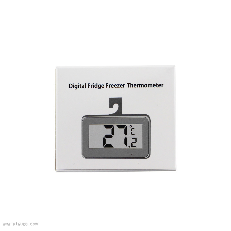 可通过开关按键关闭冰箱温度计,节约用电。 华氏度摄氏度通过按键转换 产品尺寸:挂钩收起后6.7X2.5X4.3CM,挂钩放出后6.7X6.2x1.2cm 产品包装:气泡袋+英文说明书+白盒 产品包装尺寸:8*7.2*1.8cm; 单个重量:42克(连包装) 装箱数量:200个