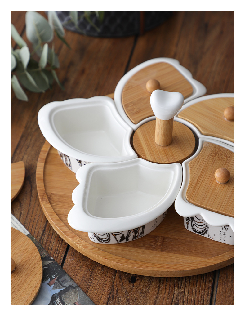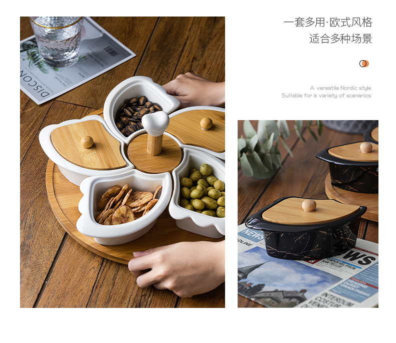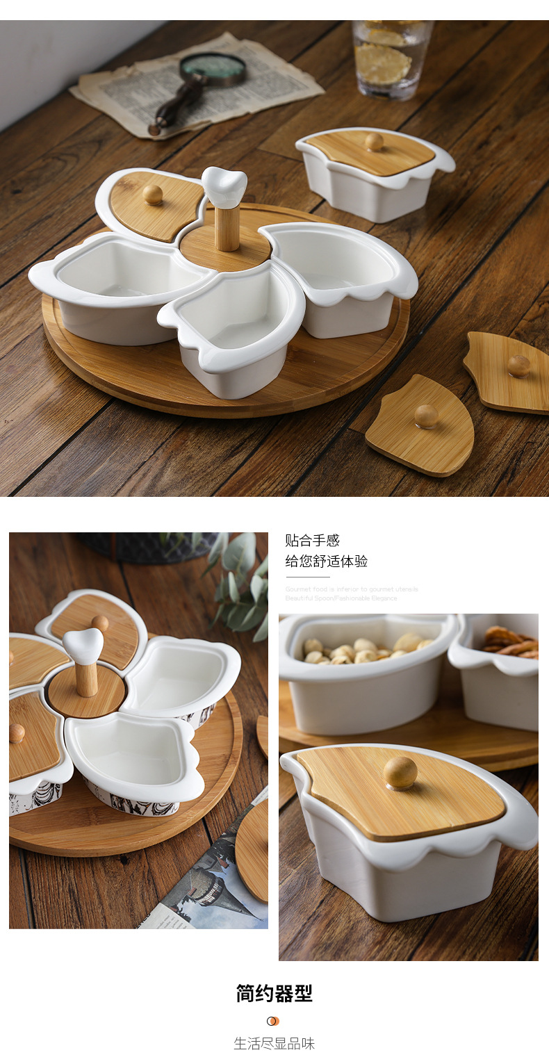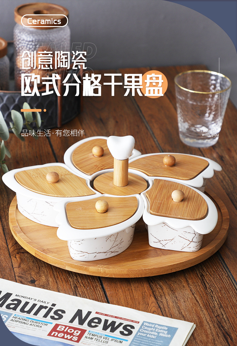 Cerámica de bambú y madera de estilo europeo dividida en platos de frutas secas, bocadillos de dulces, platos de frutas con tapa, cajas de nueces de caramelo de boda, cajas de bocadillos