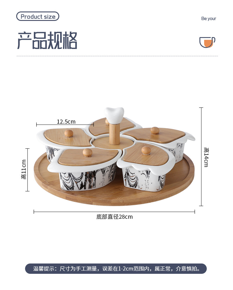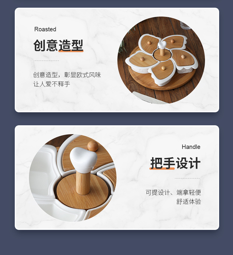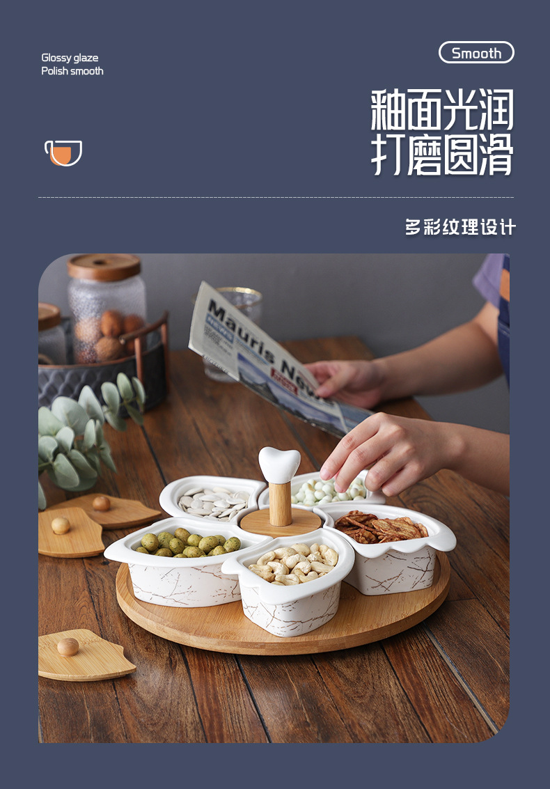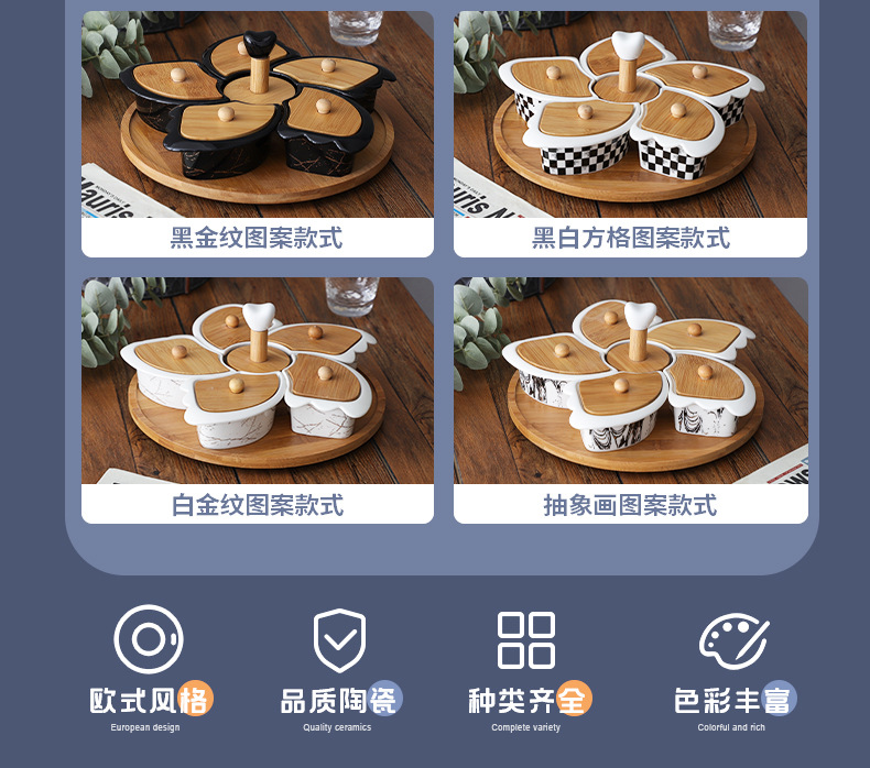 Cerámica de bambú y madera de estilo europeo dividida en platos de frutas secas, bocadillos de dulces, platos de frutas con tapa, cajas de nueces de caramelo de boda, cajas de bocadillos