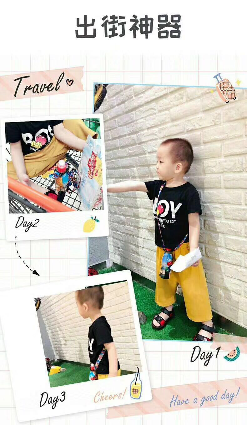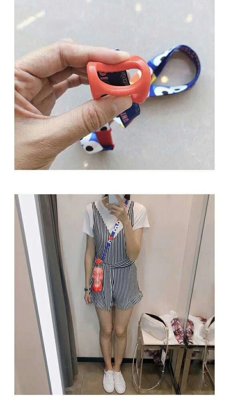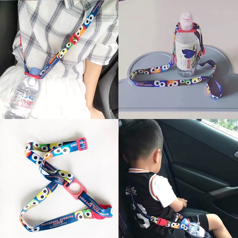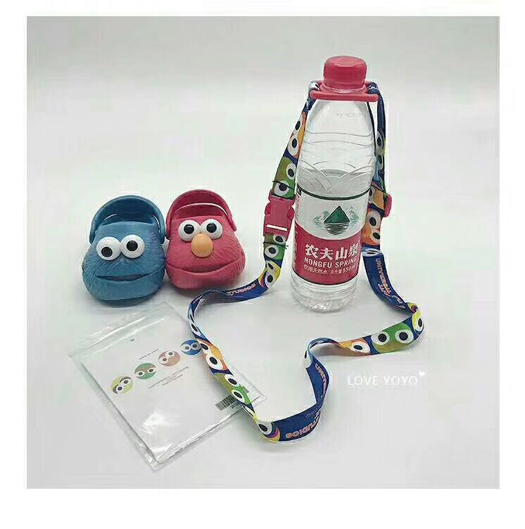Bebidas en la Calle Sésamo al contado con botellas de agua mineral en la espalda, cuerdas colgantes para niños alargados y oblicuos