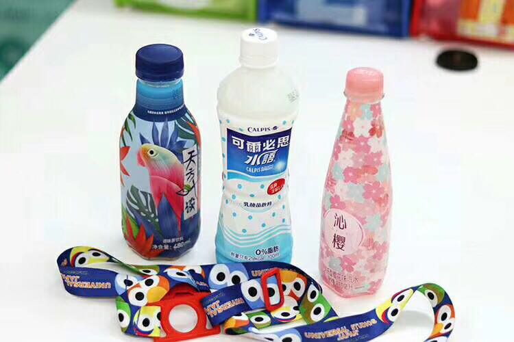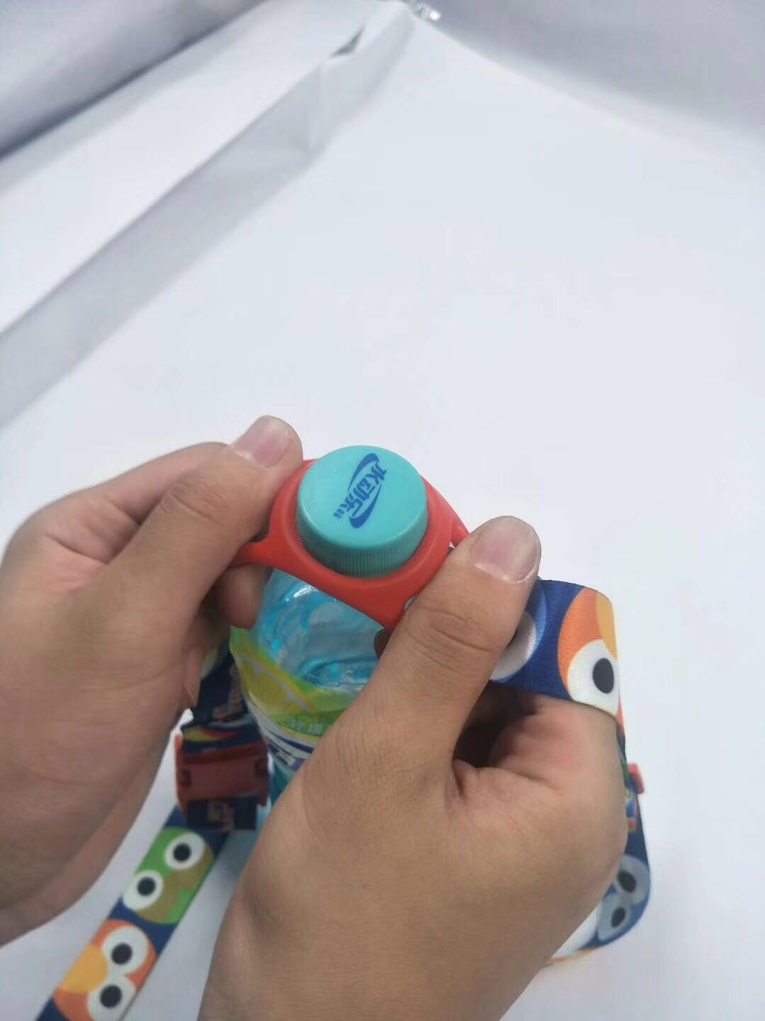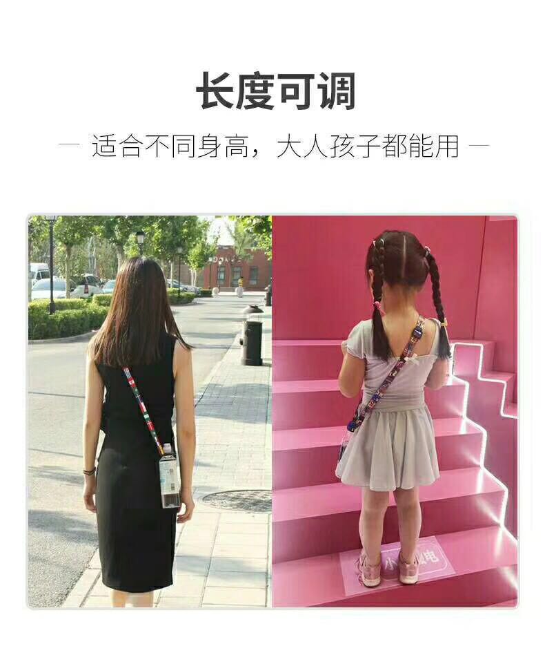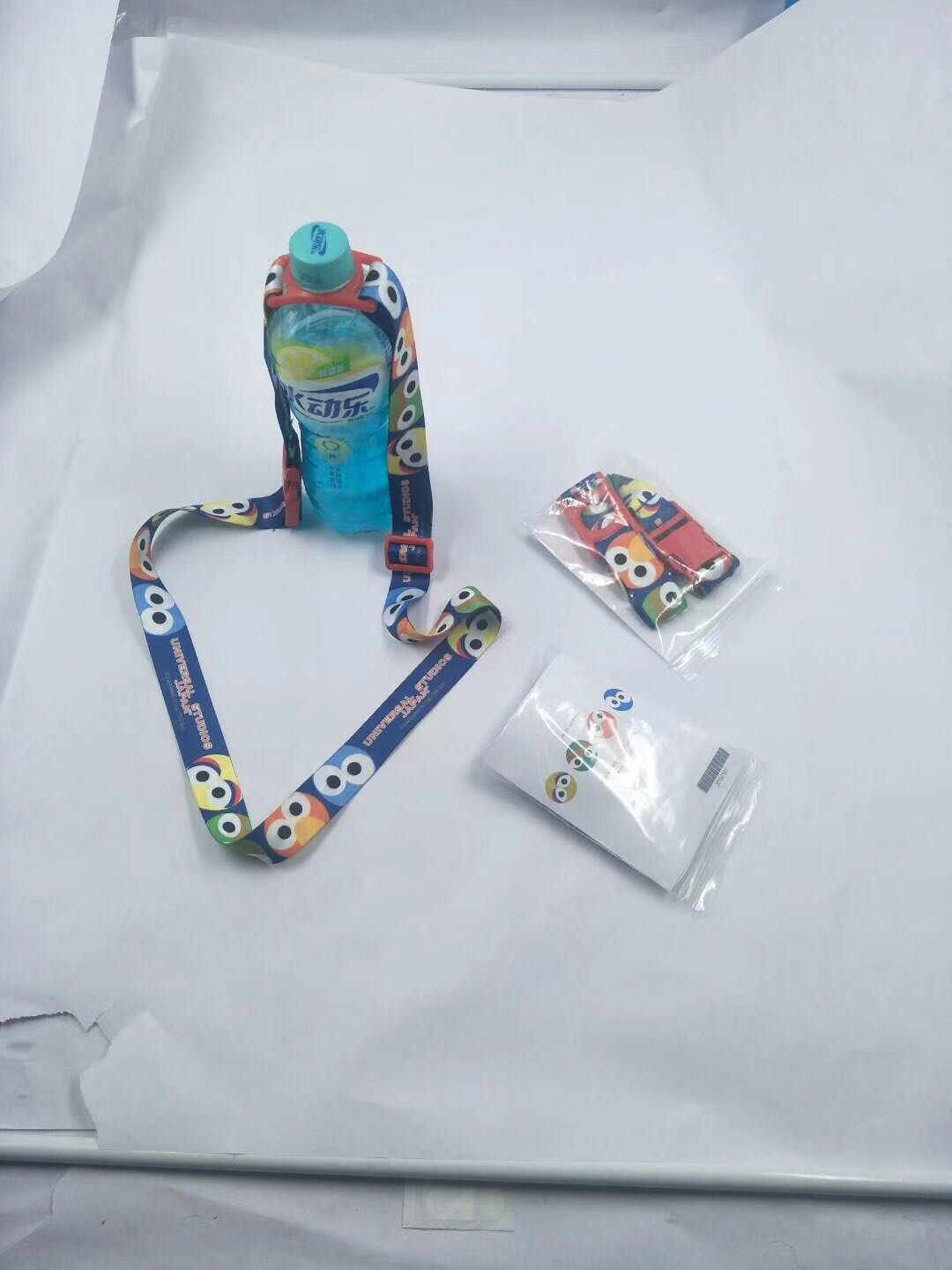 Bebidas en la Calle Sésamo al contado con botellas de agua mineral en la espalda, cuerdas colgantes para niños alargados y oblicuos