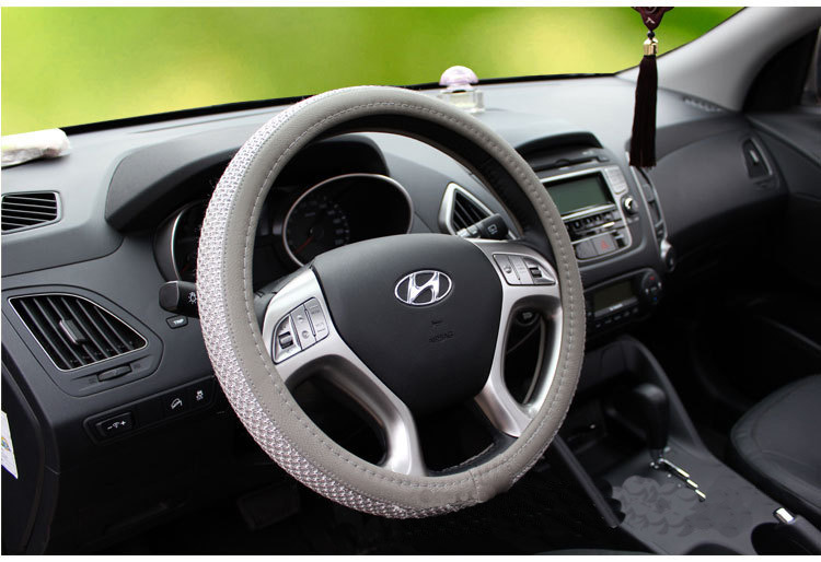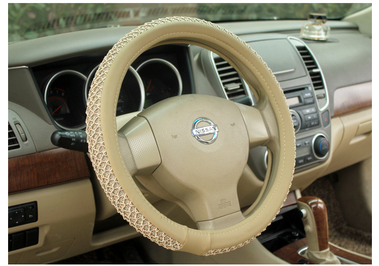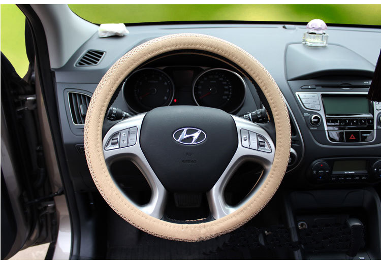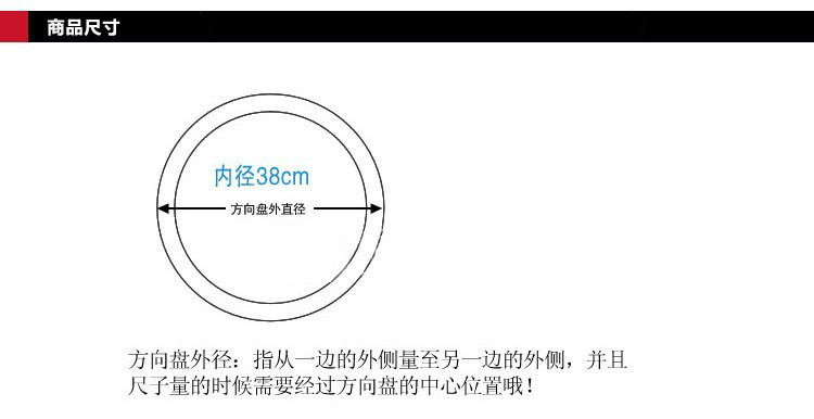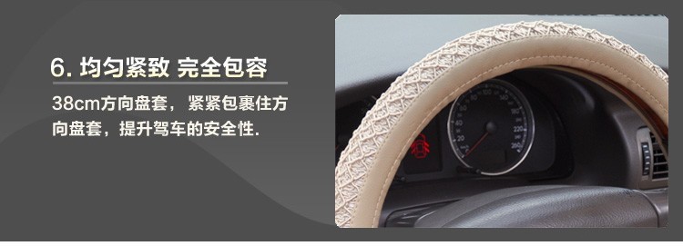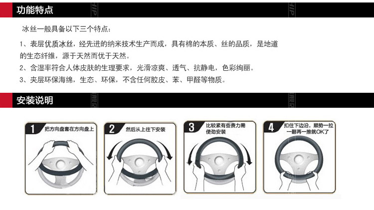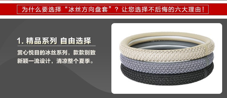 【产品名称】:冰丝方向盘套 【产品包装】:透明袋 【产品型号】:BY-110 【产品颜色】:黑,红,米,灰 【产品尺寸】:38CM 【材 质】:冰丝+环保PET塑料白胶 【毛 净】:500g一个 【外箱入数】:40-50个 【外箱尺寸】:编织袋