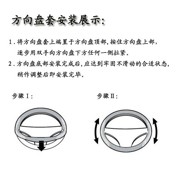 此方向盘套设计紧固、需两个人配合才能有效安装。固定方向盘的顶部,其中一个人用双手紧握一方,另一人顺移方向盘,把其余部分逐渐安装稳妥。从底部完成全部安装,并作适当调整。