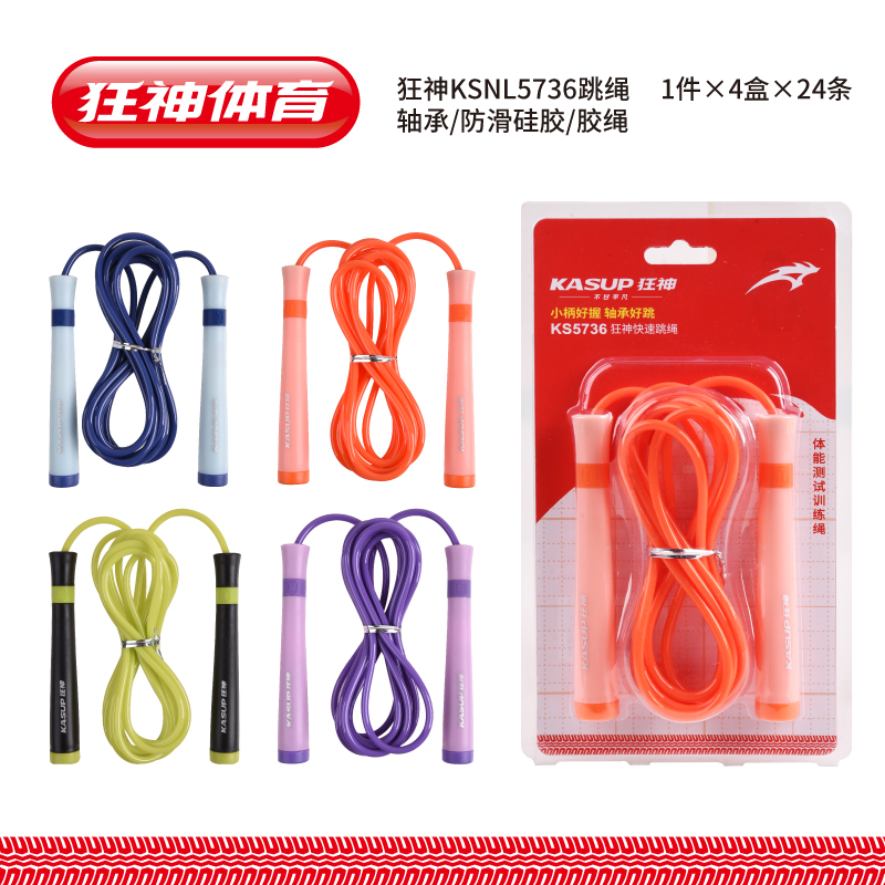 可拆泡壳包装、PP料手柄配硅胶套、亮面PVC绳、2.75米长、4.2MM粗、内置轴承;黑黄7/粉5/紫5/蓝7配色,4色混装,手柄印LOGO