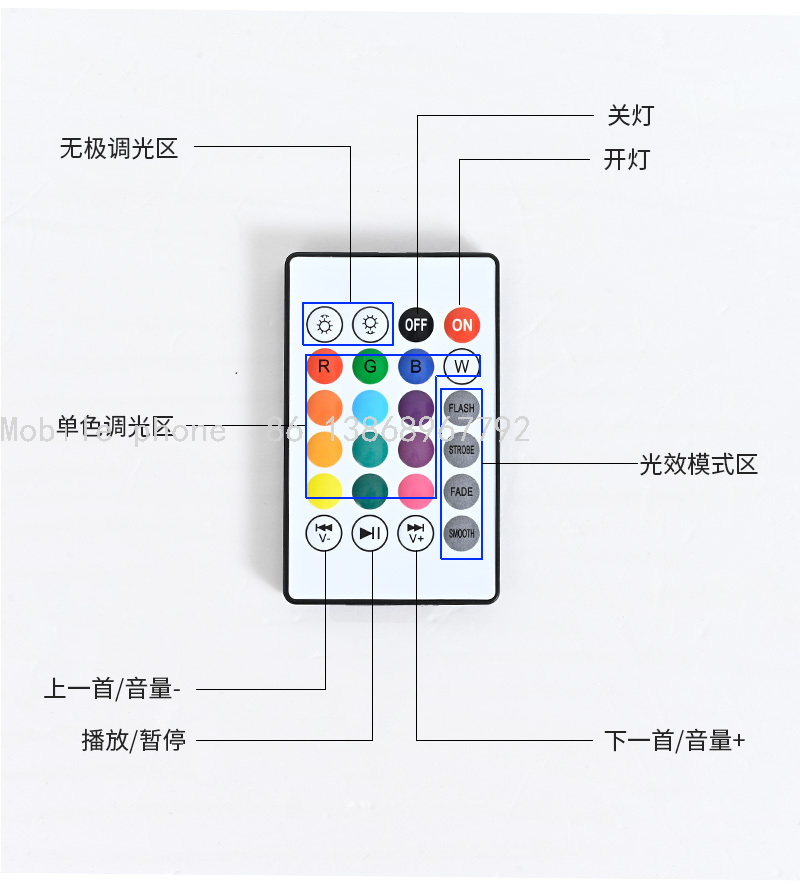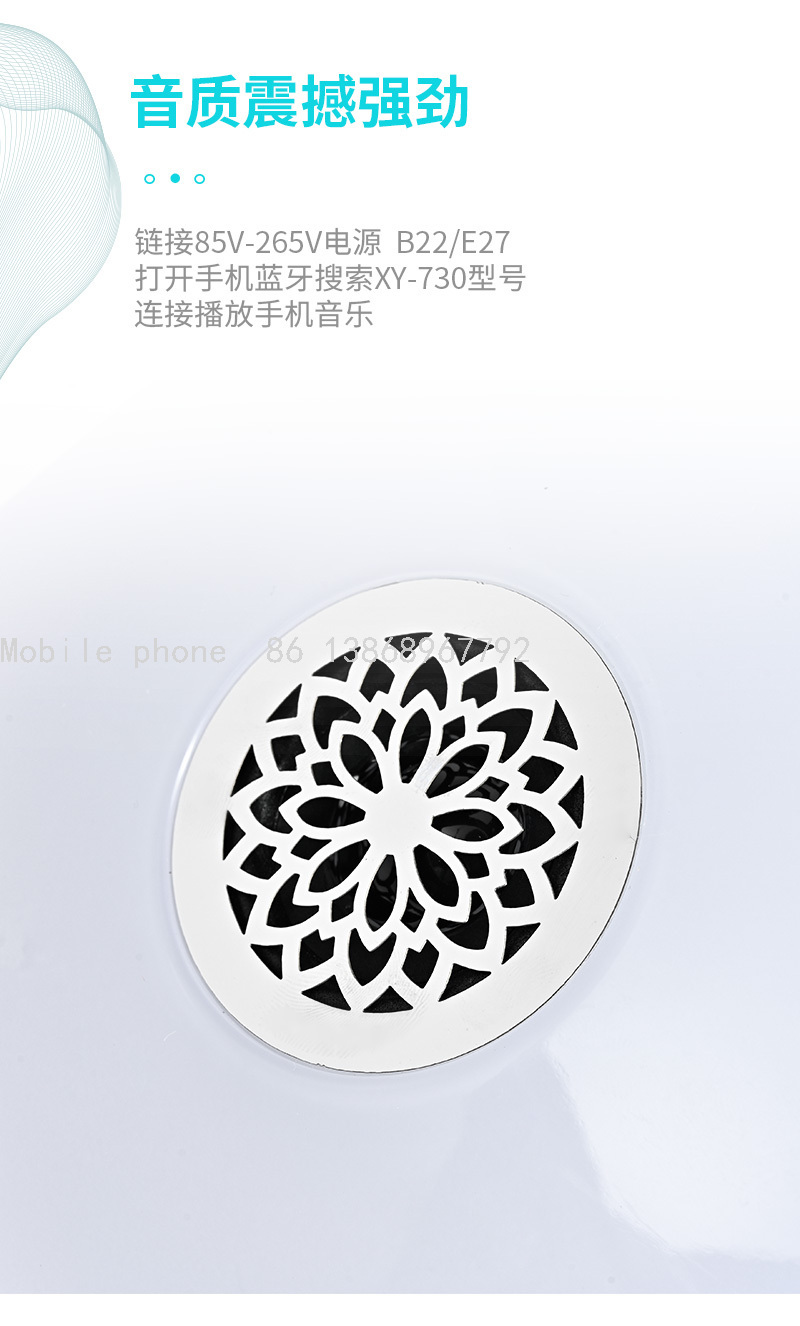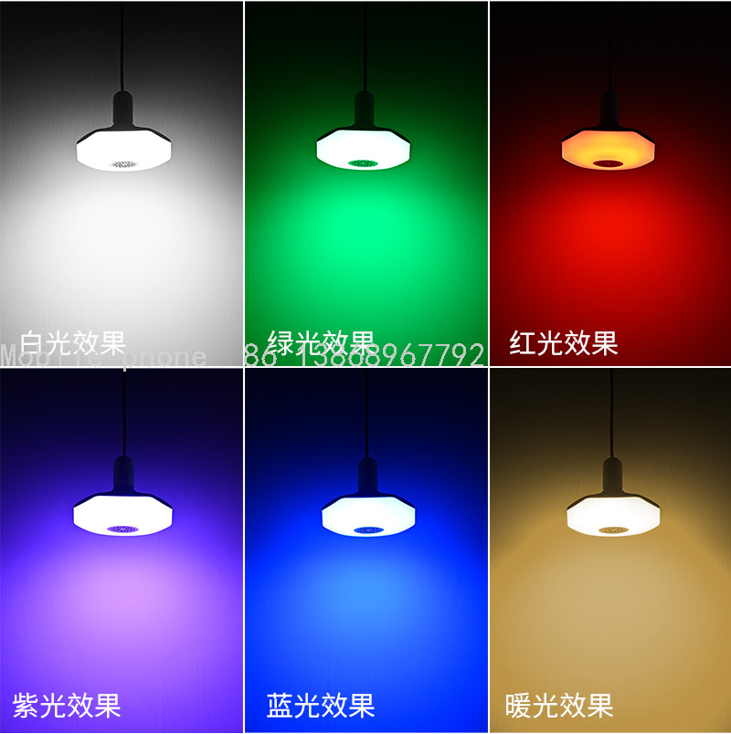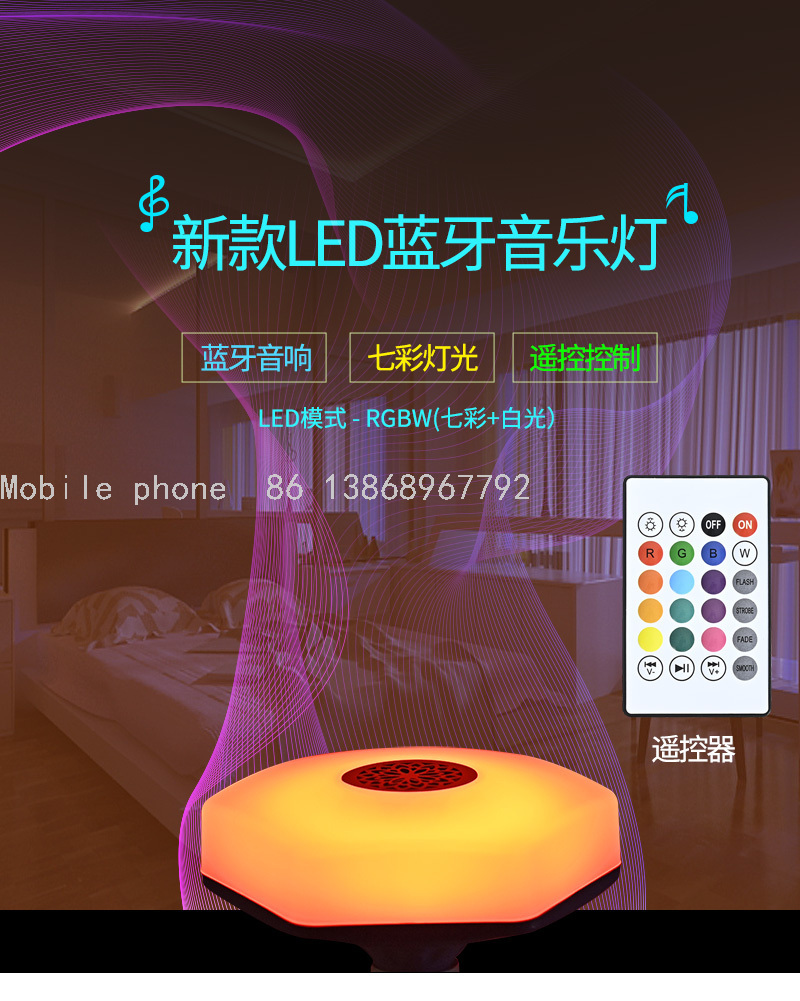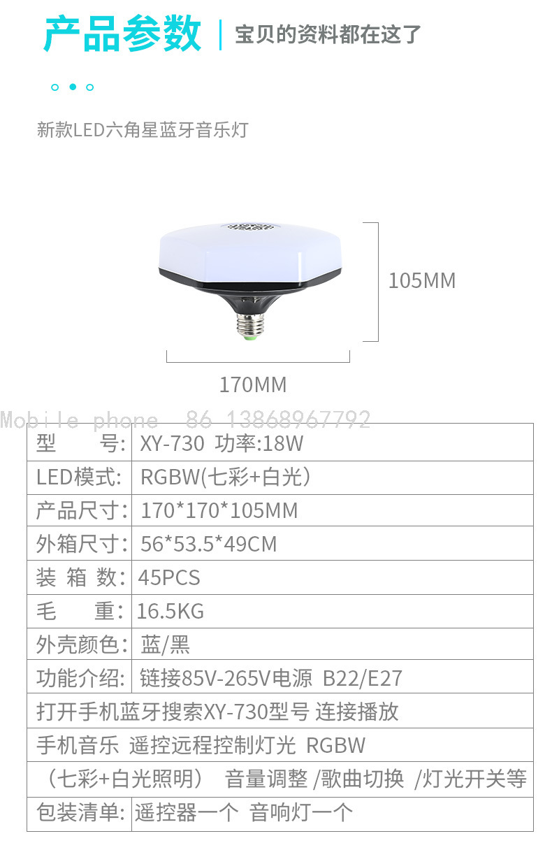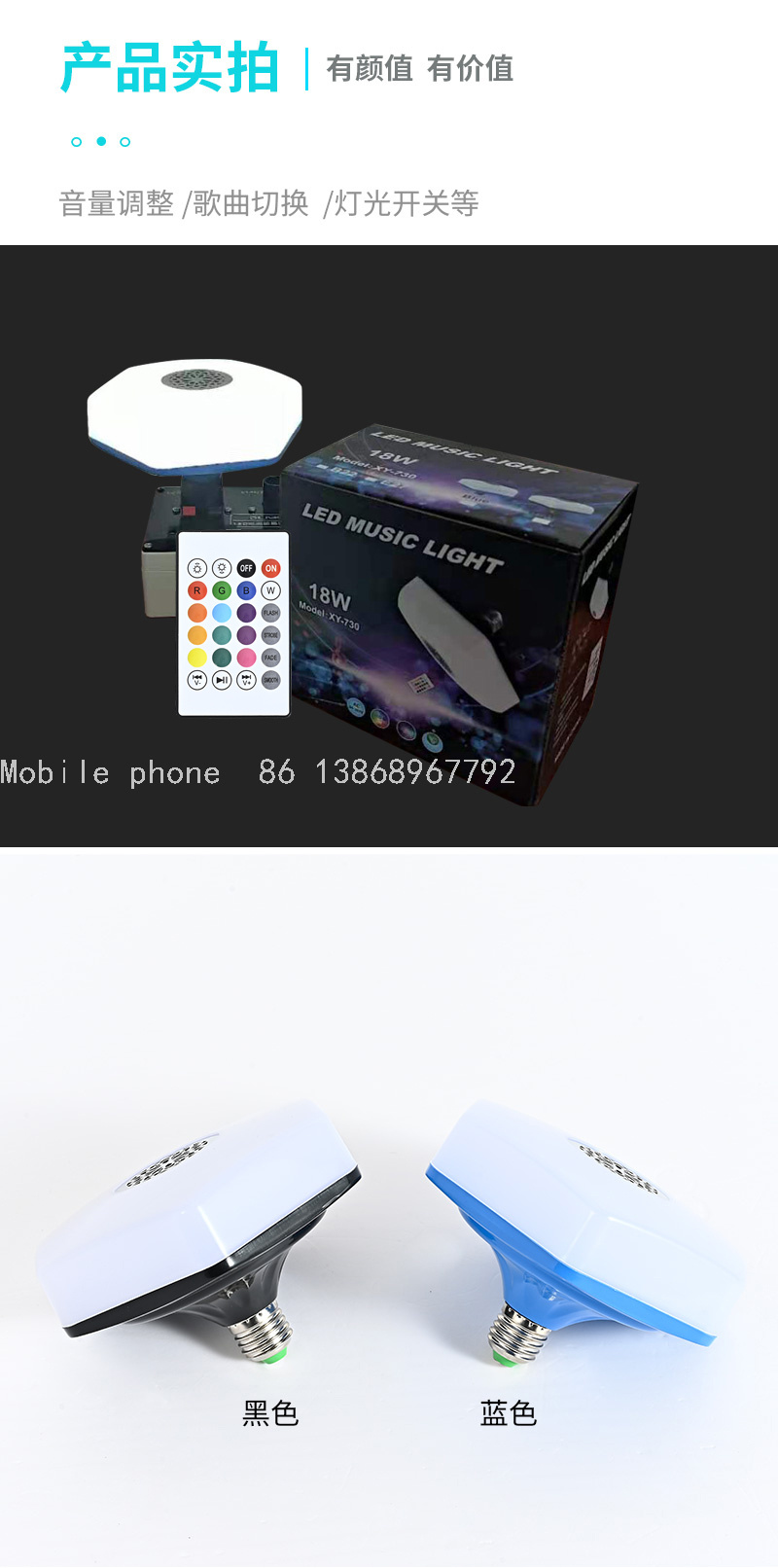 1.控制:手机蓝牙 遥控控制 2.功率:18瓦 3.播放:蓝牙连接 4.颜色:白光+RGB七彩 5.工作电压:85V·265V 6.外壳颜色:黑 蓝 7.配遥控器
