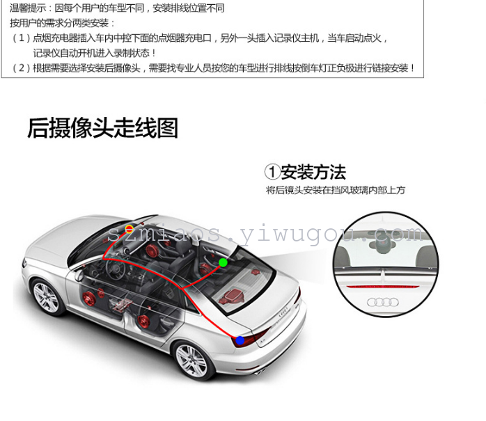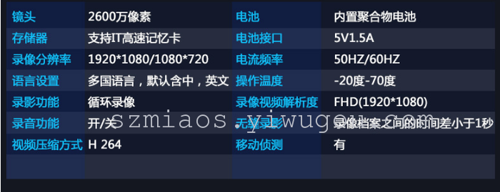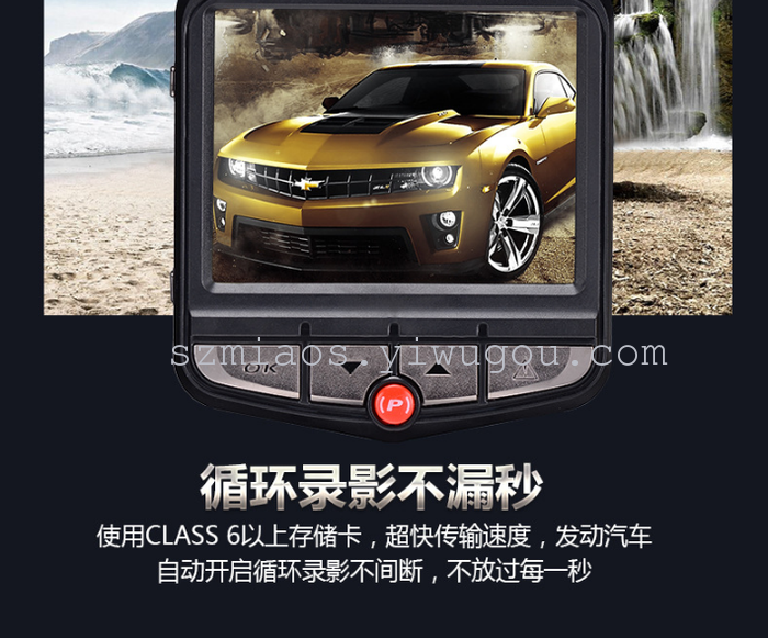 1)LCD屏幕尺寸: 2.4英寸 2) 1/3 500万 CMOS sensor 3) 视频分辨率:1920*1080(30帧数/秒) 4) 照片像素: 1200万 5)视频格式:MOV 6)电视输出:NTSC/PAL 7)机器输入电压电流:5伏 500毫安 8)Micro SD存储卡, 可最大支持32GB 9)内置 Mic/ speaker 10)菜单语言(可选):英//中 11)电池:内置锂聚合物电池 12) 接口: HDMI/USB 13)电脑系统要求: Windows 2000/XP/Vista 配件:车充、支架、说明书、USB线