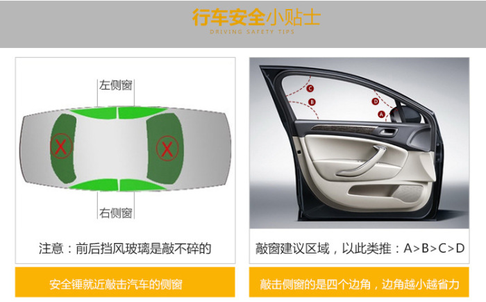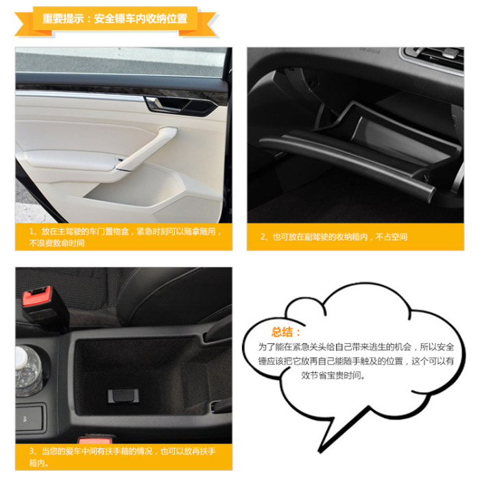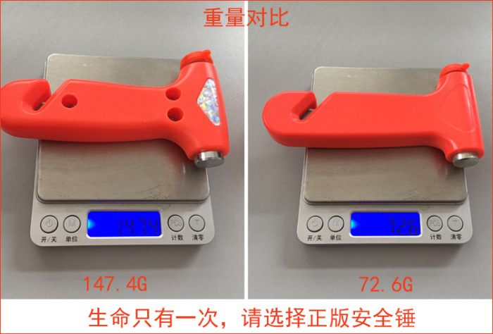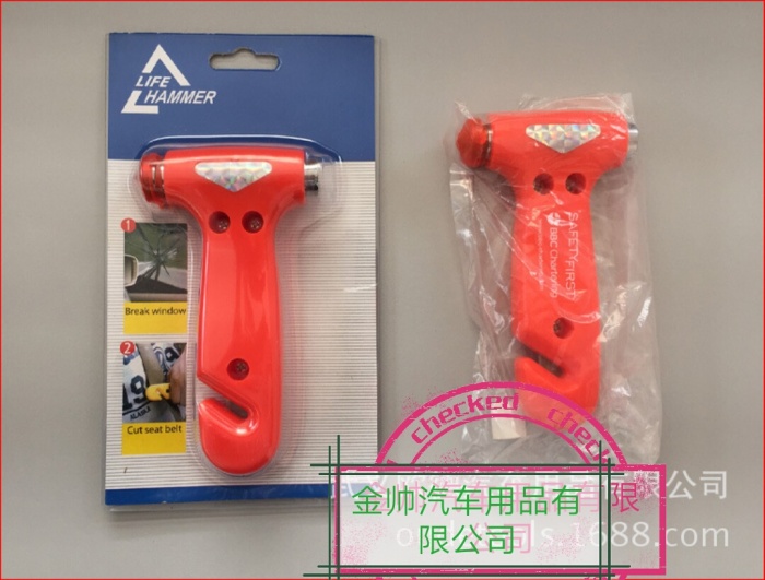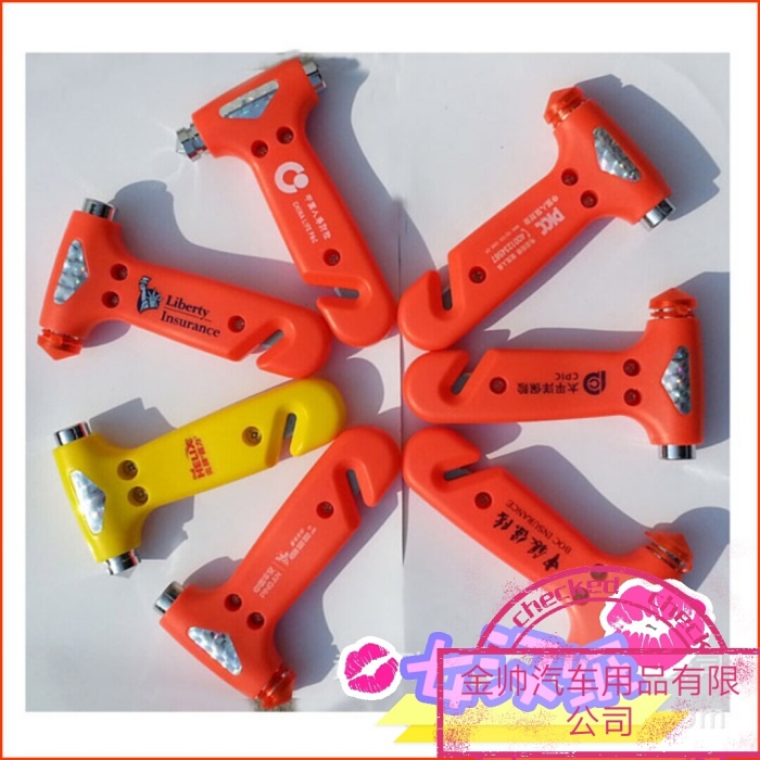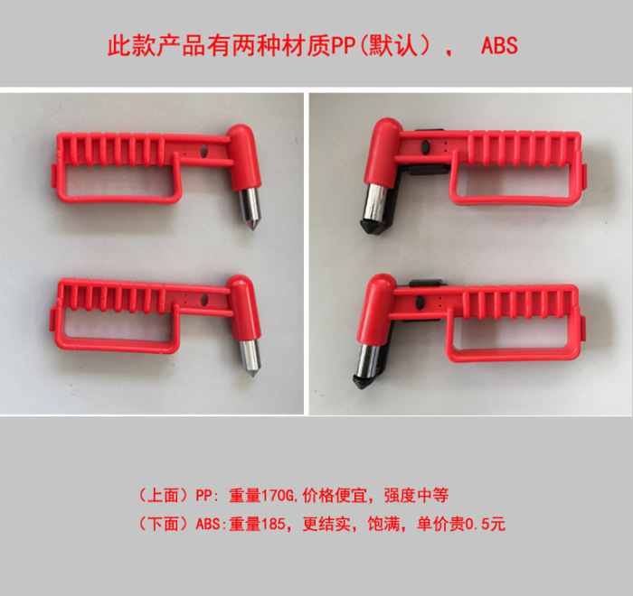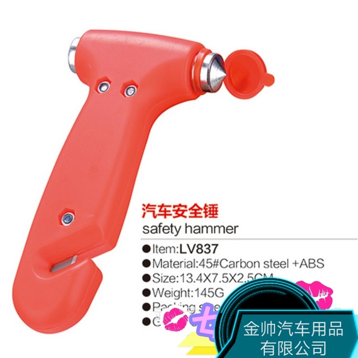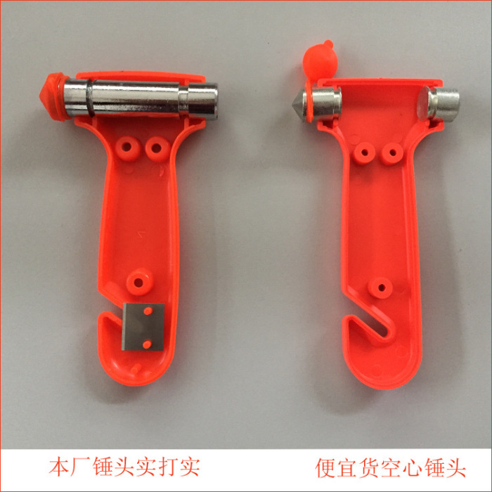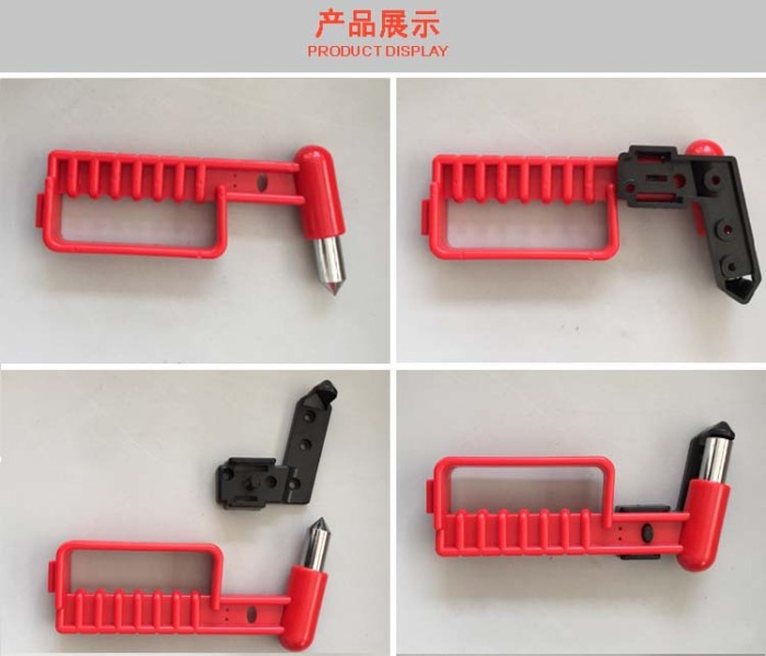 1、救生锤/安全锤:尖锐牢固的榔头,遇事故时打碎玻璃逃生。 2、割刀:钩状内嵌式刀片,遇事故时割断安全带逃生。 3、背后的平锤,可以做为榔头使用 产品规格: 锤子长度13cm 锤子宽度7cm 锤子厚度2.5cm