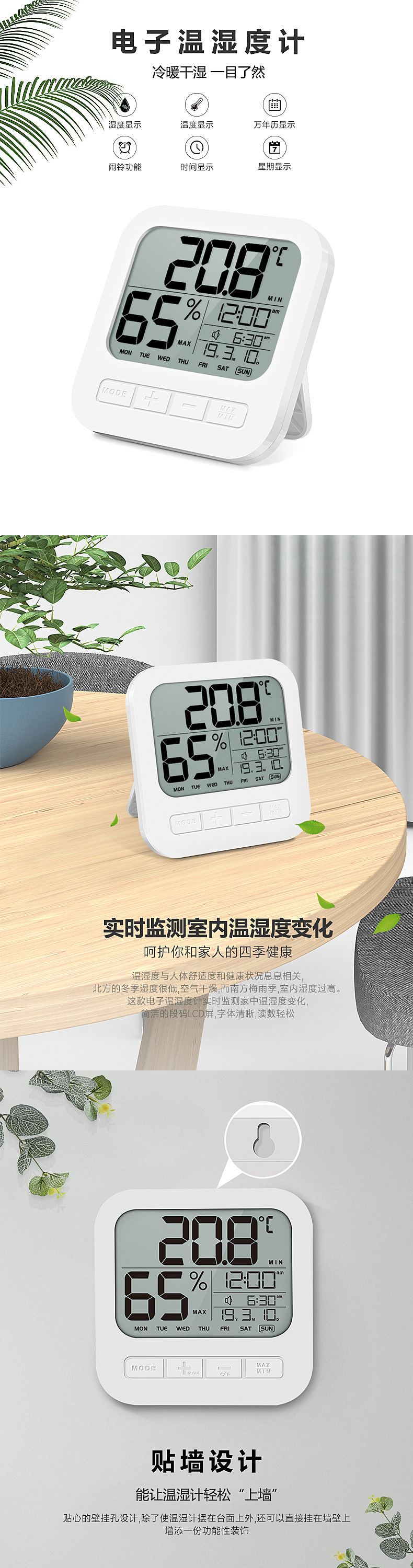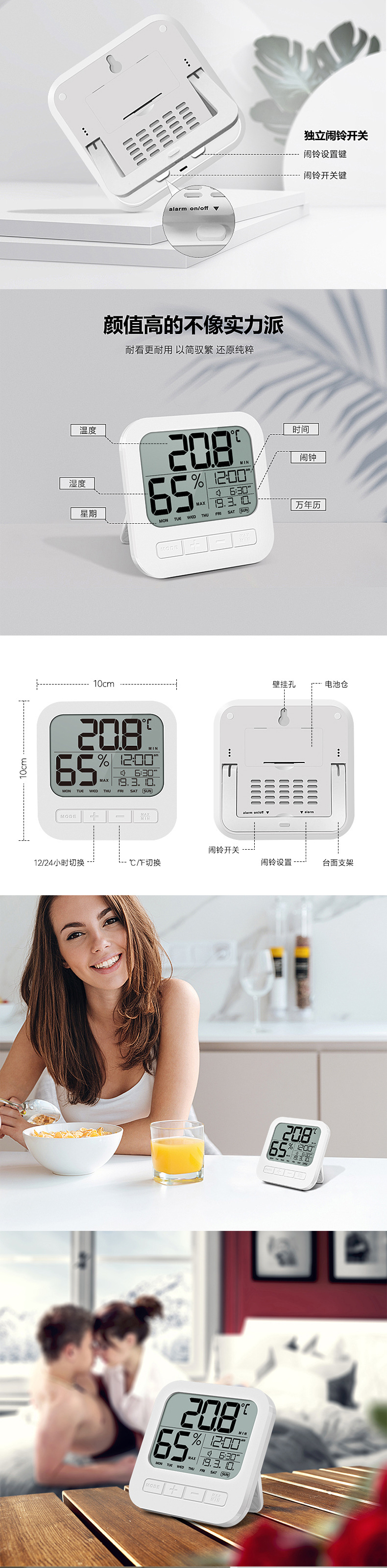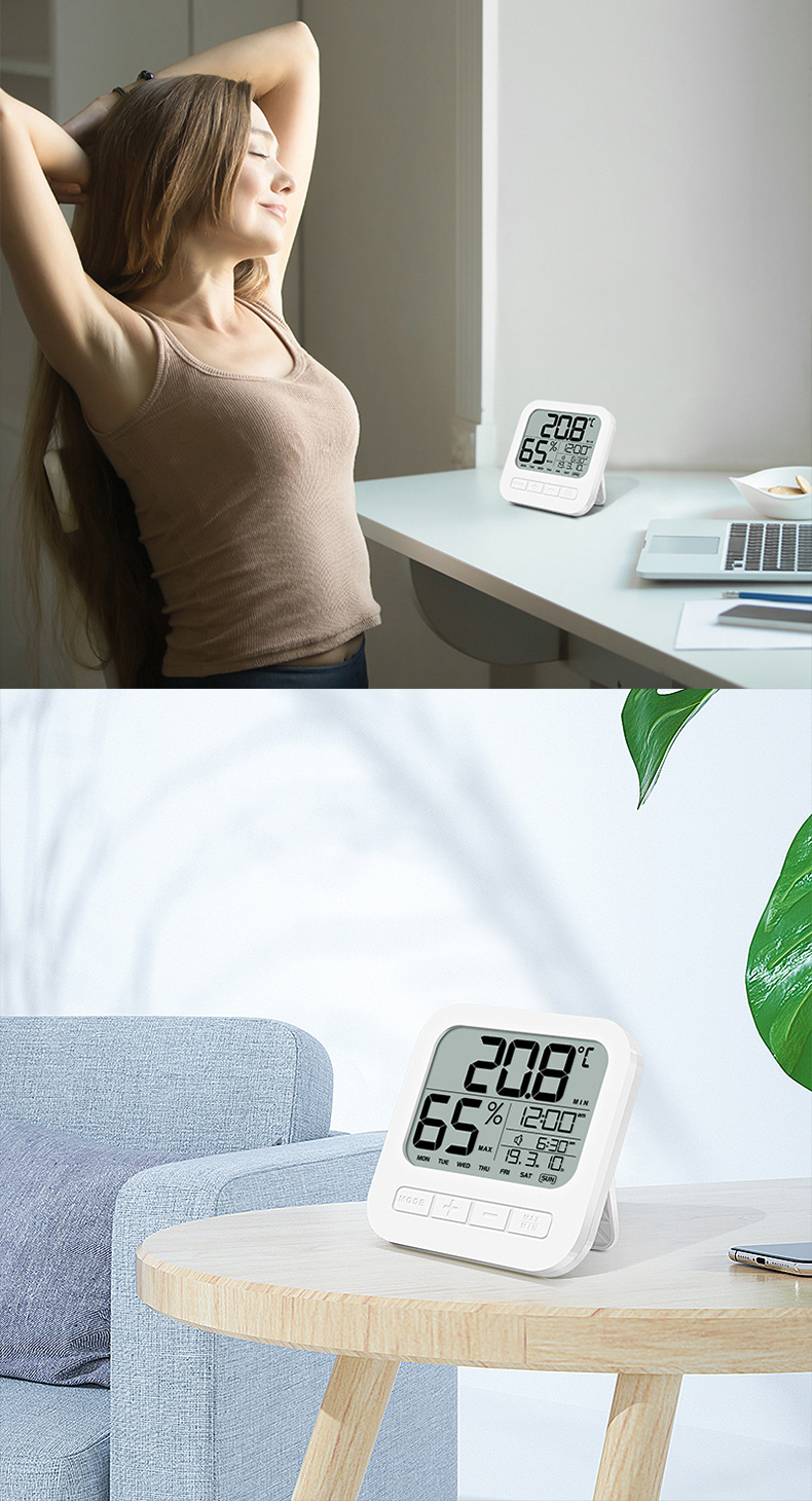 产品功能↓ 1.时间、星期、日期、闹铃时间同屏显示 。 2.室内温度和湿度显示。 3.每日最高/最低温湿度记录功能 4.2分钟闹钟及5分钟贪睡模式功能。 5.摄氏度/华氏度切换显示 6.12/24小时转换 7.立式或悬挂式 8.低电量提醒 9.电池型号:2XAAA(不含)