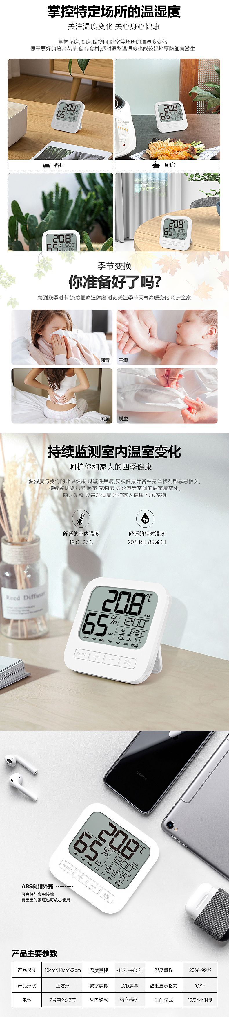 材质:全新ABS 包装:牛皮盒(内置珍珠棉包装+使用说明书) 温度范围:-10℃~50℃ 温度精确度:+-1℃ 湿度范围:20%-99% 湿度精确度:+-5%