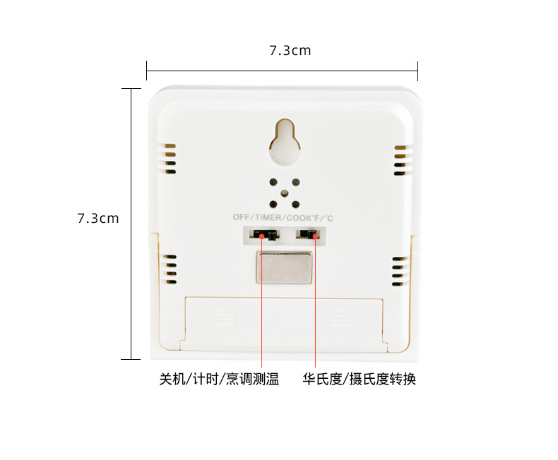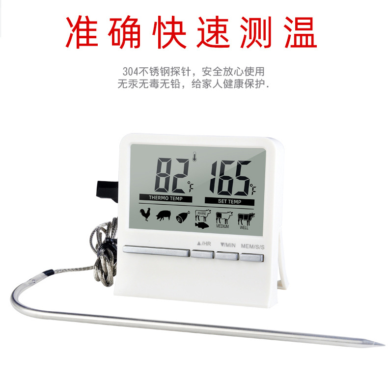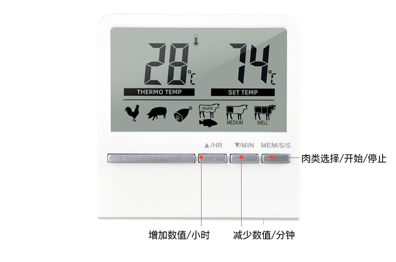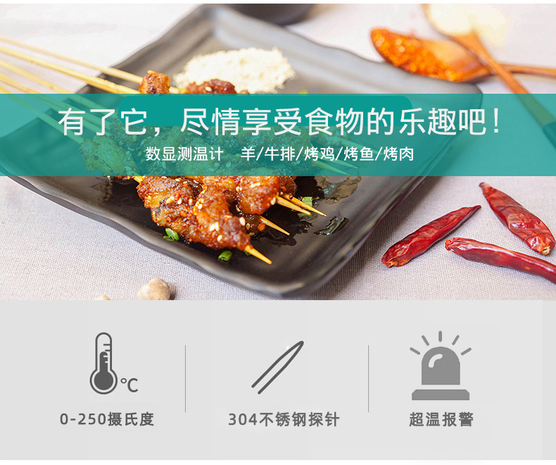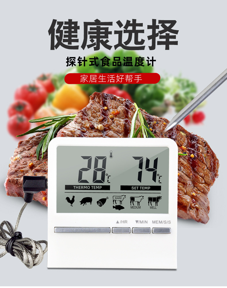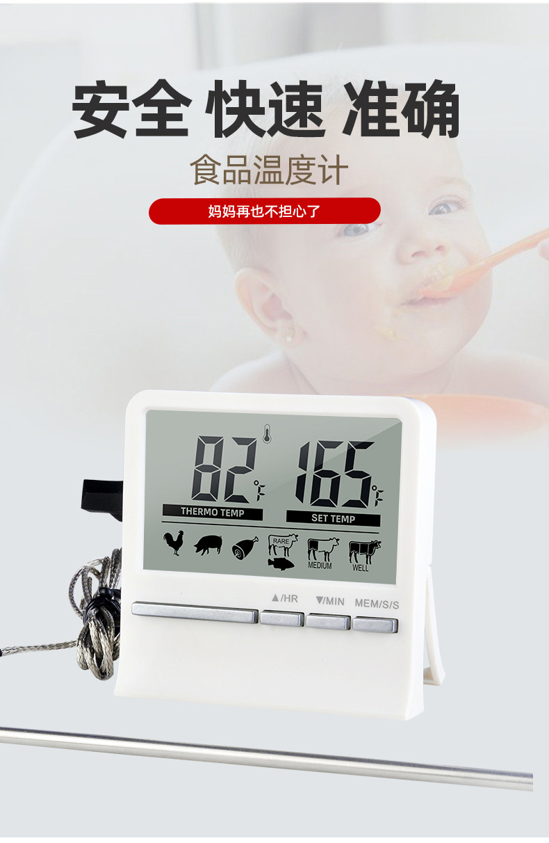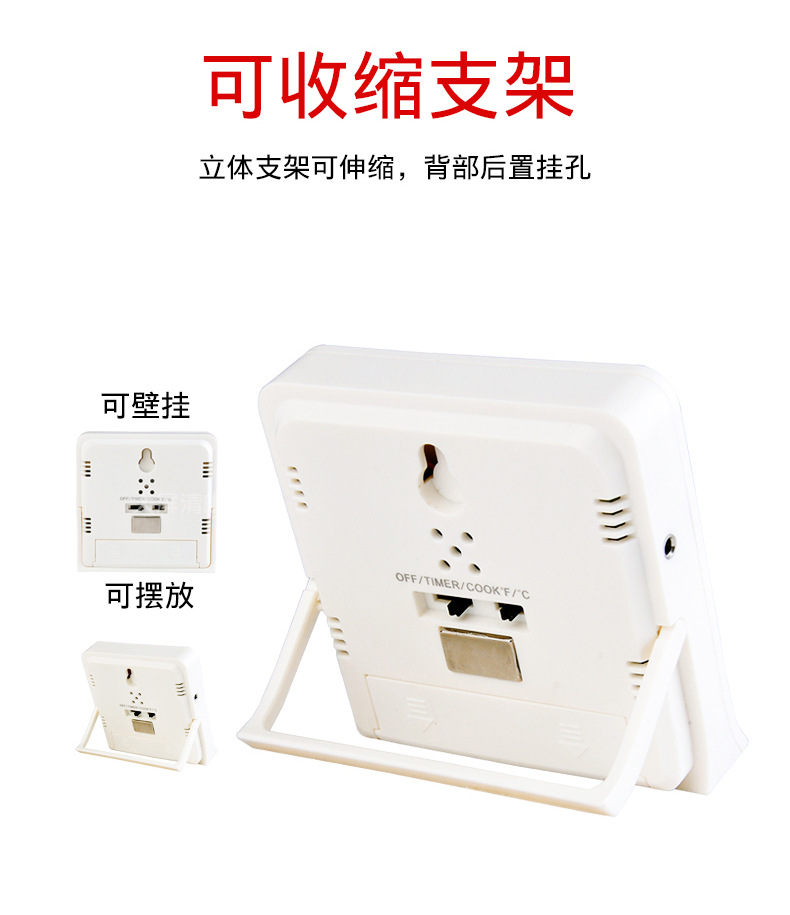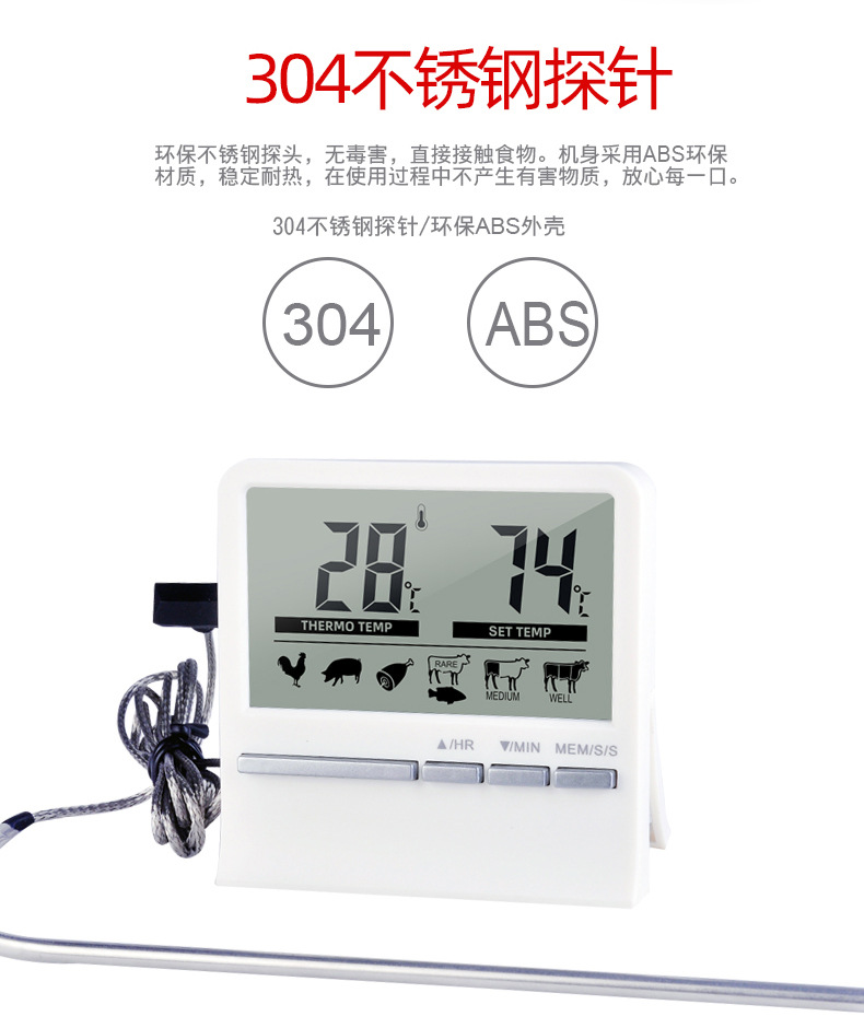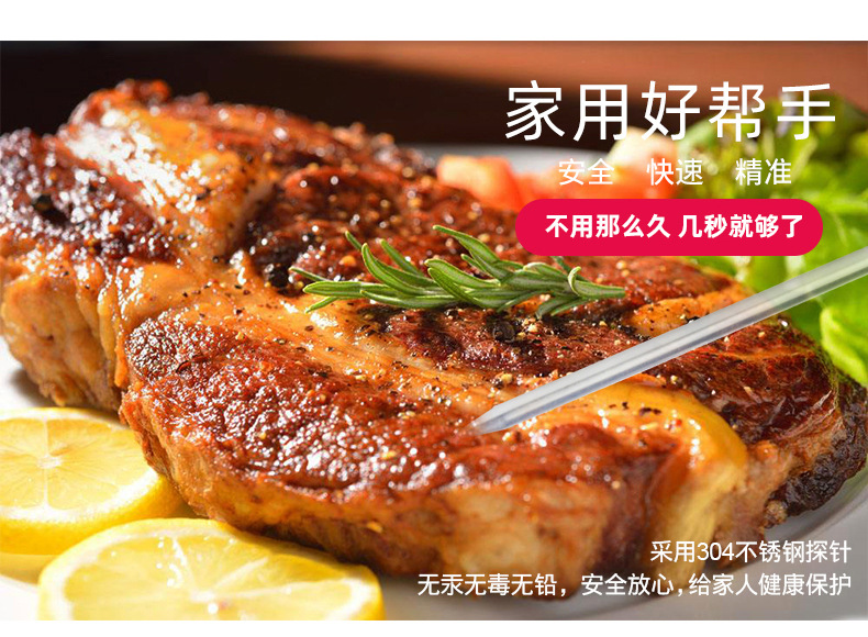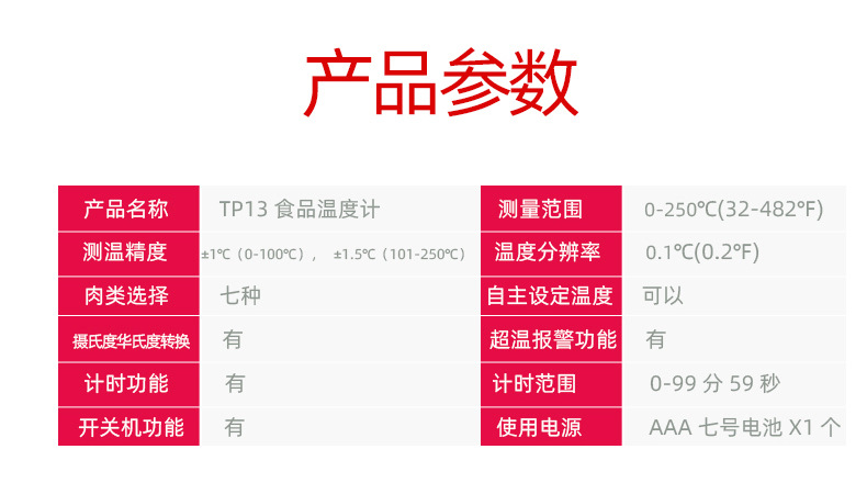▲测温范围:0-250℃(32-482℉) ▲显示分辨率:0.1℃/0.2℉ ▲精度: ±1℃(0℃-100℃), ±1.5℃(101℃-250℃) ▲可选择肉类:七种 ▲℃/℉转换 ▲计时范围:99小时59分 ▲开/关机 ▲外壳材料:ABS工程塑料 ▲探针材料:304不锈钢 ▲探针直径:4mm,垂直长度:175mm ▲探针钢网线长度:1米 ▲使用电池:七号AAA电池X1个 ▲测温速度:4-5秒 ▲放置方式:支架/悬挂/磁铁吸附