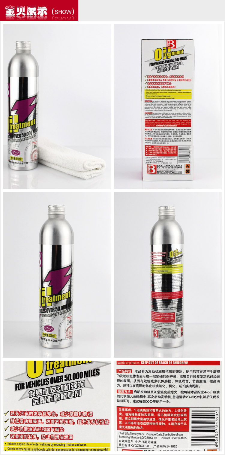 本品采用国际配方、专为保护发动机而研制,具有特强的减磨、抗磨的神奇功能,使用后可在易产生磨损的发动机缸体表面形成一层坚硬的保护膜,能够自行修复发动机已经磨损的表面,从而有效地减少机件磨损,降低噪音,节省燃油,提高动力,还可以在高温时防止机油氧化、稠化,延长换油周期。