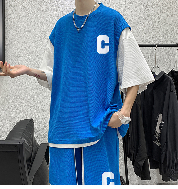 Traje de ropa deportiva de ocio falso de dos piezas, pantalones cortos para niños, mangas cortas, un conjunto de tendencia relajada de verano, todo tipo de ropa masculina rufián y guapo.