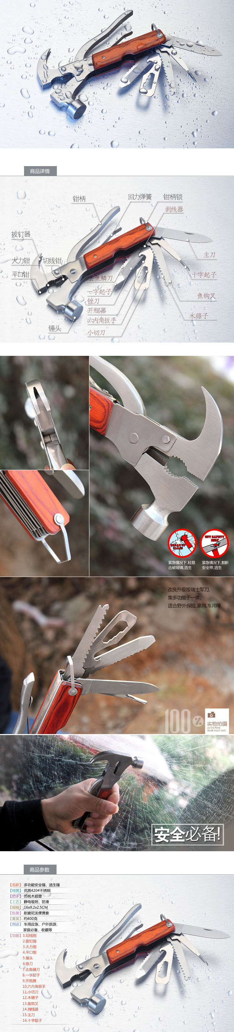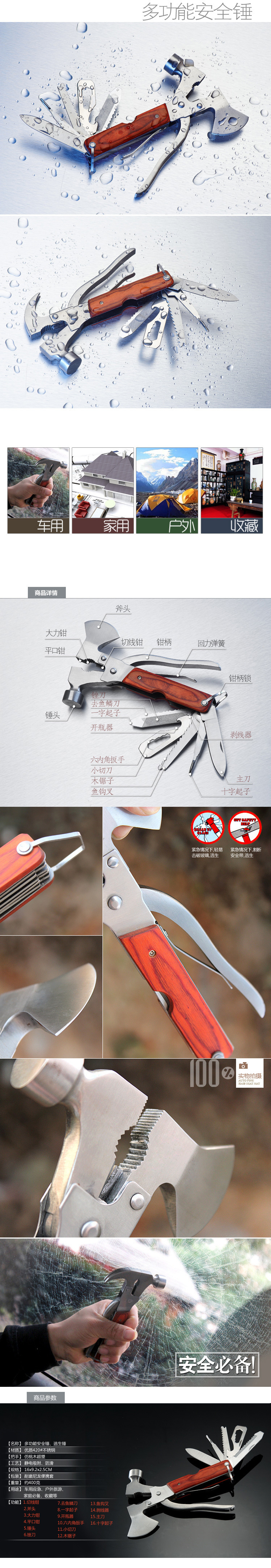 因为汽车一旦掉入水里,在车外河水的强大的压力下,车内的人是无论如何推不开车门的。几分钟后,即便车内的氧气没有消耗殆尽,从缝隙里涌进的水顷刻也会使里面的乘客面临灭顶之灾。如果这时有一柄救生锤子,,敲破车玻璃窗,从里面逃出来。因此有了救生锤,逃生就有绝大的希望!!! |