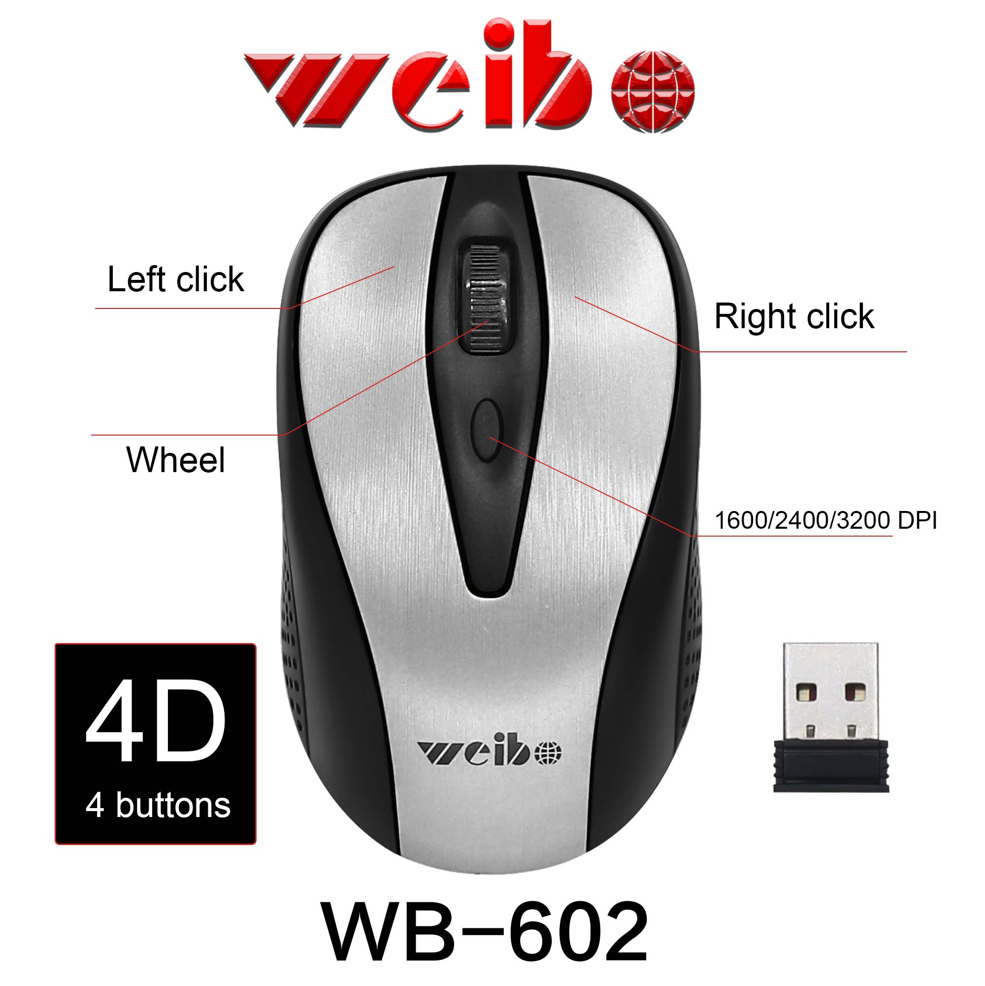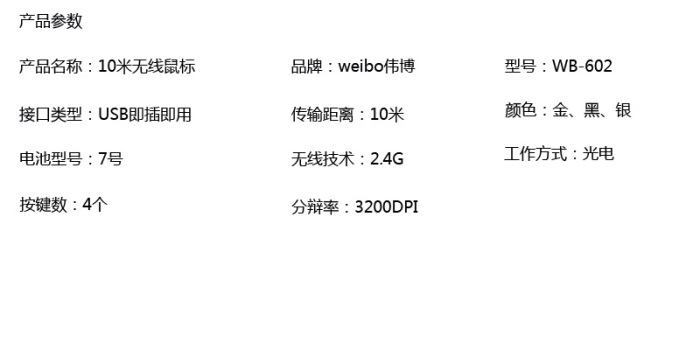 产品说明: *2.4G10米无线光学鼠标 *无线迷你接收器,即插即用 *接收器可藏于鼠标插孔 *电源开关和节电模式 *分辨率:1600&2800DPI可调节高精度扫描速度