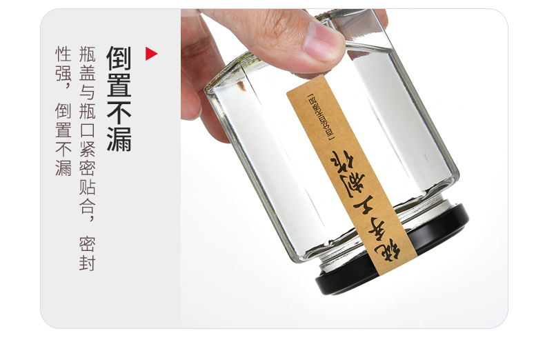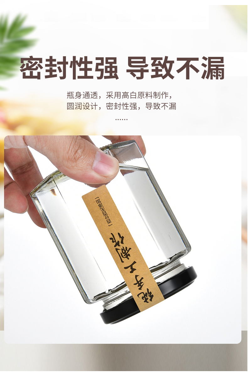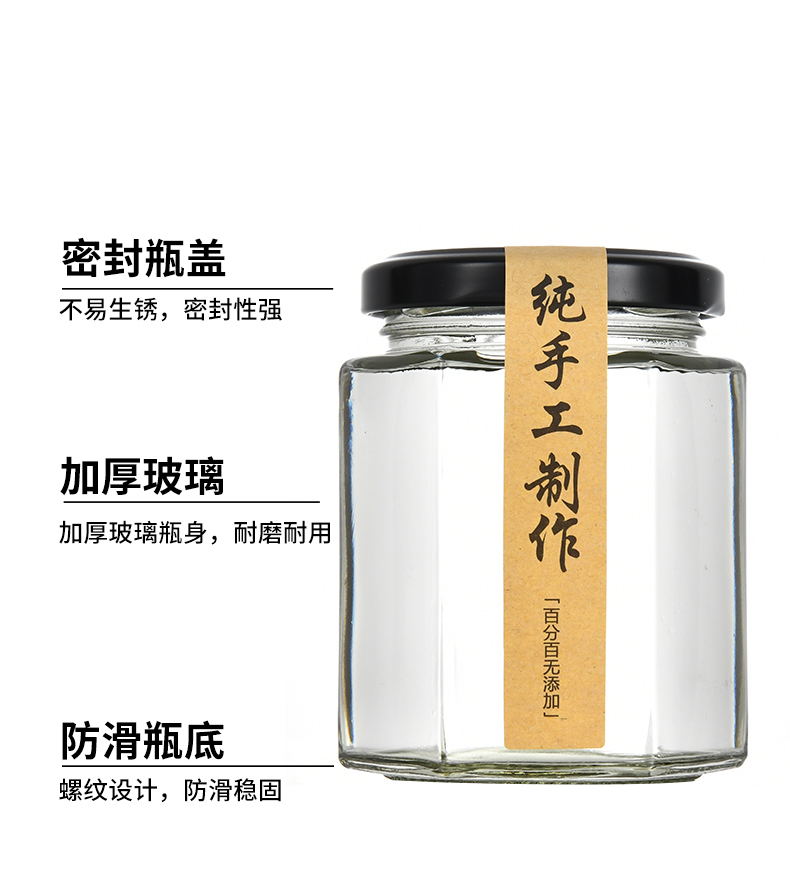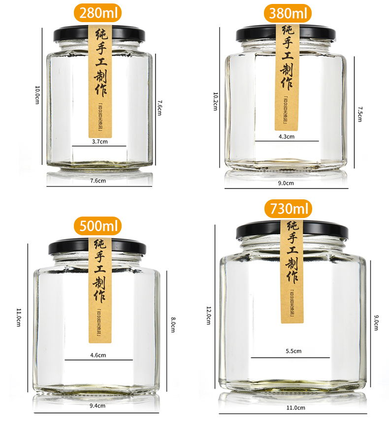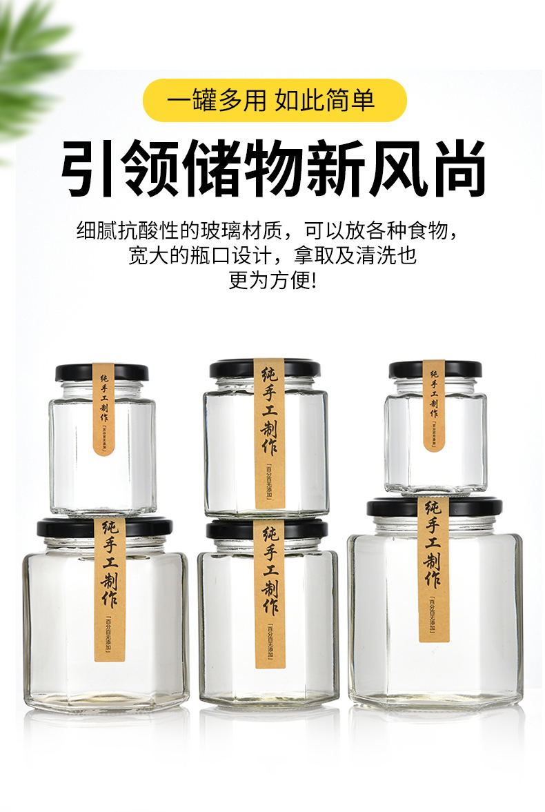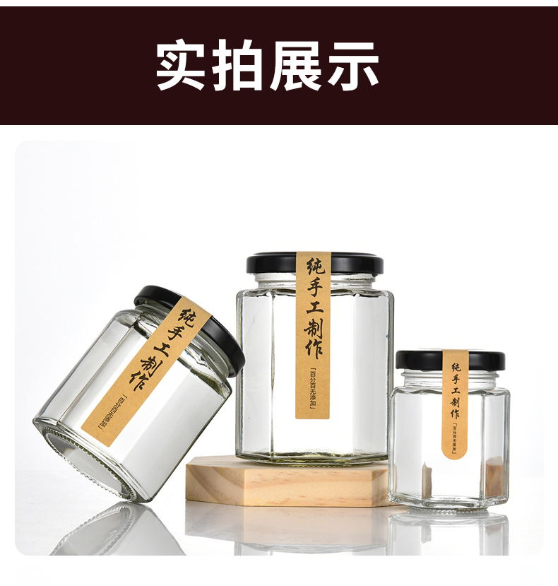 Botella de vidrio con tapa de miel, pimienta enlatada, salsa, botella de alimentos hexagonales y hexagonales, latas transparentes y pequeñas selladas vacías