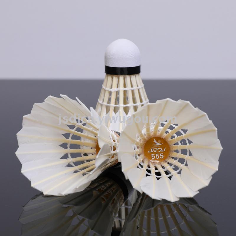 型号: 江山燕555 毛片:鸭毛大方 球头:双拼球头 辅料:胶水 做工精细飞行稳定,耐打性好,球头的手感极佳。 飞行速度:77 /76, 重量:5.0 装箱:50筒一箱。