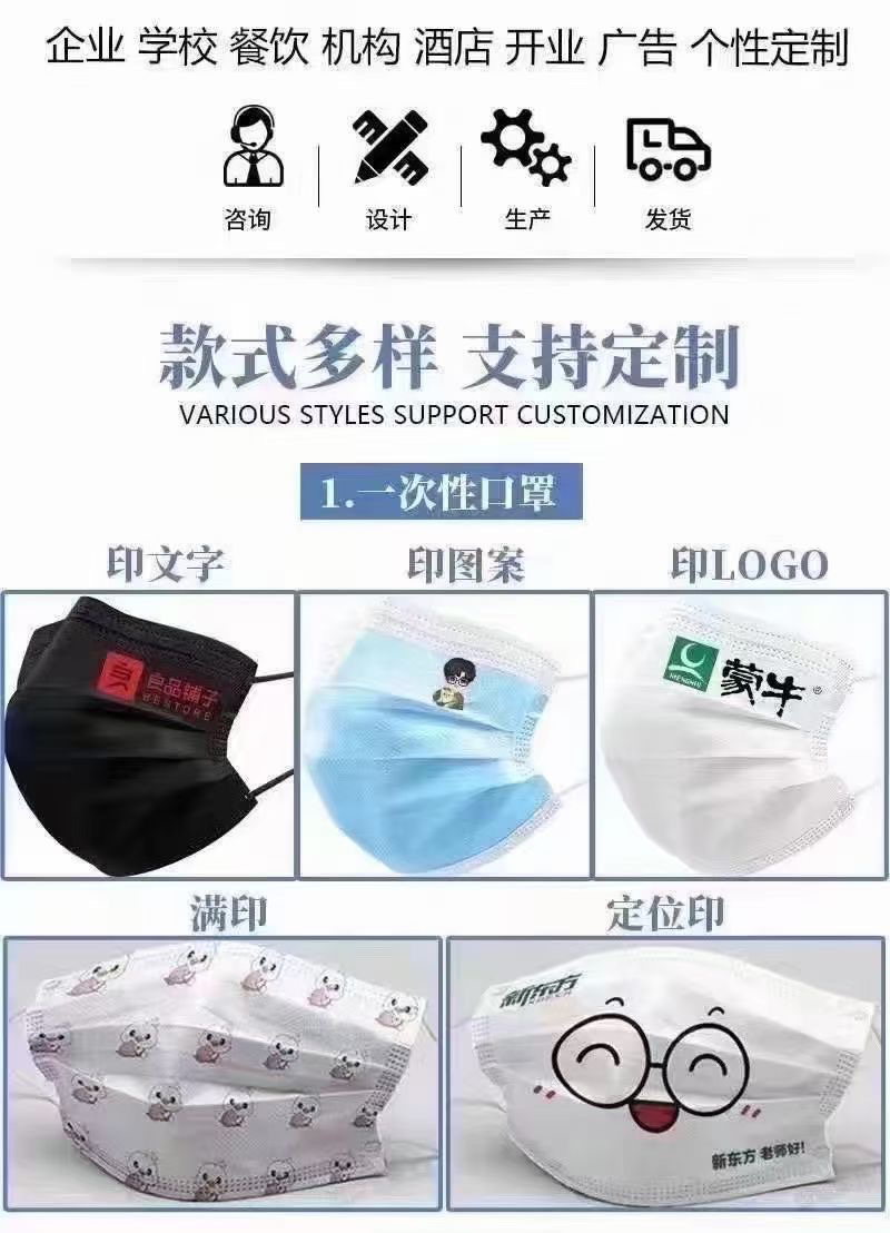 Después de la autorización de la empresa, se pueden personalizar las máscaras desechables y personalizar los patrones de dibujos animados del logotipo de la empresa.