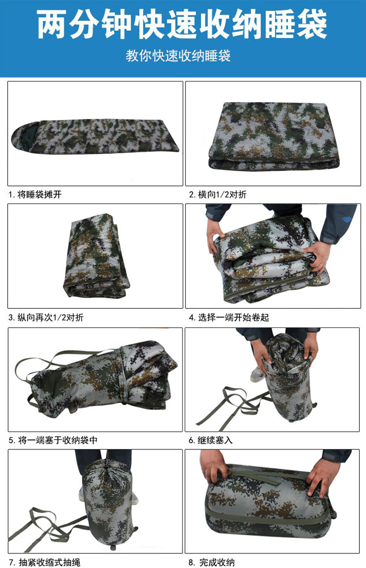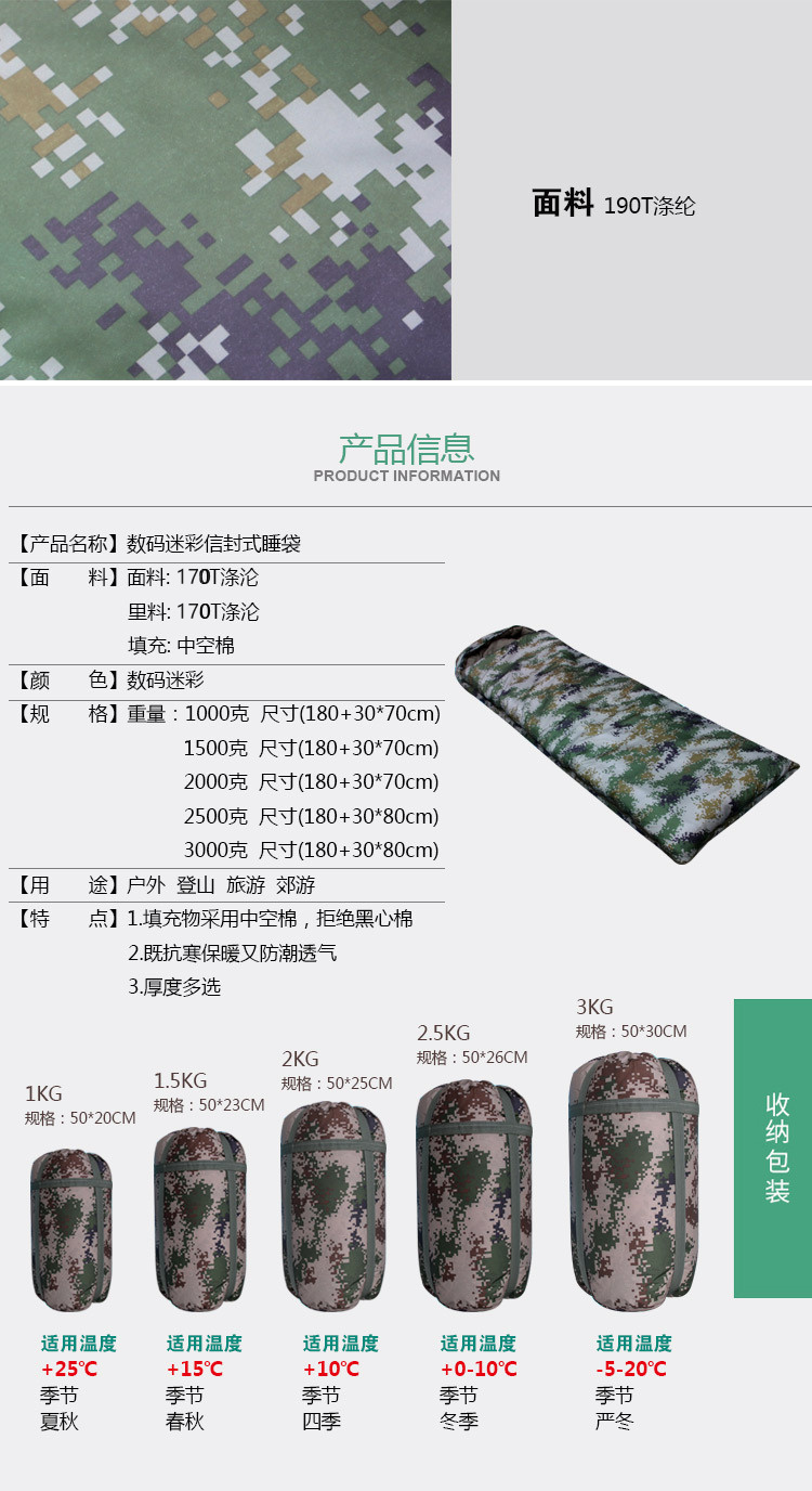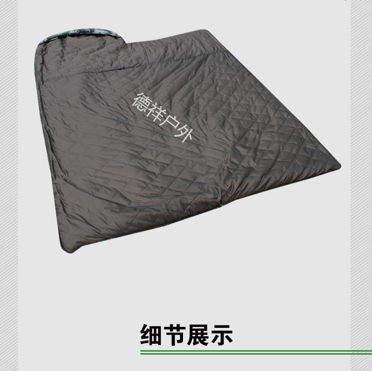 产品名称:1.3KG秋冬便携挎包型户外野营信封带帽迷彩睡袋