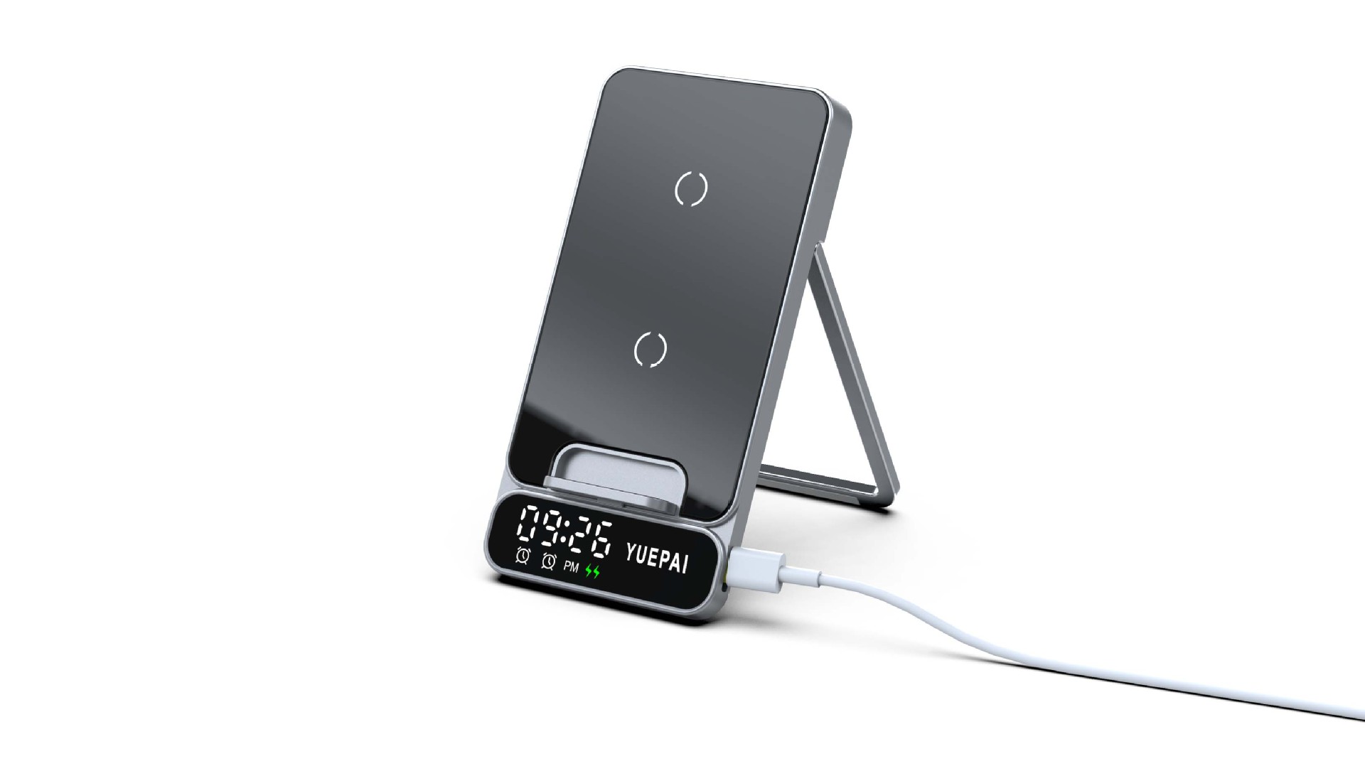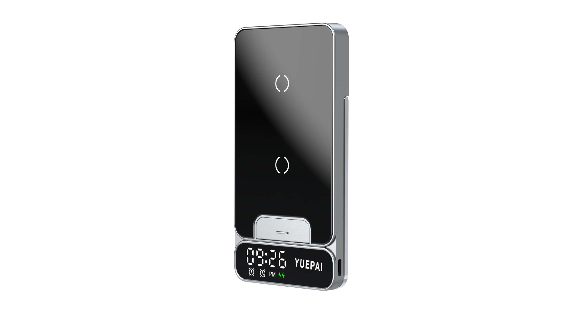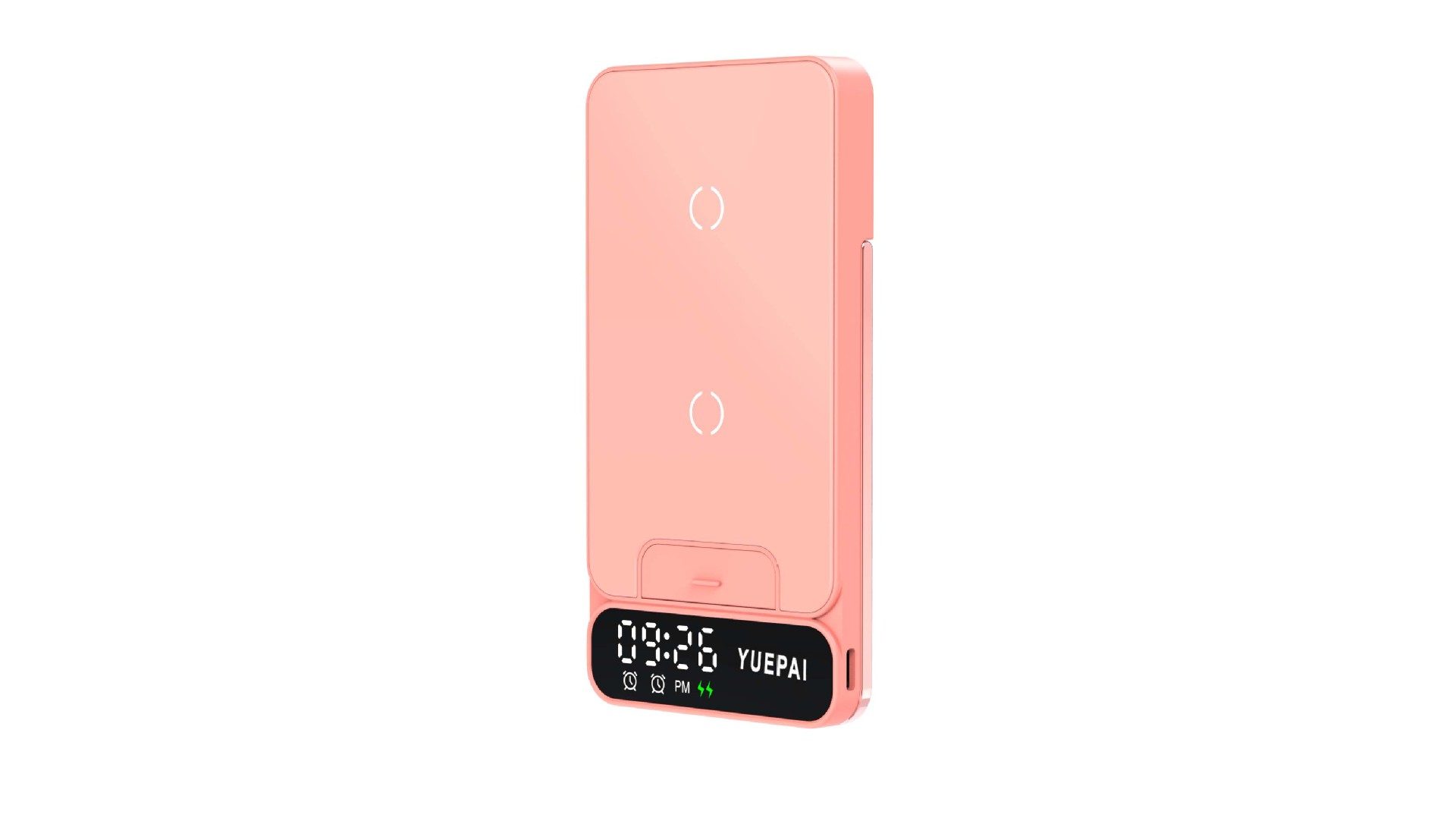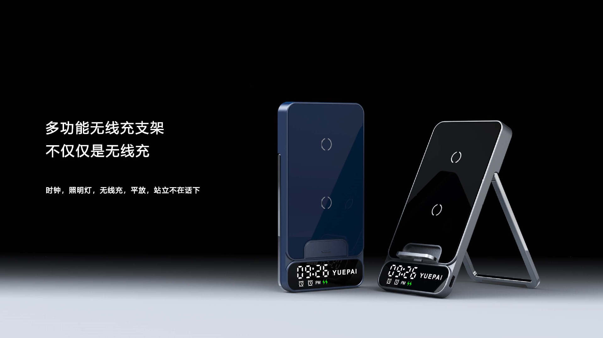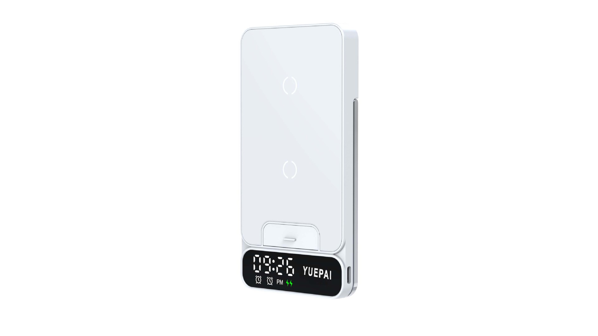 产品特性: u 支持全系自带无线充电技术手机充电,功率最大支持15W u 手机支持横放竖放,让你在不同情景使用不同方式充电 u 自带闹钟24h制,轻松设置自我需求 u 背面自带LED放夜晚不再惧怕黑暗