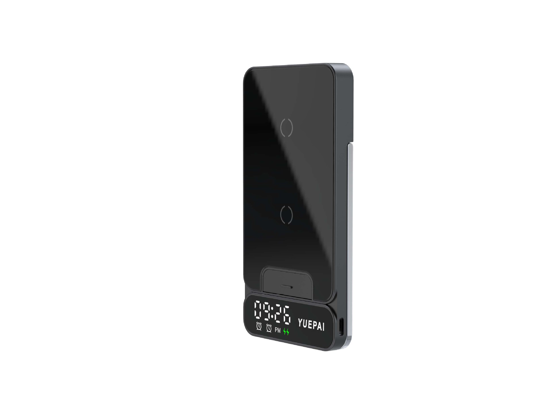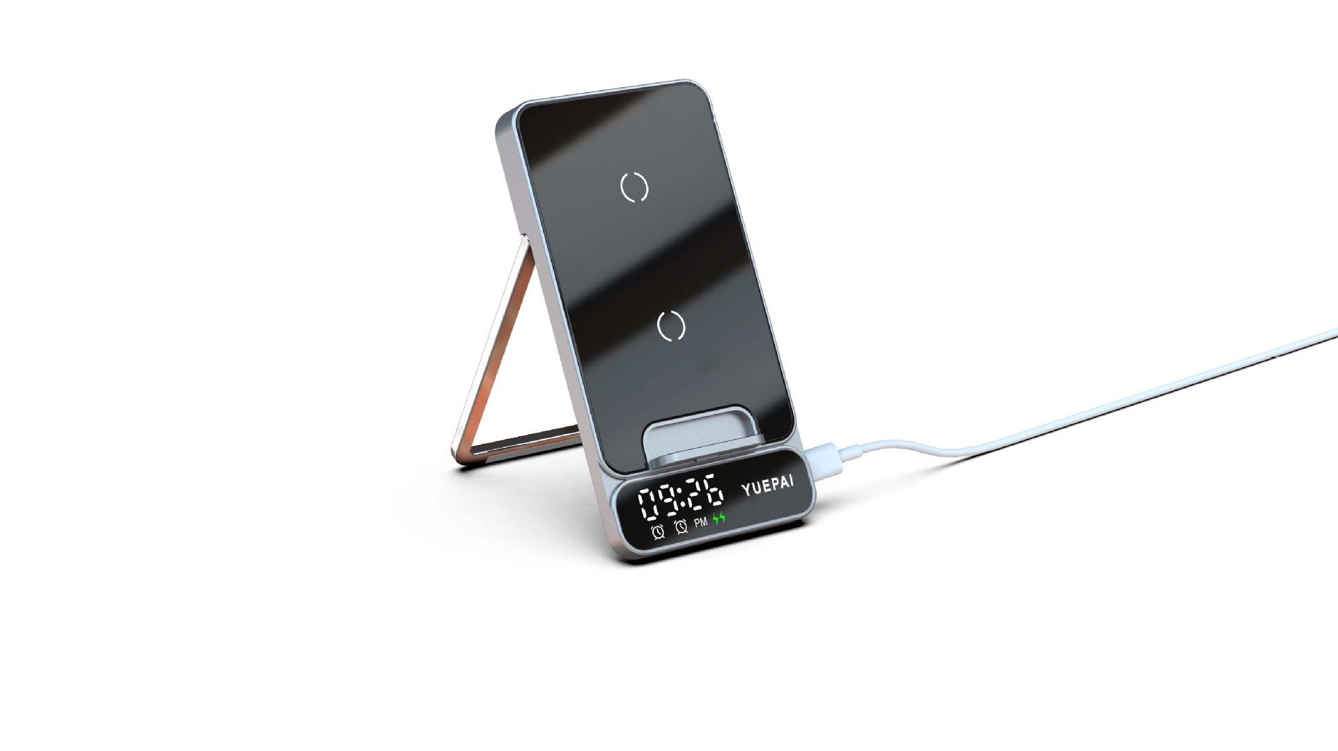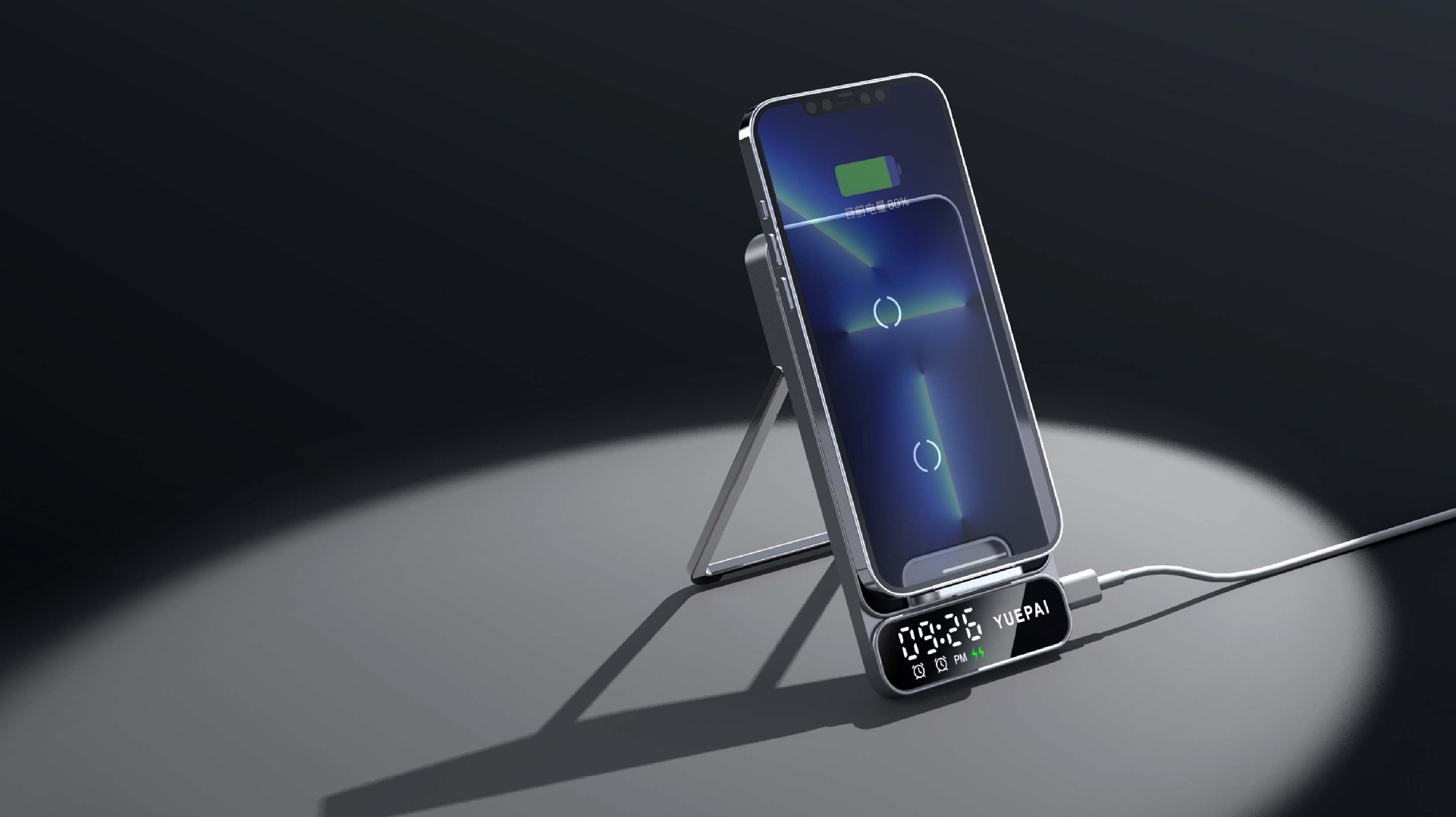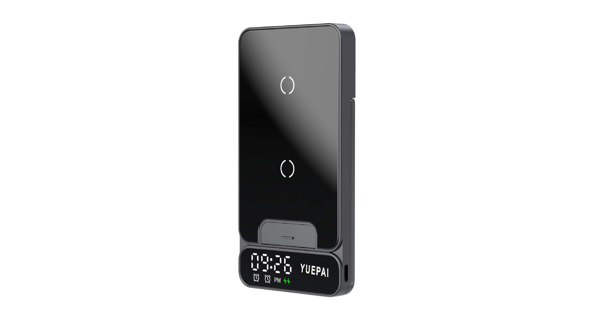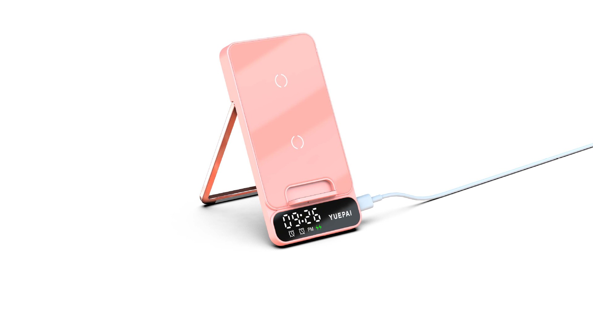 产品特性: u 支持全系自带无线充电技术手机充电,功率最大支持15W u 手机支持横放竖放,让你在不同情景使用不同方式充电 u 自带闹钟24h制,轻松设置自我需求 u 背面自带LED放夜晚不再惧怕黑暗