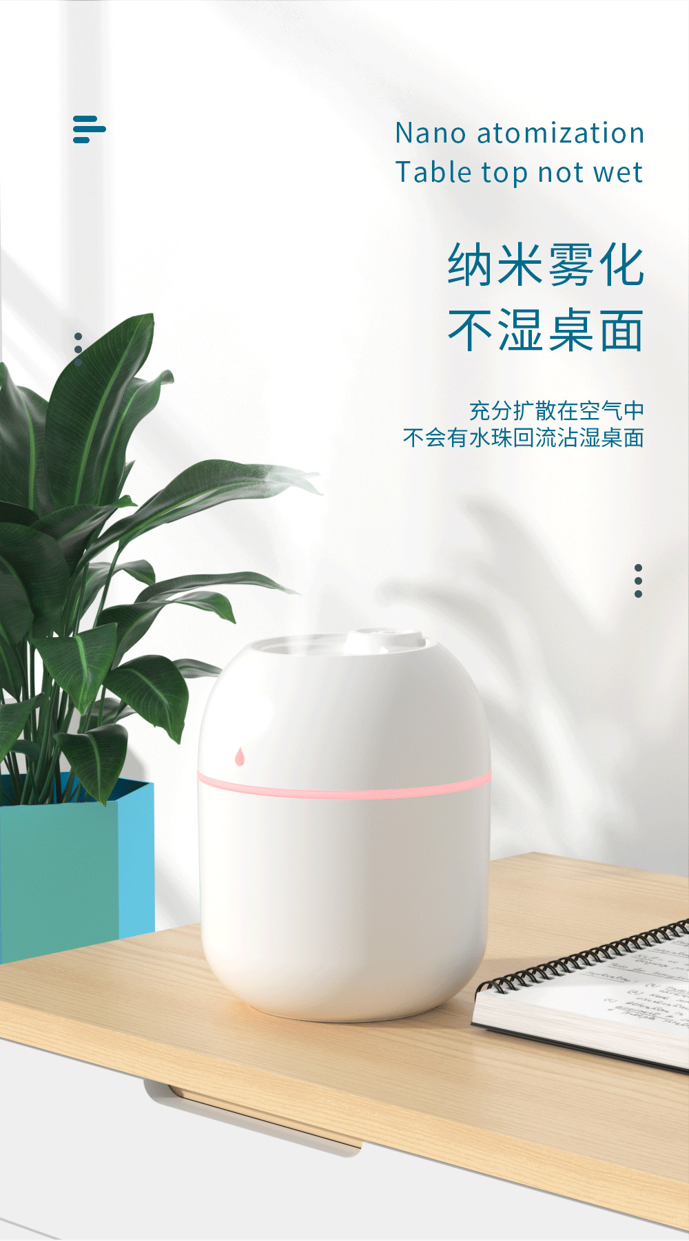 产品参数 输出接口: DC5V/1A 额定功率: 2W 输入接口: DC5V/0.4A 产品容量: 220ML 喷雾量: 25-40ML/H 喷雾模式: 持续/间隙 适用水质: 矿泉水/自来水 产品标配 加湿器1台,数据线1条,中英文说明书加合格证1张,棉芯1根
