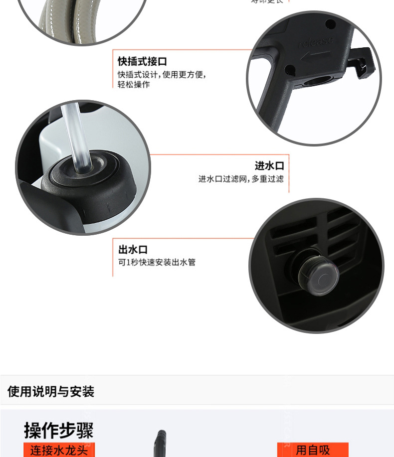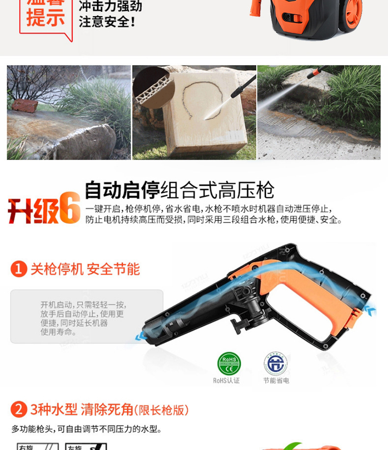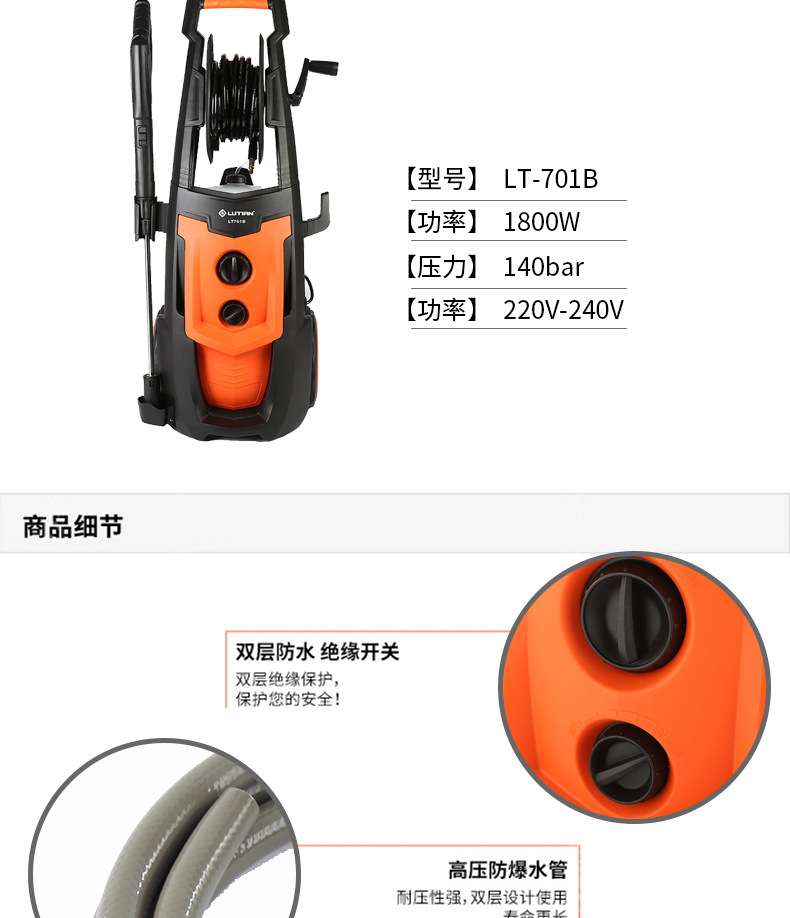 新款绿田LT304-1400小型家用清洗机 洗车机 伏特/频率:AC120-127V-50/60Hz 电机类型:电动机碳刷 电机功率:1400W 额定压力:80bar 最大压力:110bar 额定流量:5.5L/min 最大流量:6.5L/min 产品尺寸:332*264*681mm 纸箱尺寸:300*280*480mm 净重:5.9/6.8kgs