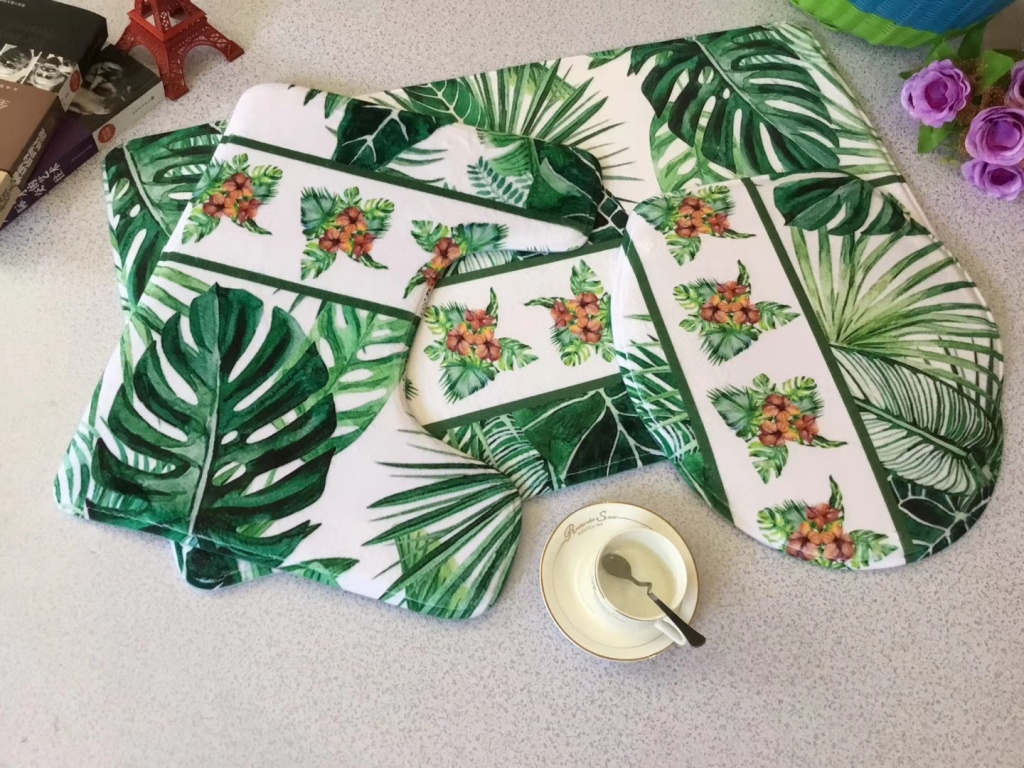 Estampado de franela de tres piezas, alfombras, almohadillas verdes, baños, juegos de inodoros, almohadillas para los pies, fabricantes de almohadillas para las puertas