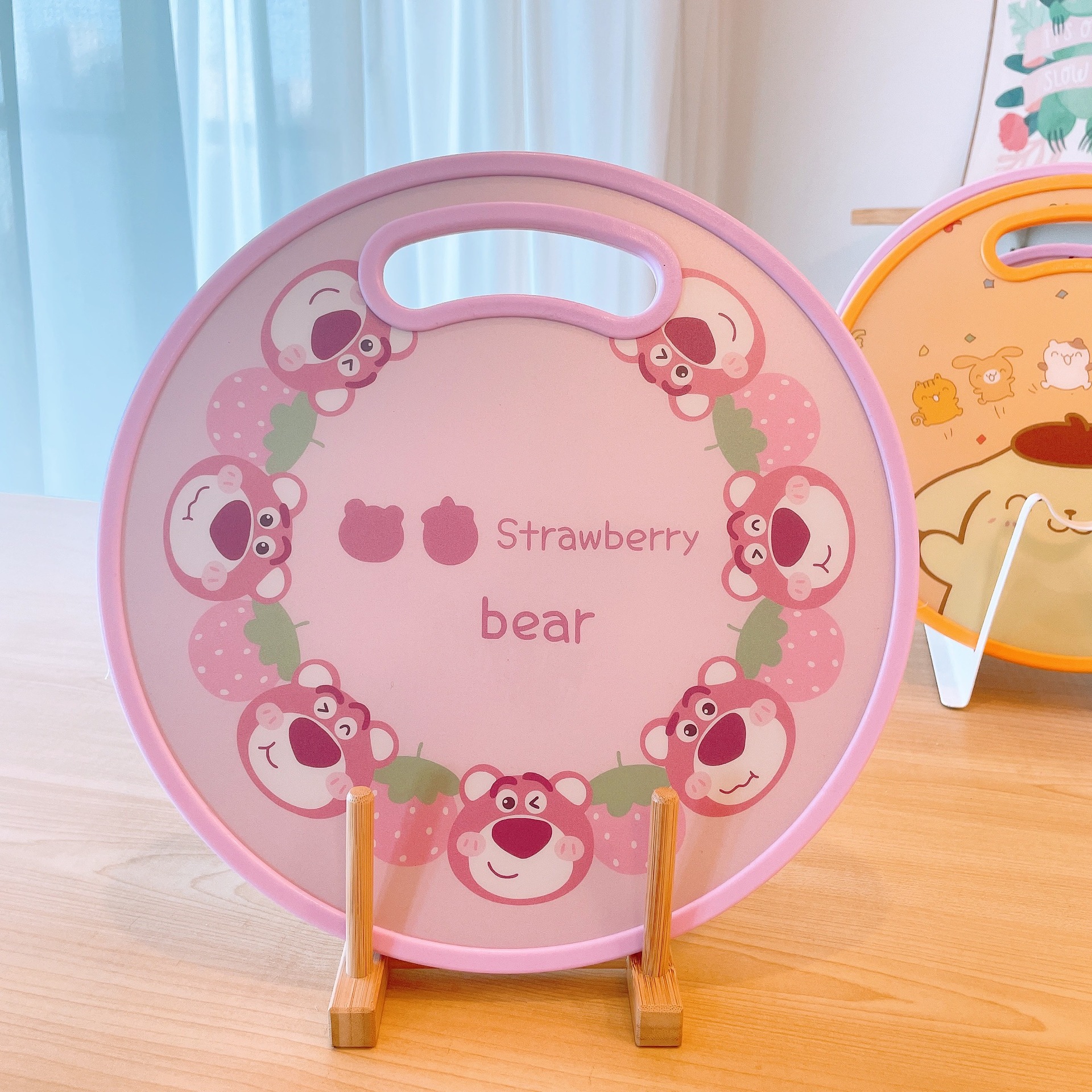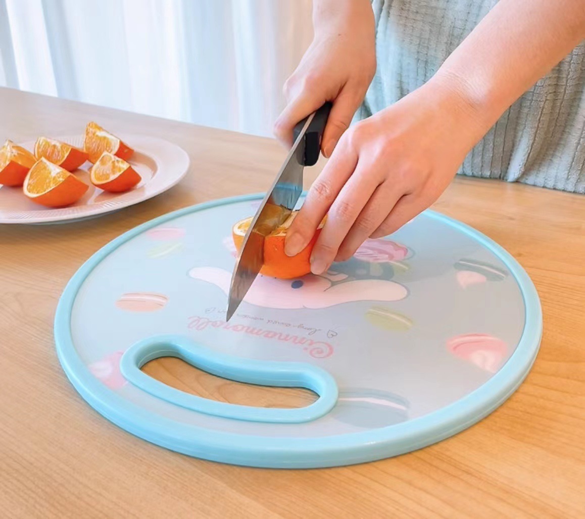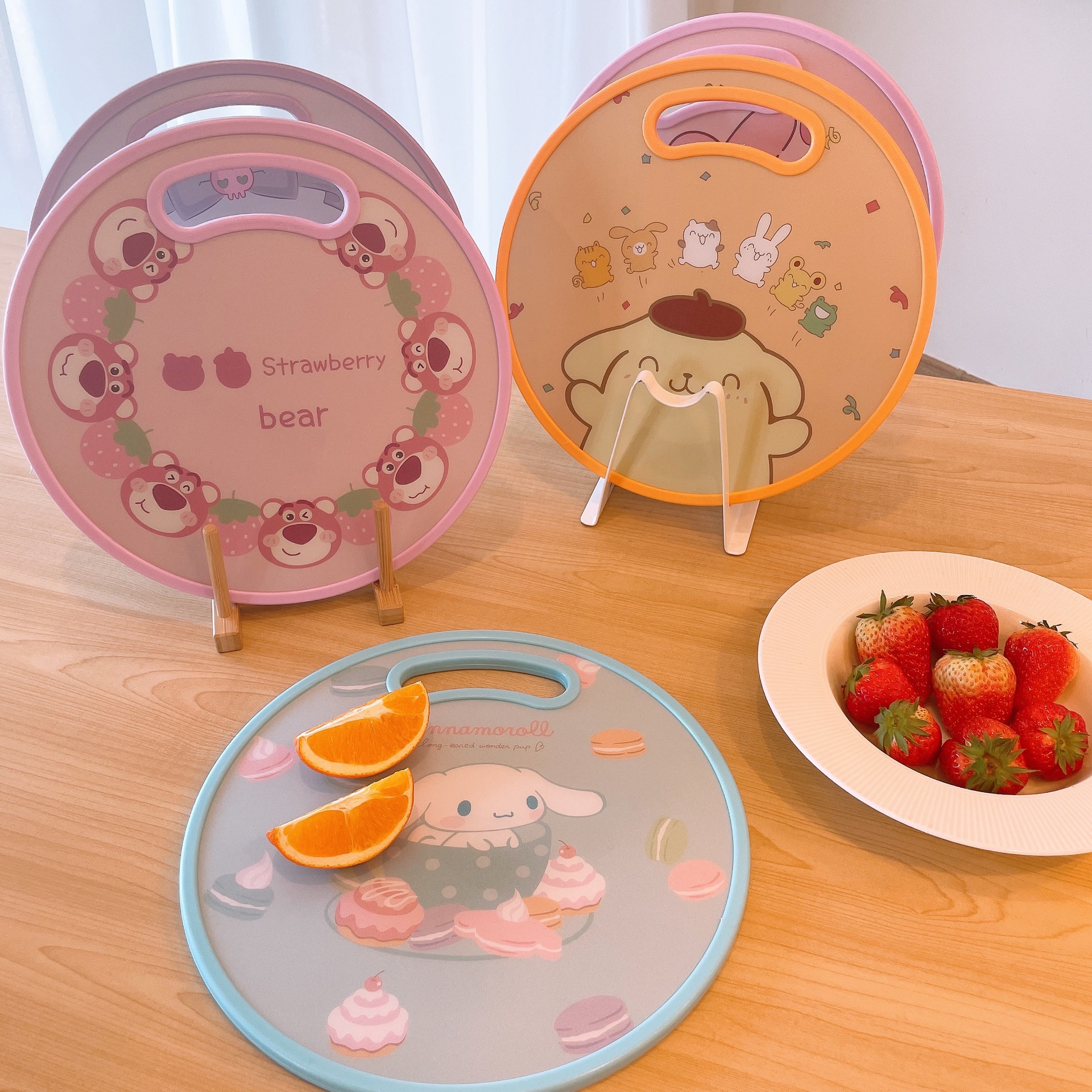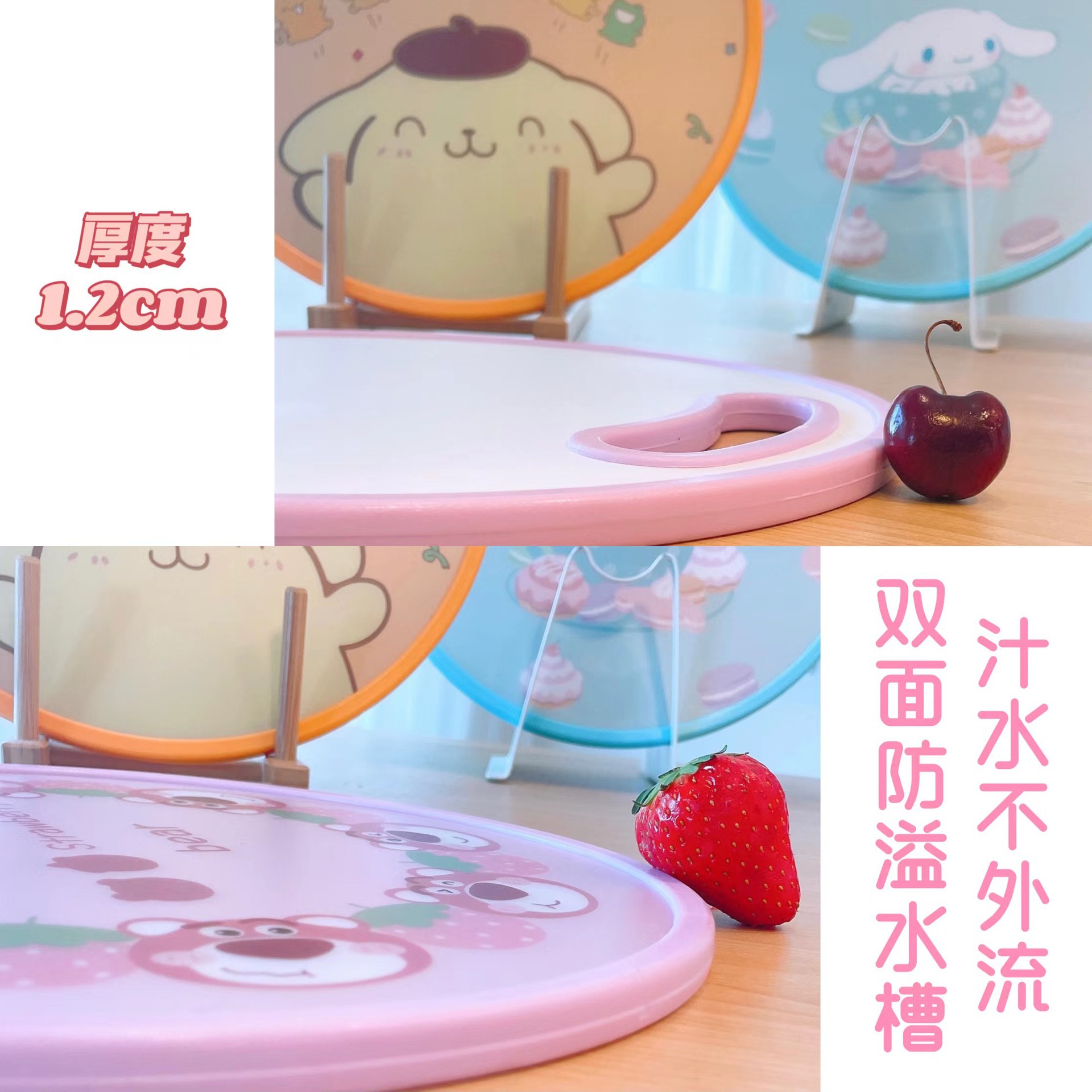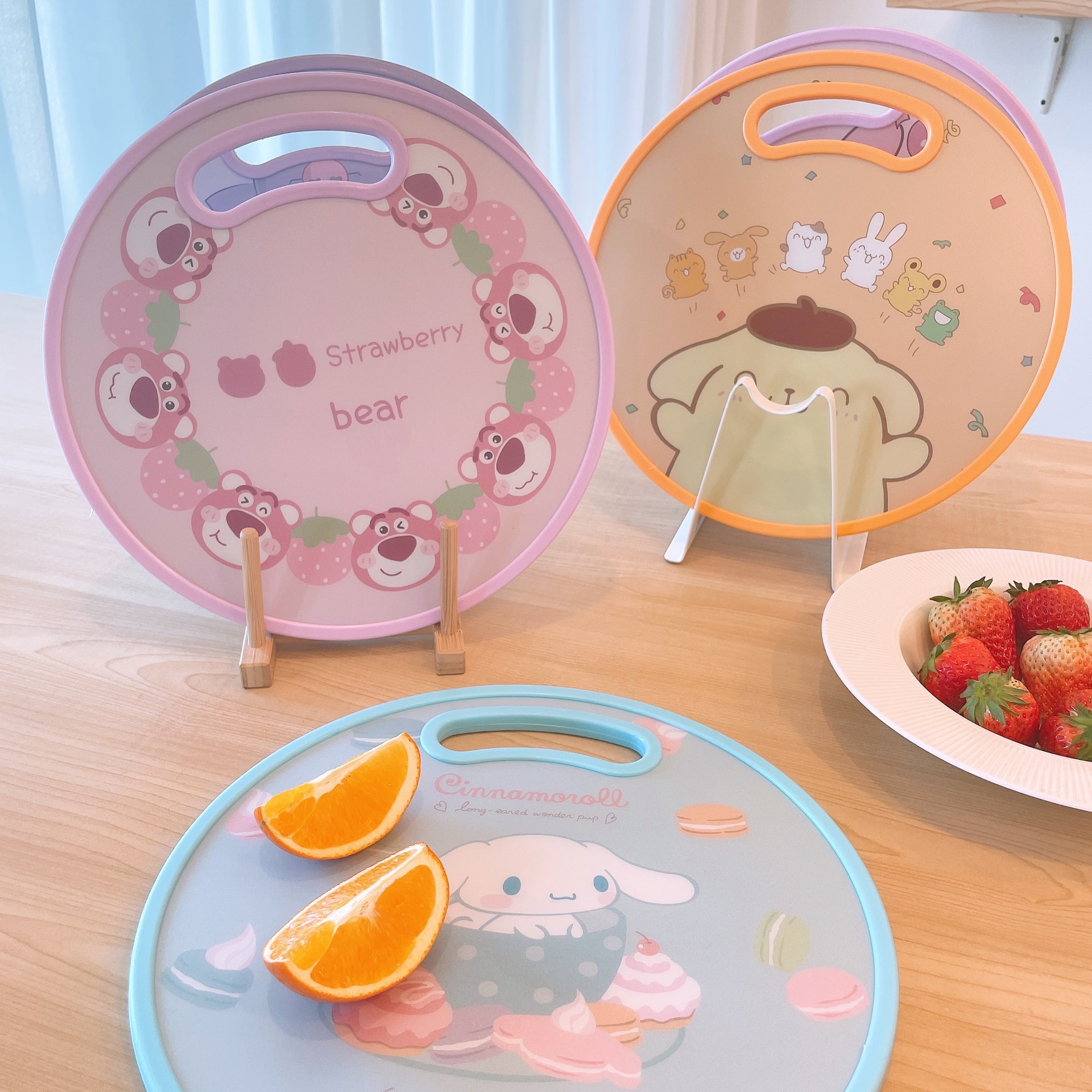 El nuevo dibujo animado kulomi Strawberry Bear Lovely Round Vegetable Board puede cortar la tabla de cortar en el lavabo antidesbordamiento en ambos lados.