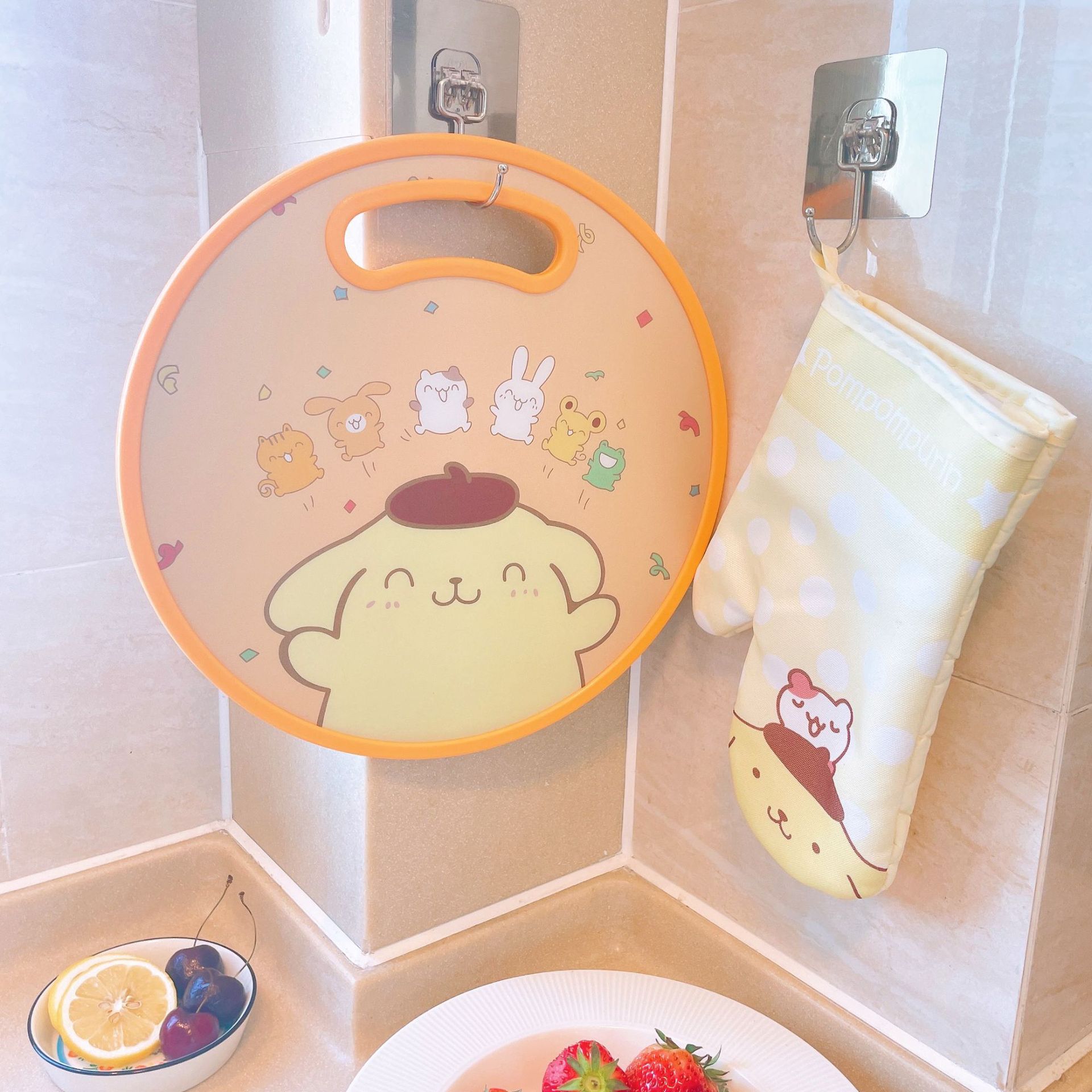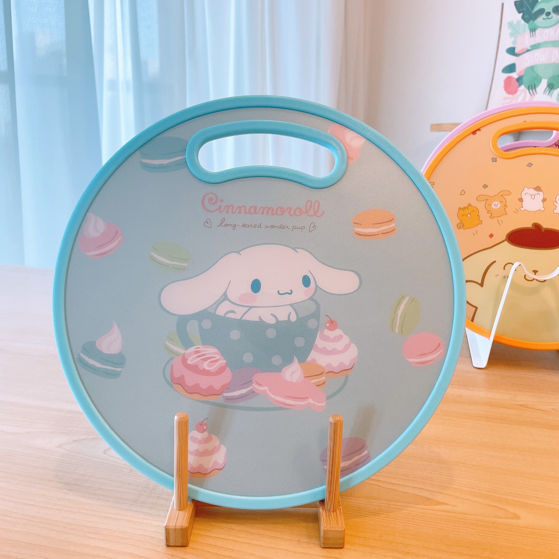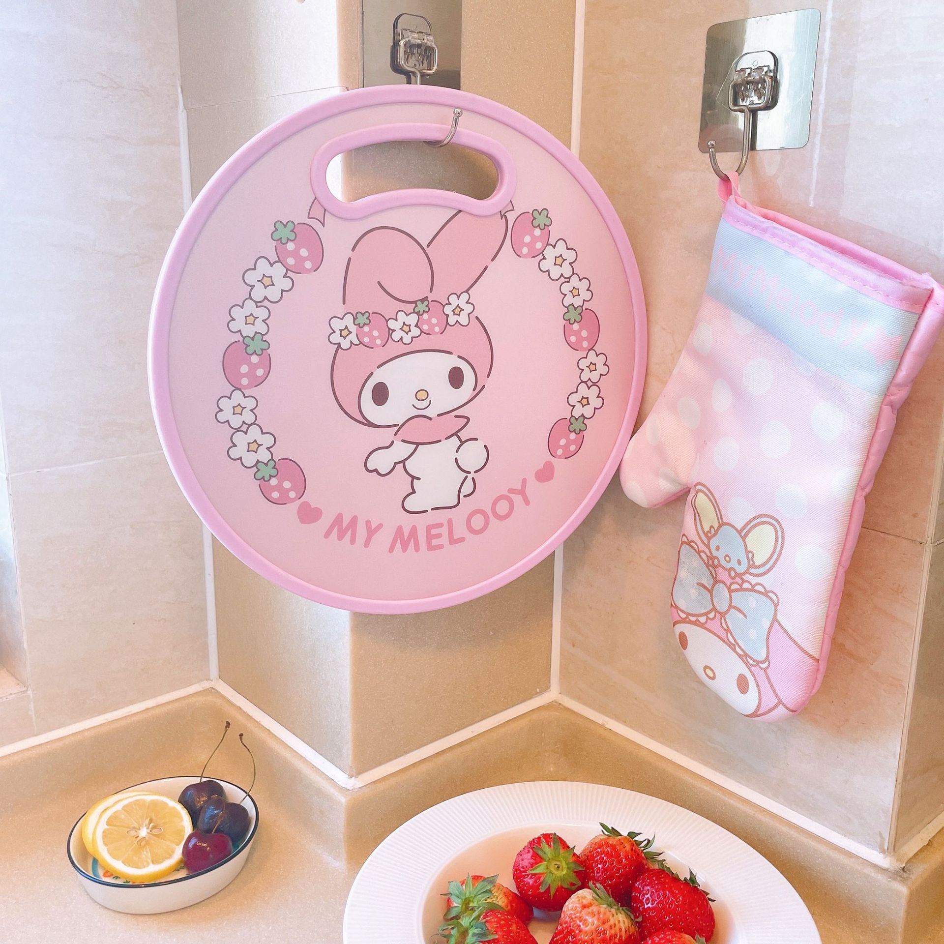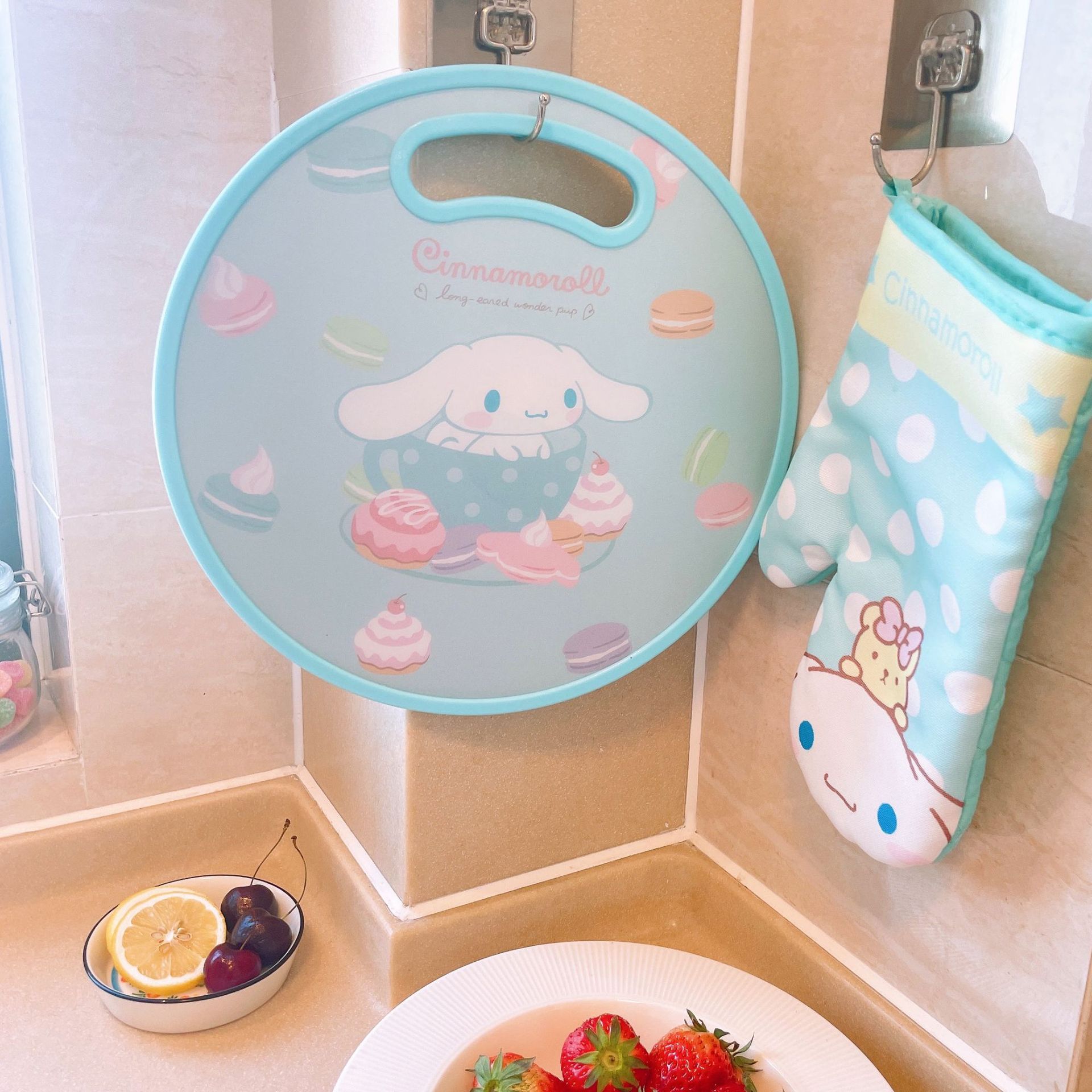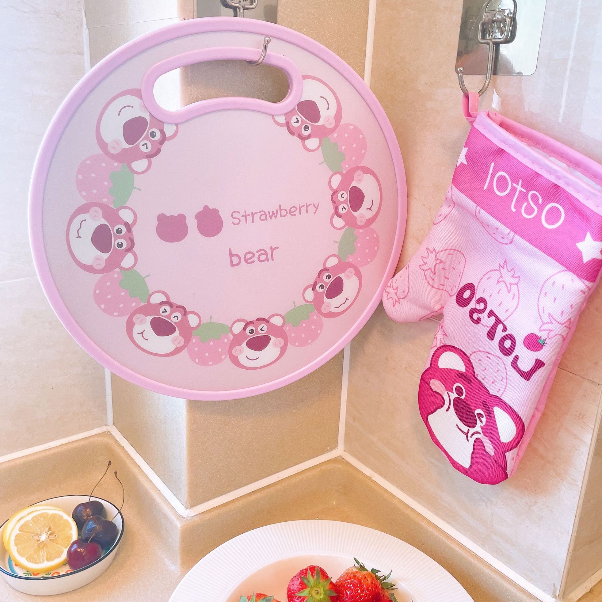 El nuevo dibujo animado kulomi Strawberry Bear Lovely Round Vegetable Board puede cortar la tabla de cortar en el lavabo antidesbordamiento en ambos lados.