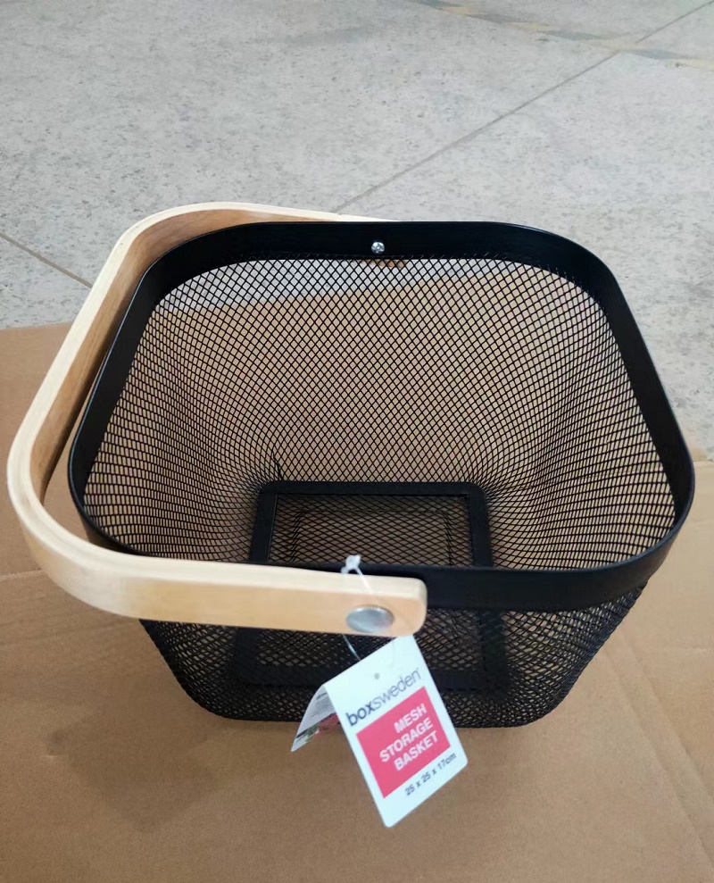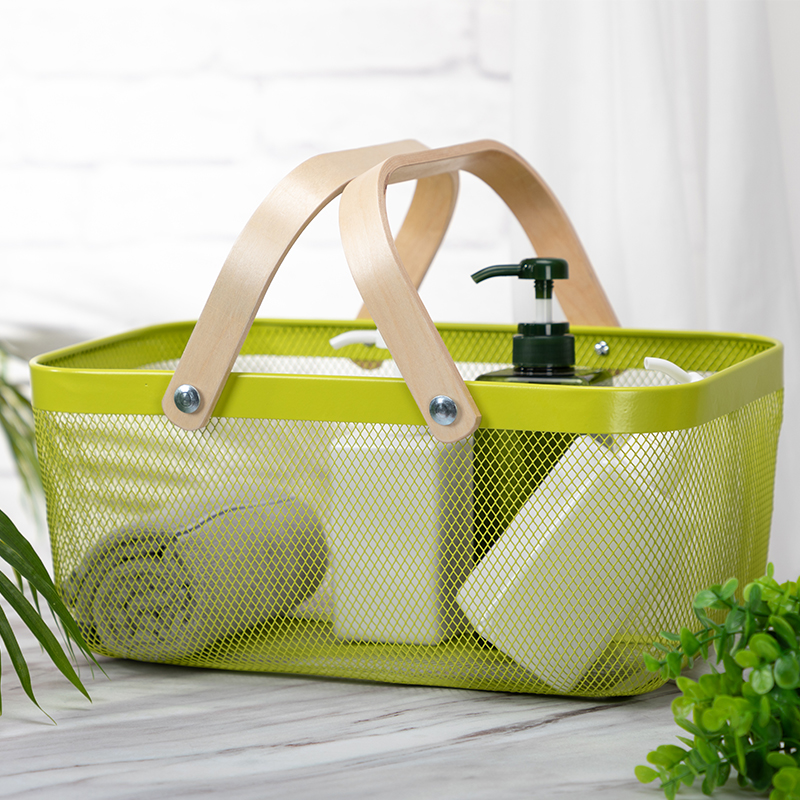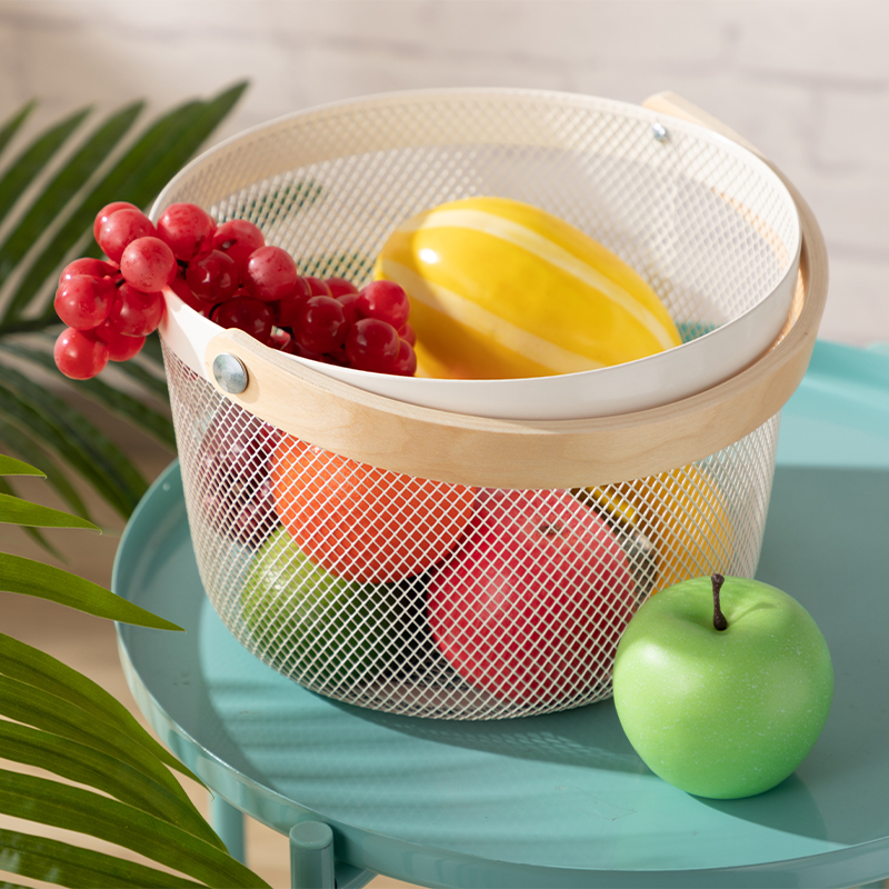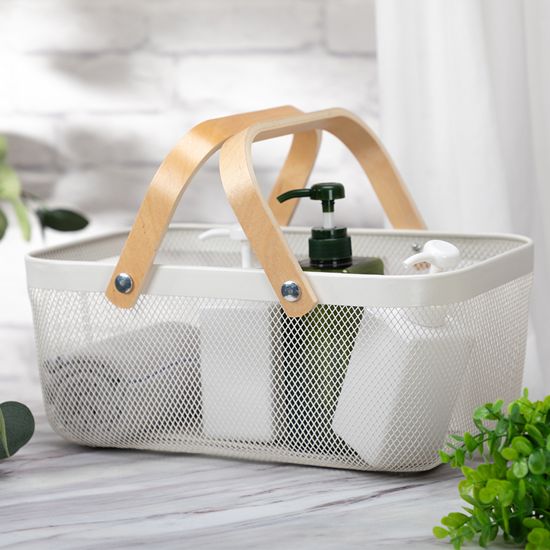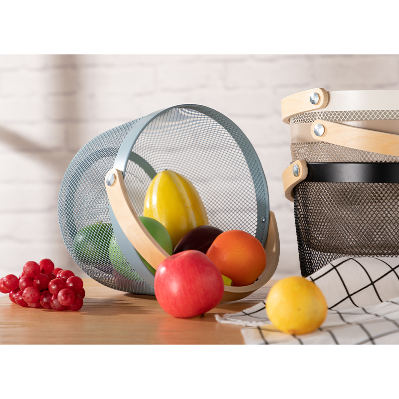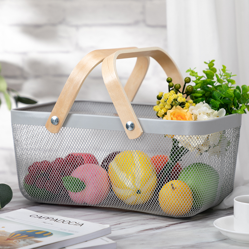 El mango de madera de malla de hierro doméstico contiene cestas de frutas y verduras, cestas de verduras, escombros de mesa, productos para el cuidado de la piel en el dormitorio y cestas de Mano.