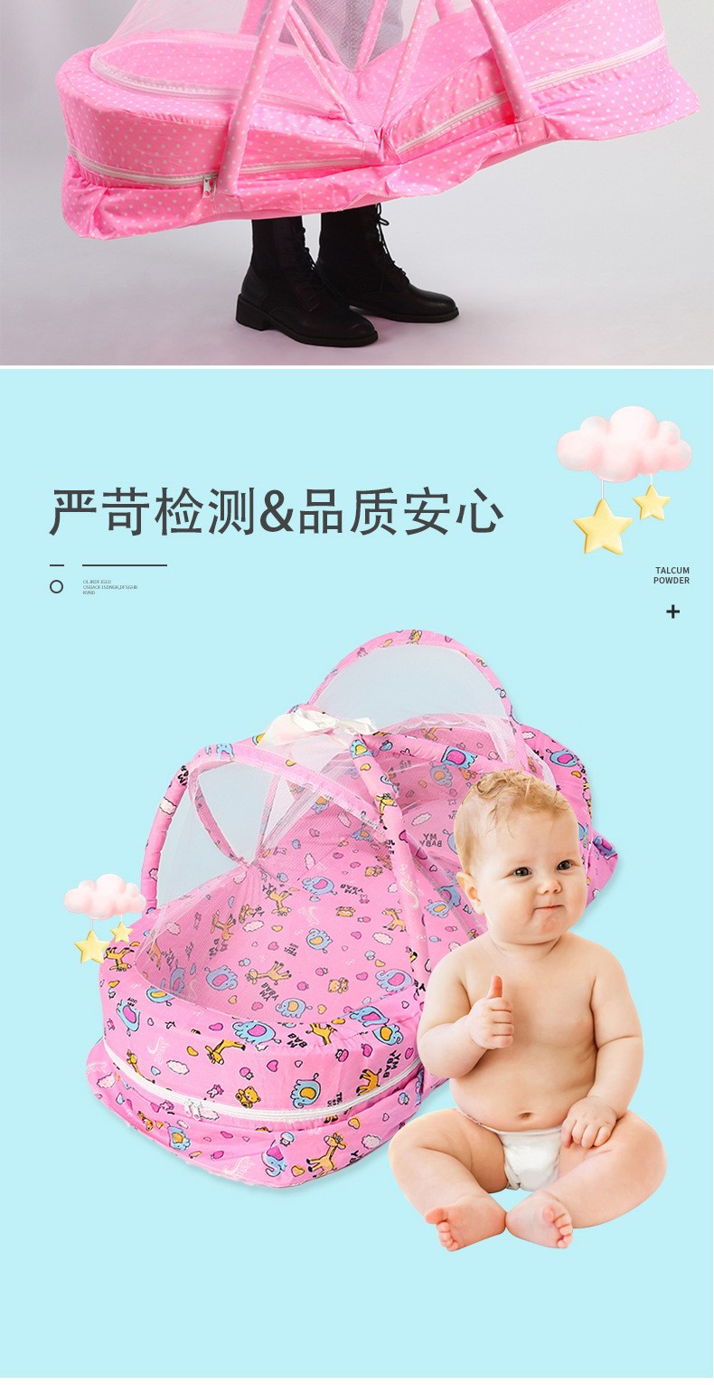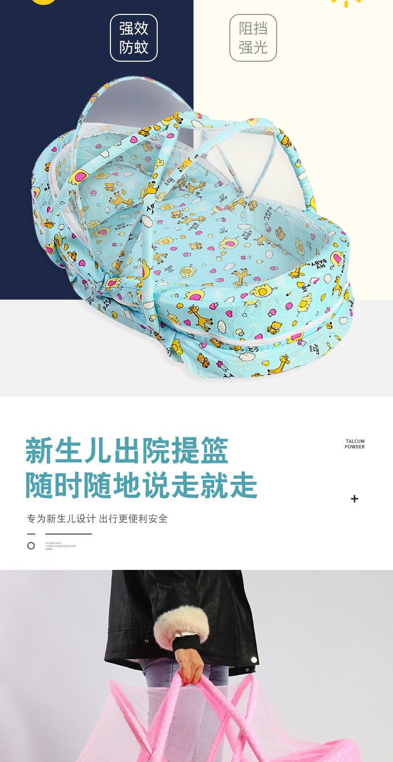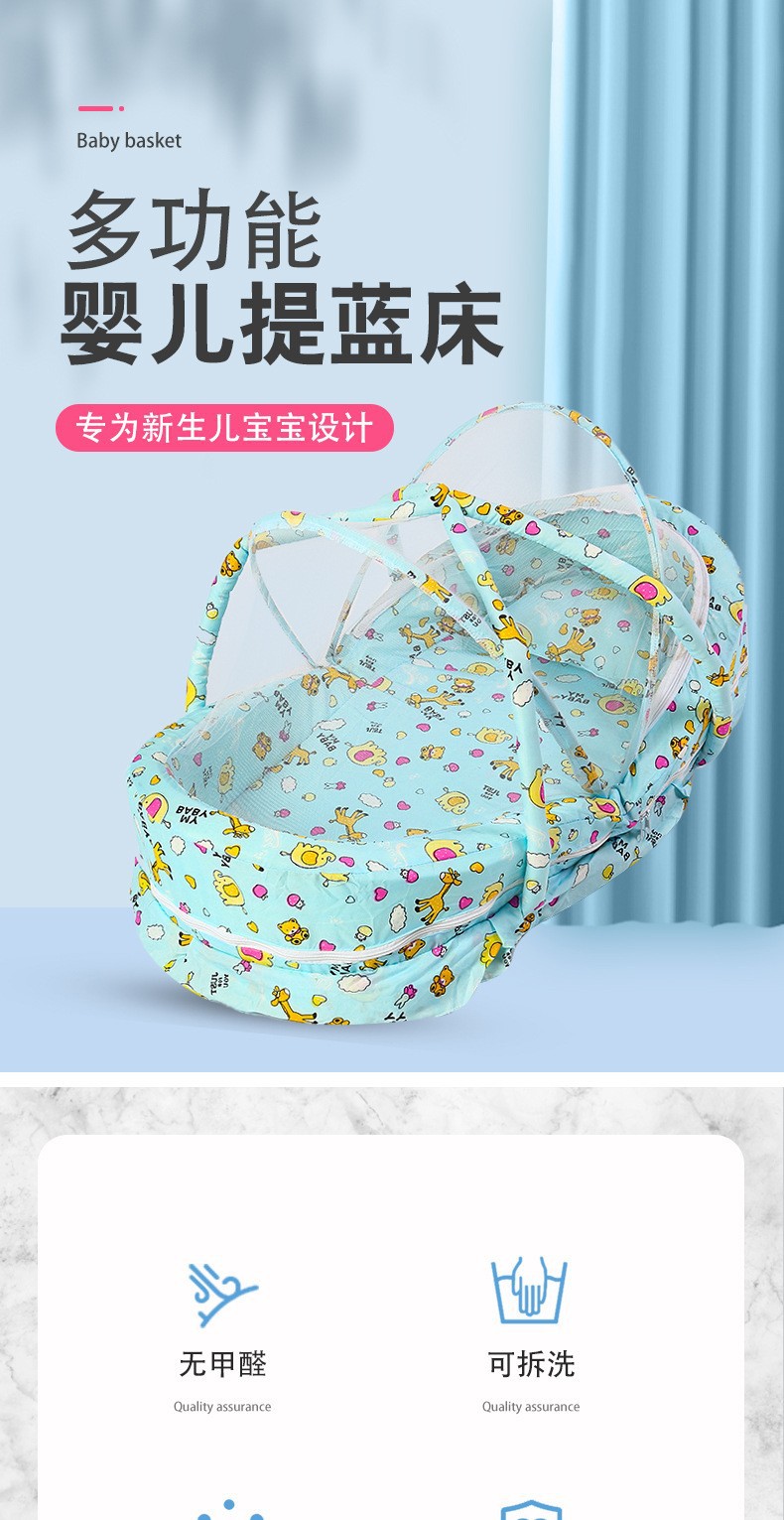La cuna portátil del bebé se puede quitar con mosquiteros. el fabricante viaja con una cesta plegable para la cuna.
